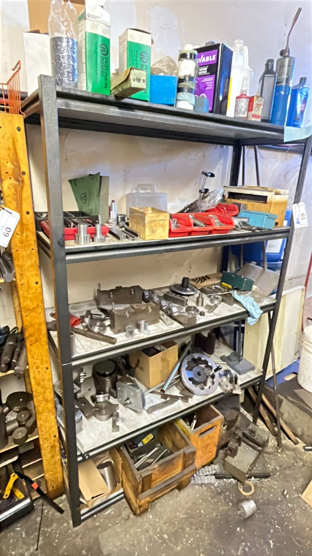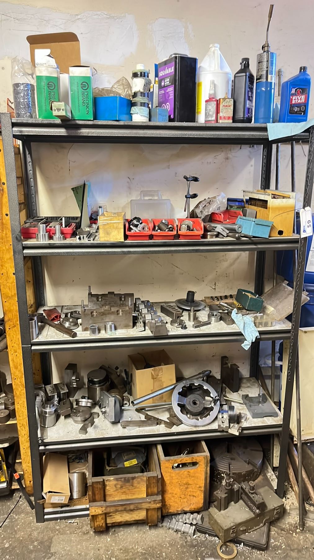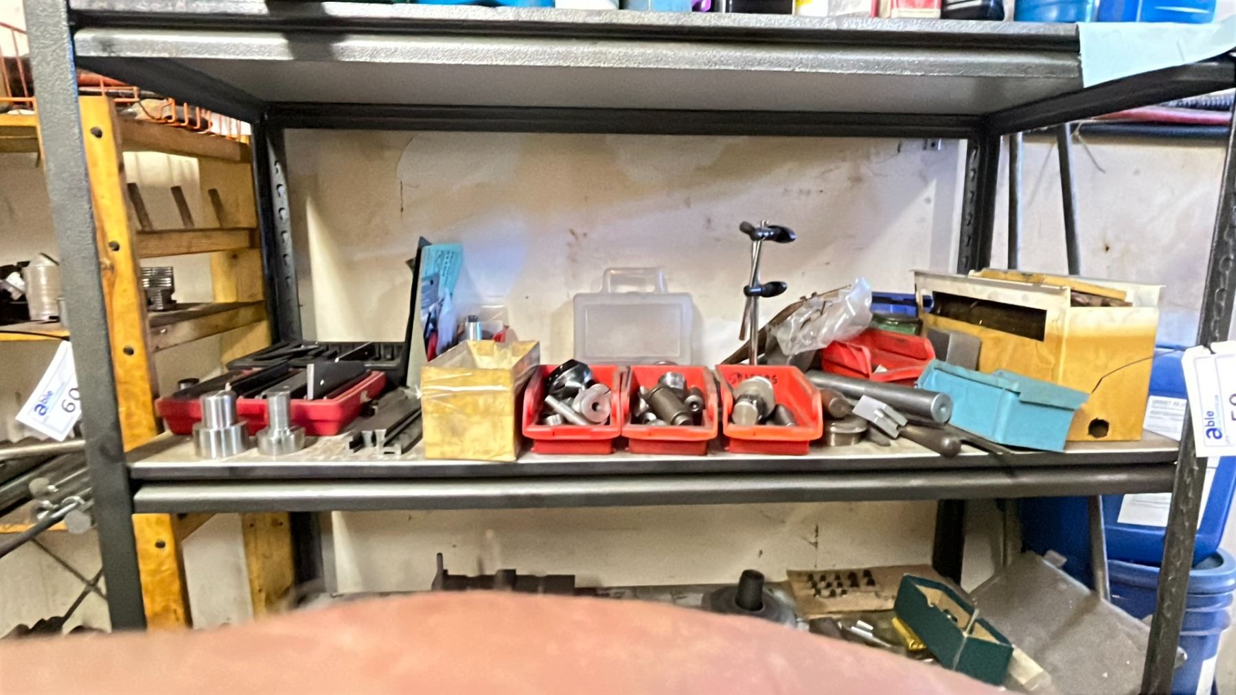 METAL SHELVING UNIT WITH ASSORTED MACHINING PARTS, TOOLING FOR MILLING MACHINES AND LATHES