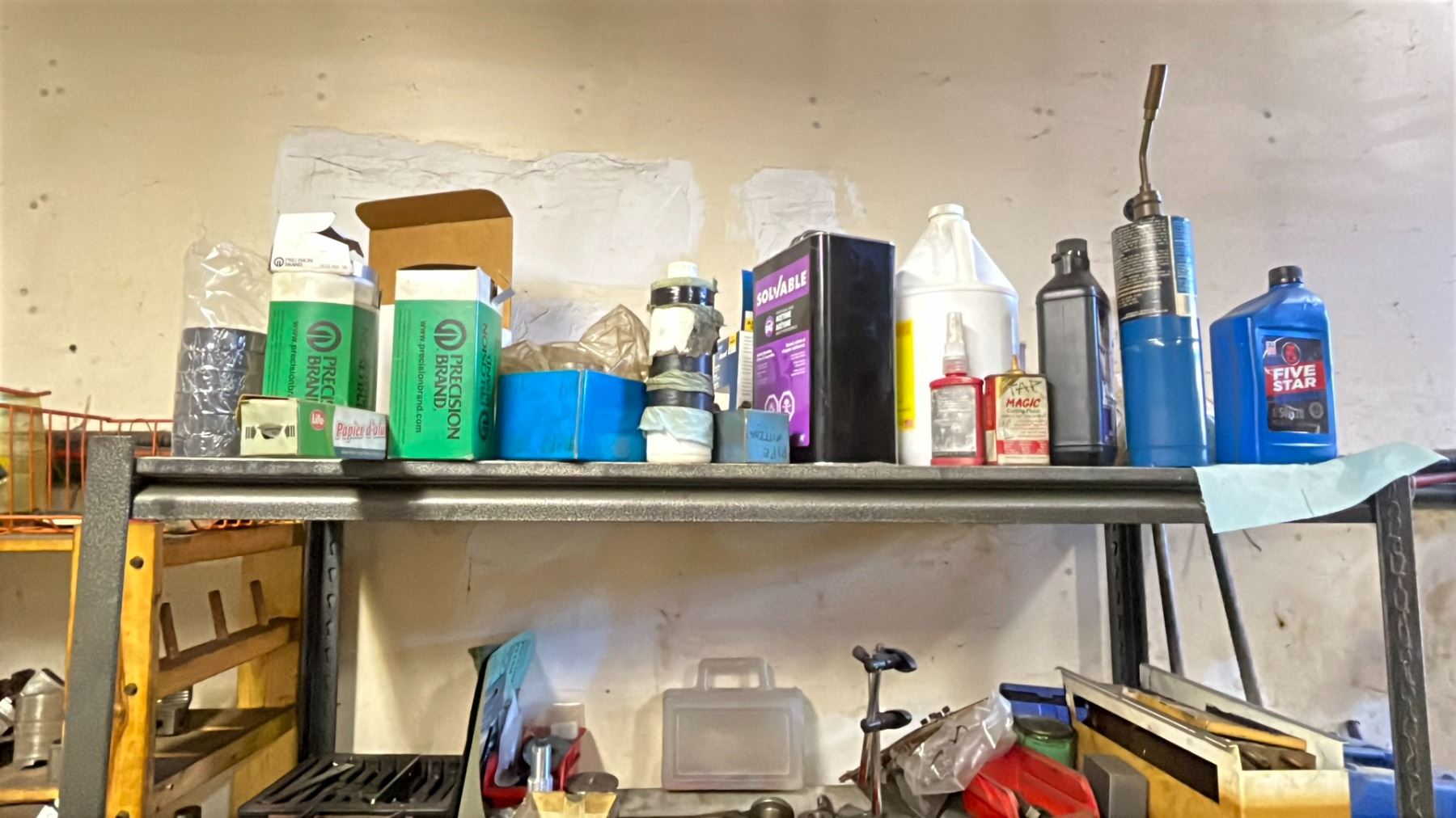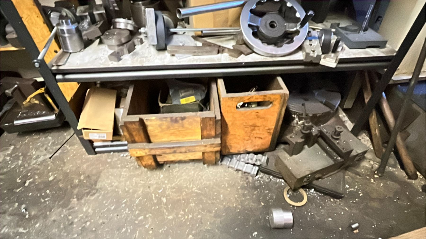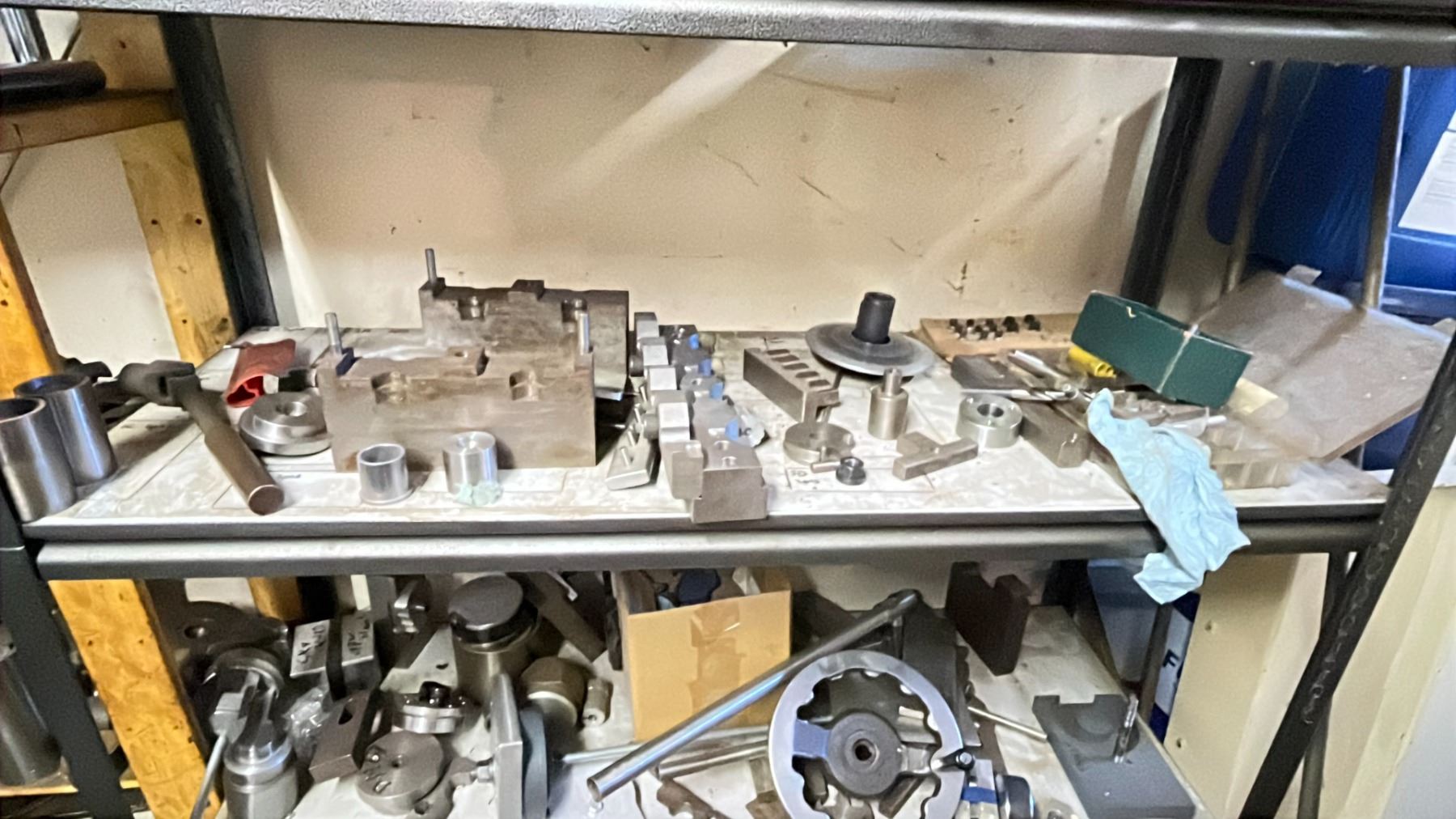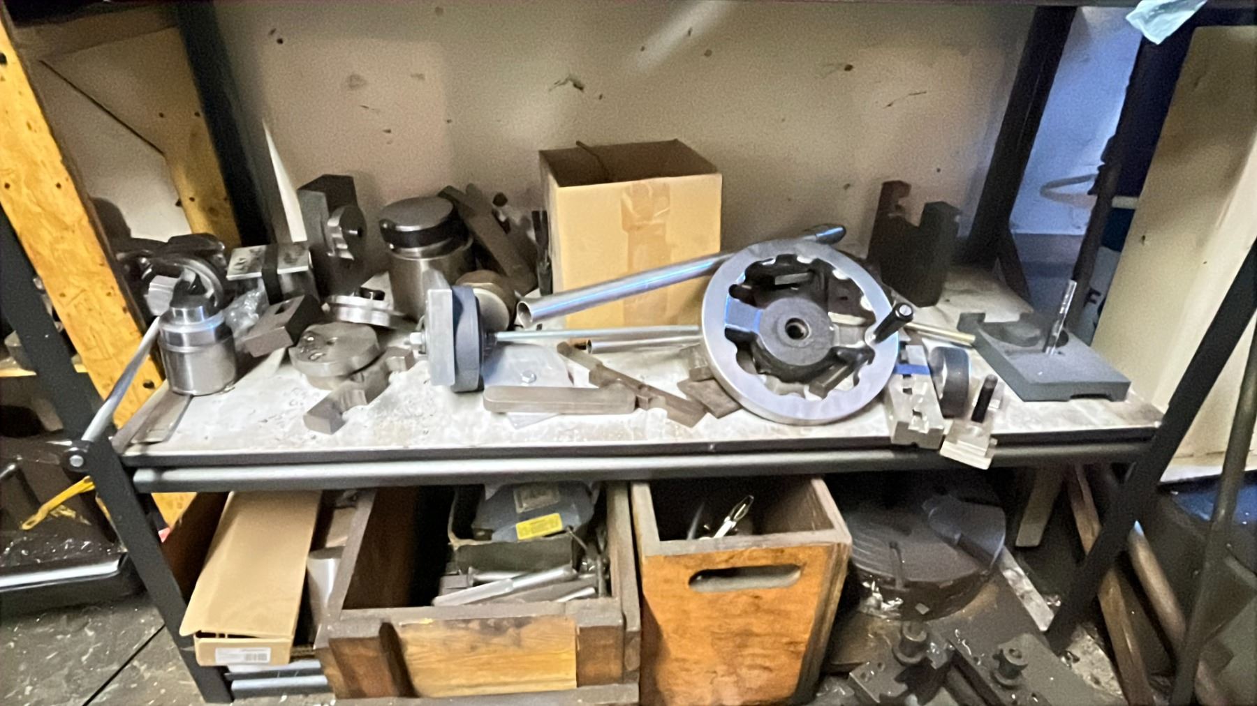 METAL SHELVING UNIT WITH ASSORTED MACHINING PARTS, TOOLING FOR MILLING MACHINES AND LATHES