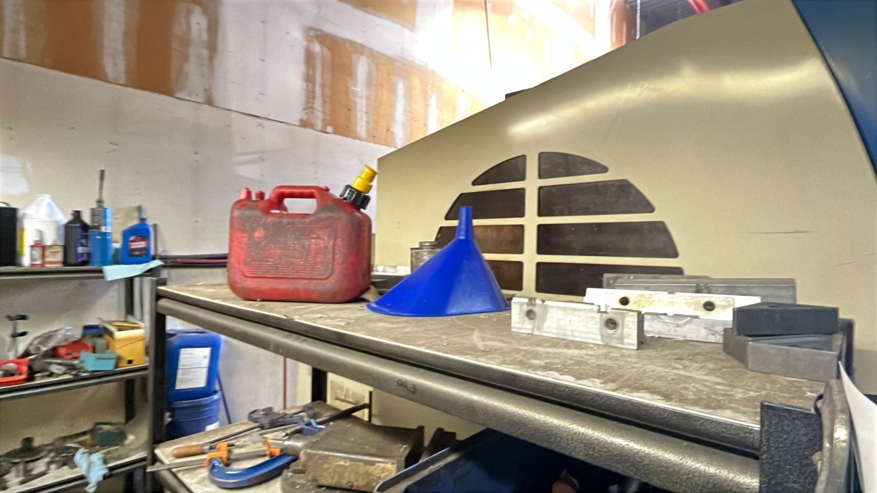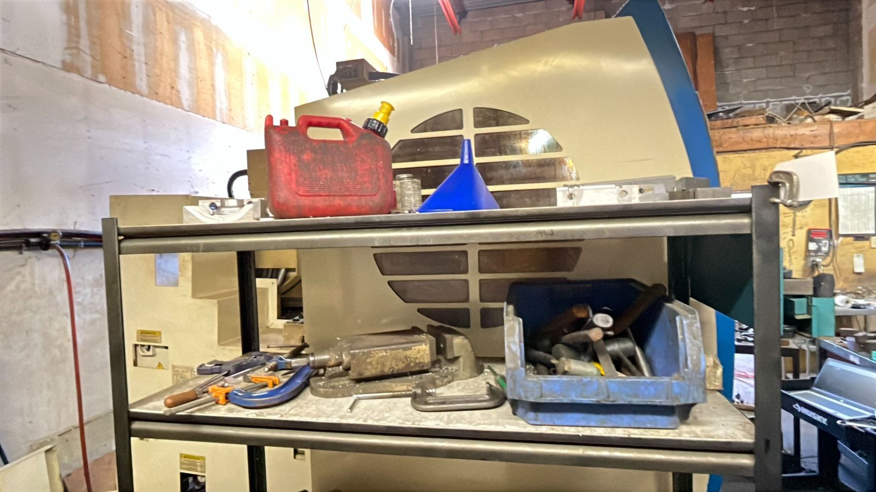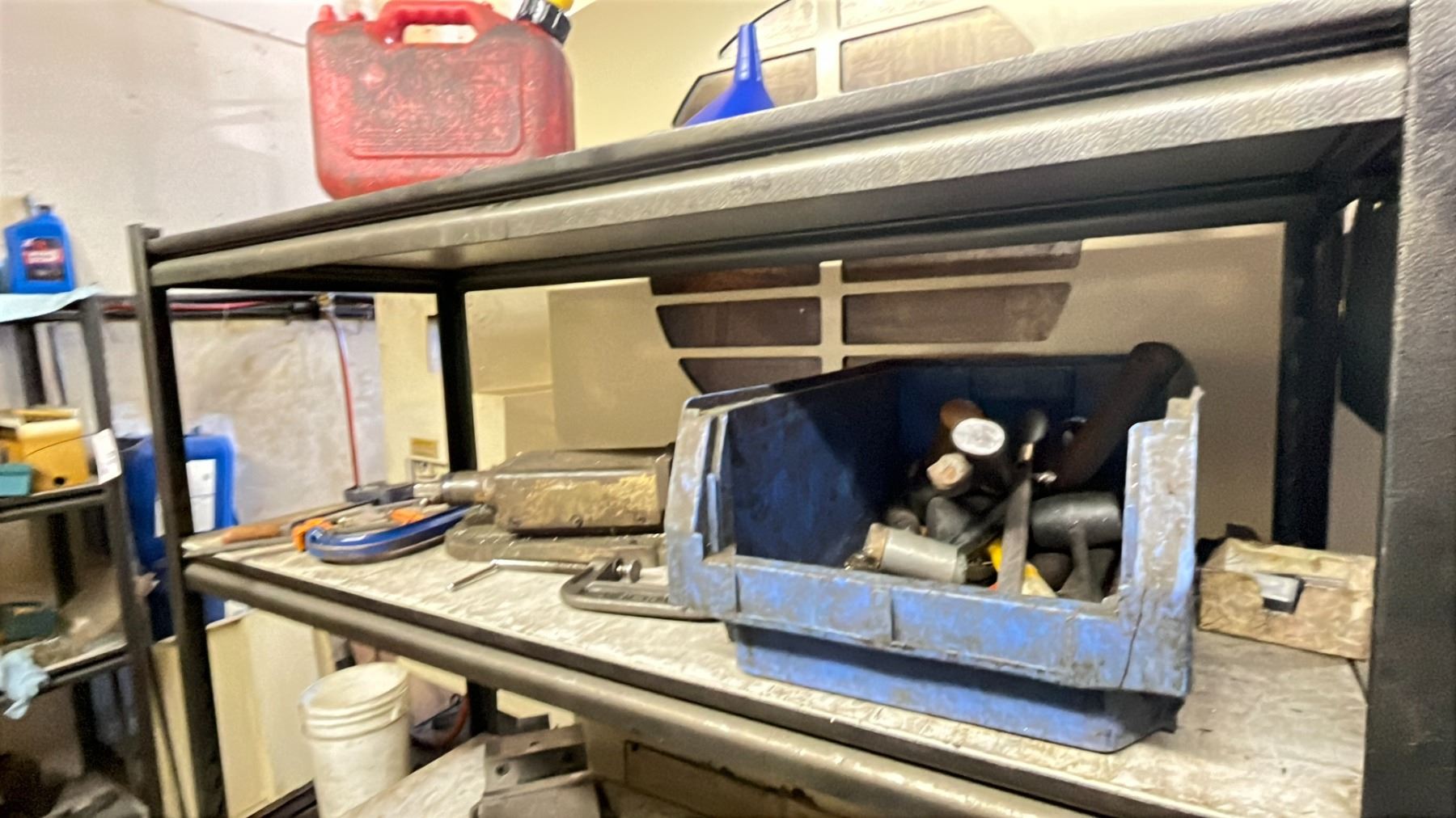 METAL SHELVING UNIT WITH MACHINE CLAMPING SET, ASSORTED TOOLS SHELF IS 6FT HX 5FT W X 1.5 FT D