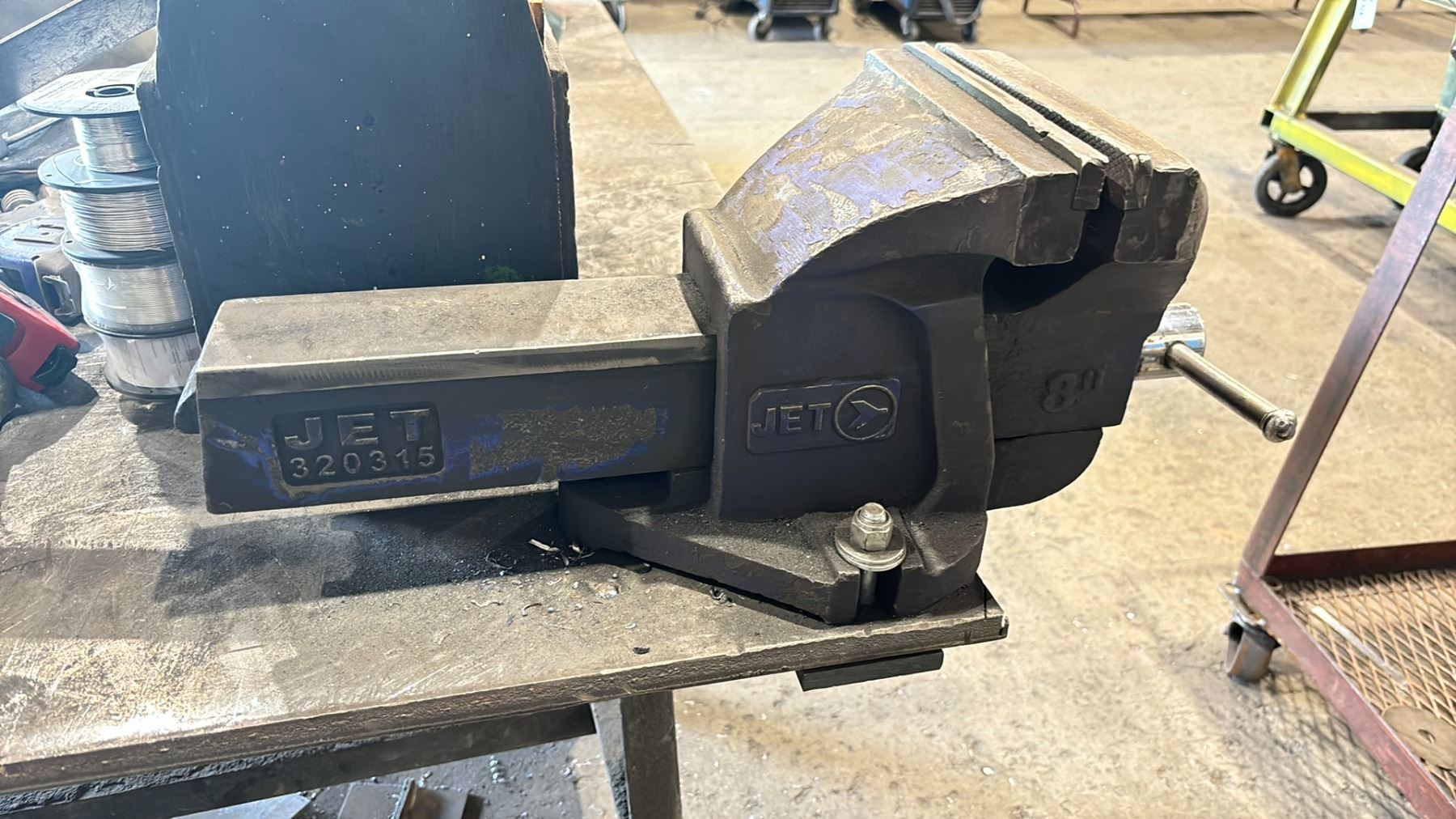 METAL SHOP STEEL SAWHORSE WORK TABLE - 3/4" THICK TOP, APPROX 8FT ACROSS X 4FT WIDE X 2.5FT HIGH **INCLUDES JET 8" BENCH VISE**