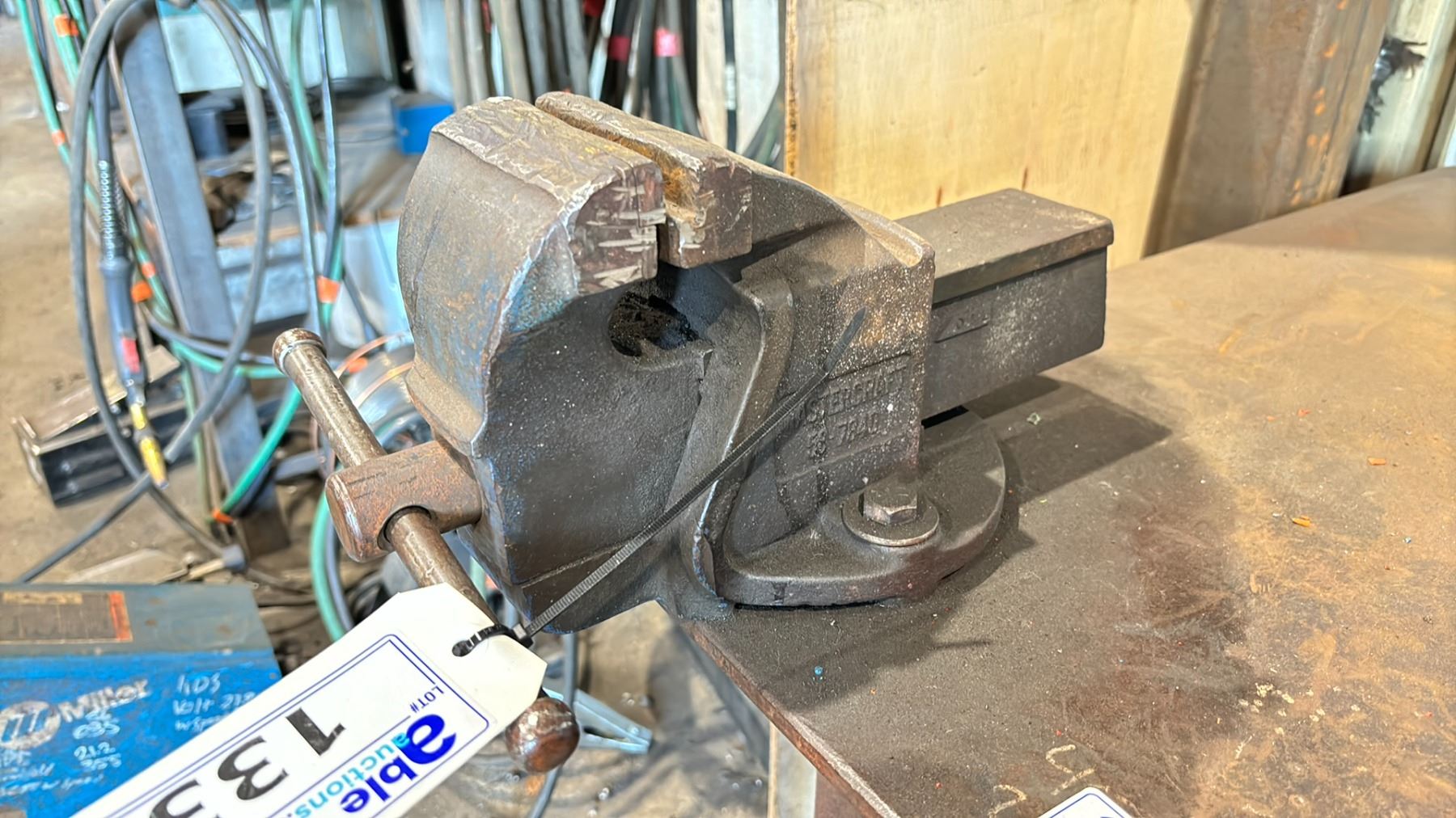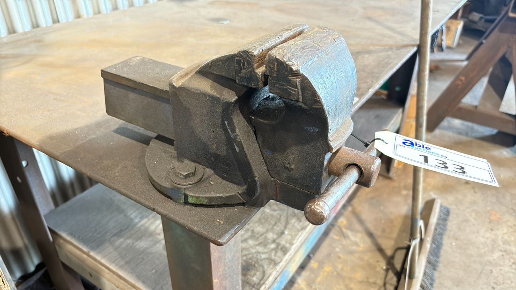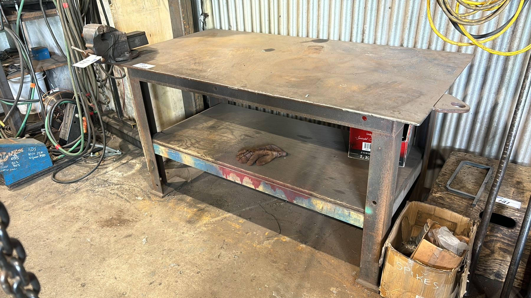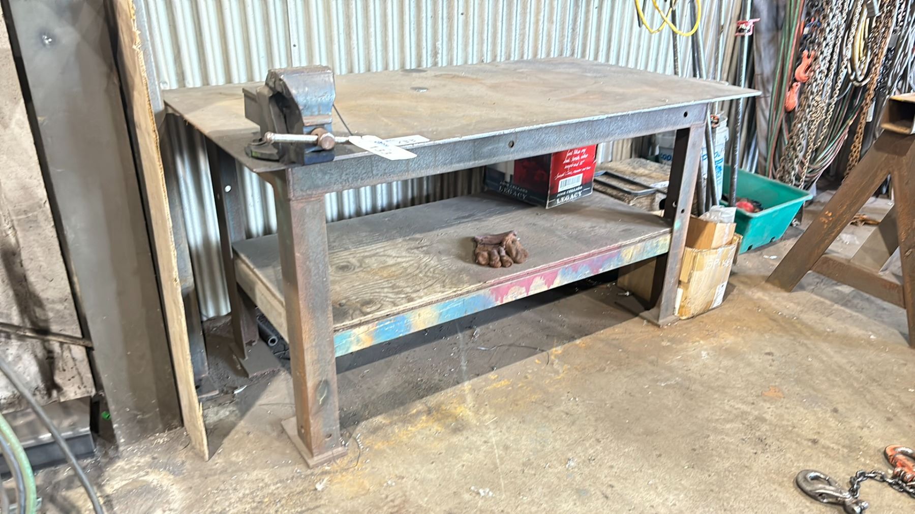 METAL SHOP STEEL WORK TABLE - 1/4" THICK TOP, APPROX 5FT ACROSS X 2.5FT WIDE X 2.5FT HIGH **INCLUDES MASTERCRAFT BENCH VISE**