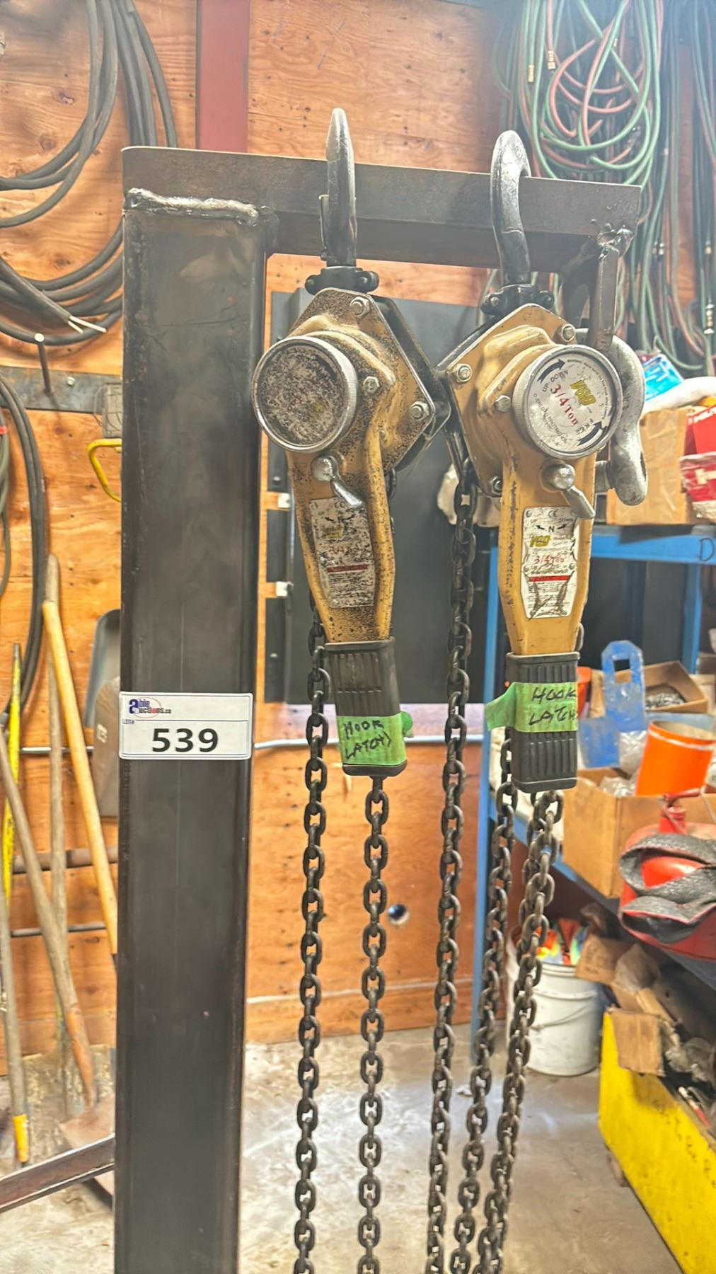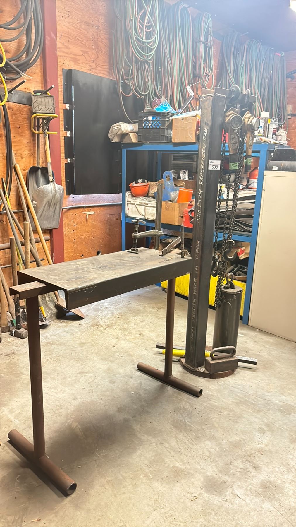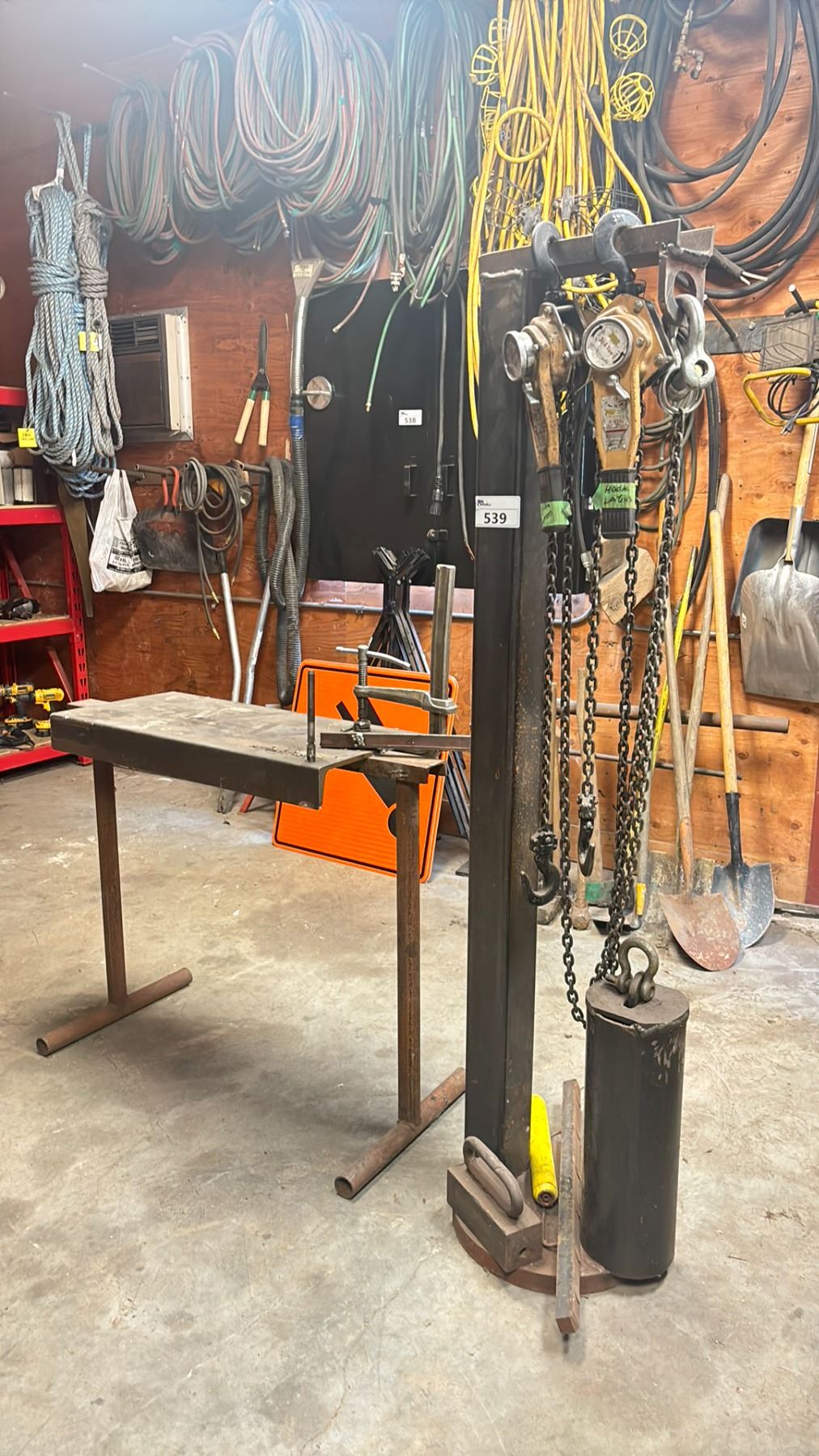 METAL STAND WITH 2 LEVER CHAIN HOISTS & A METAL MACHINE STAND