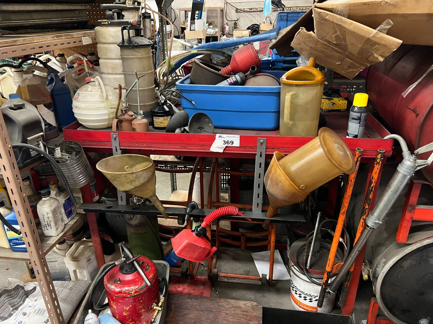 METAL STORAGE RACK WITH OIL CHANGE EQUIPMENT. VACUUM OIL PUMPS, SPOUTS, 2 DOLLIES FOR 45 GALLON DRUMS, ETC