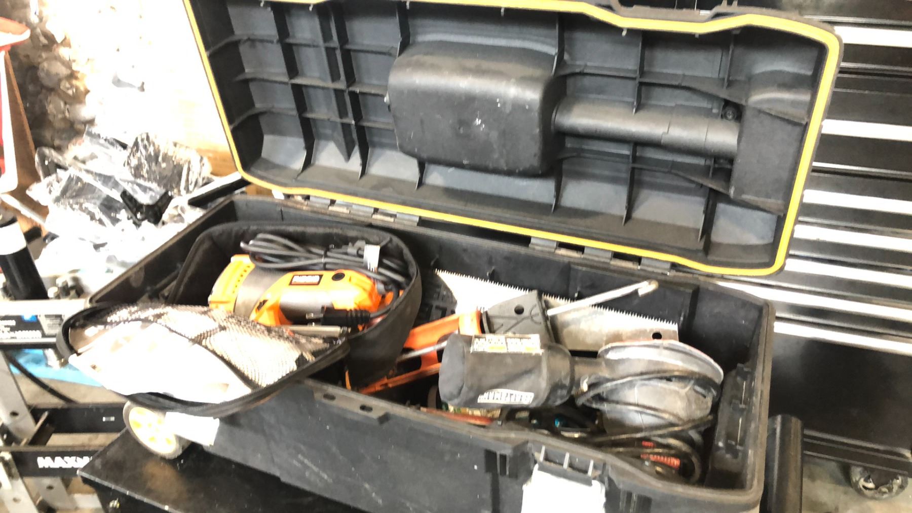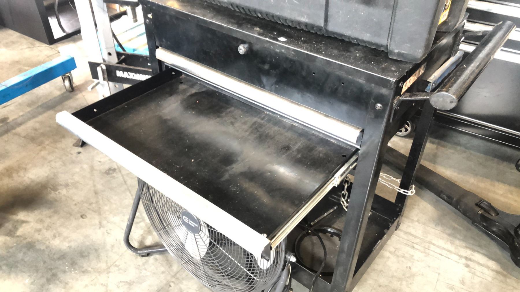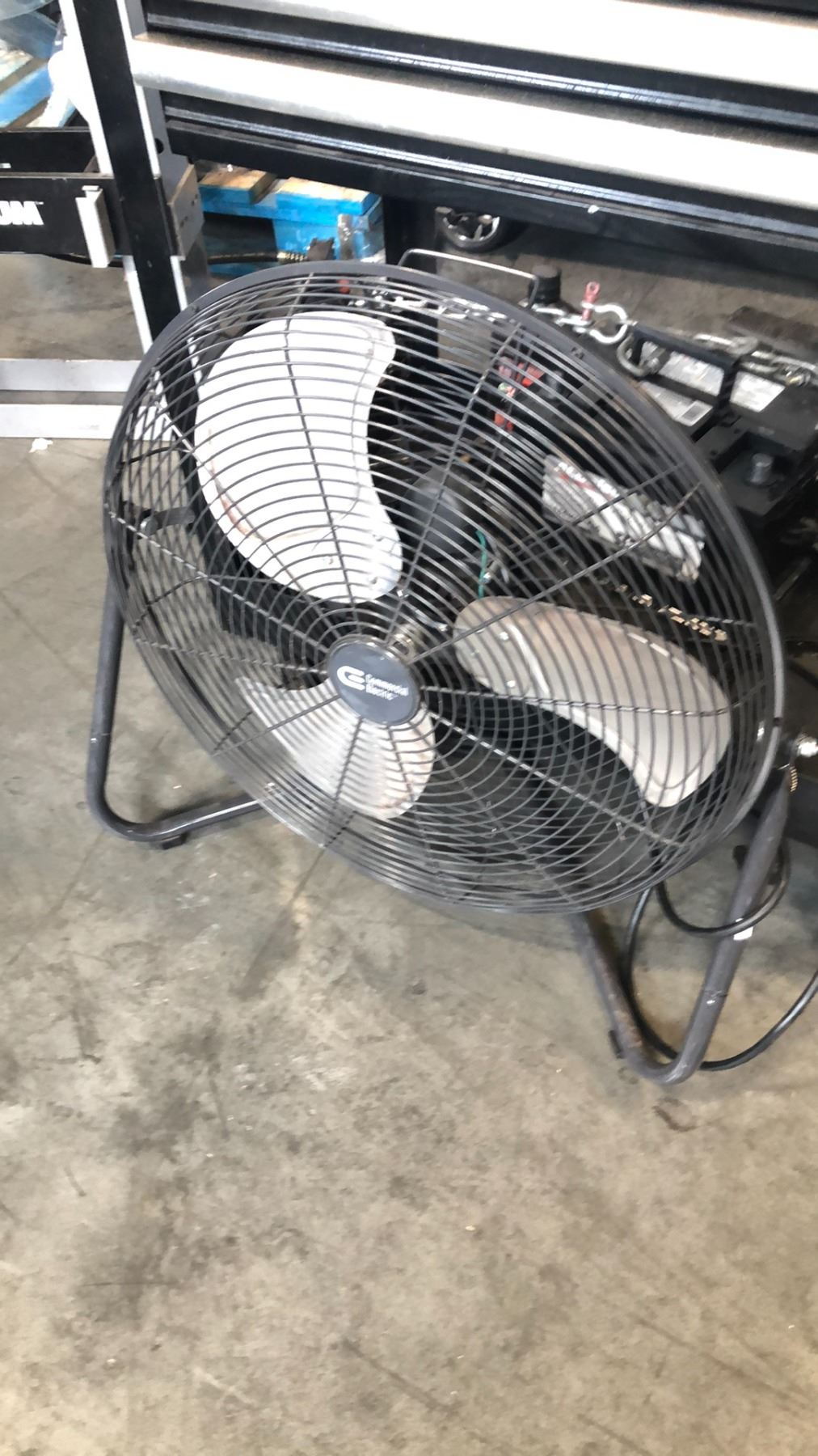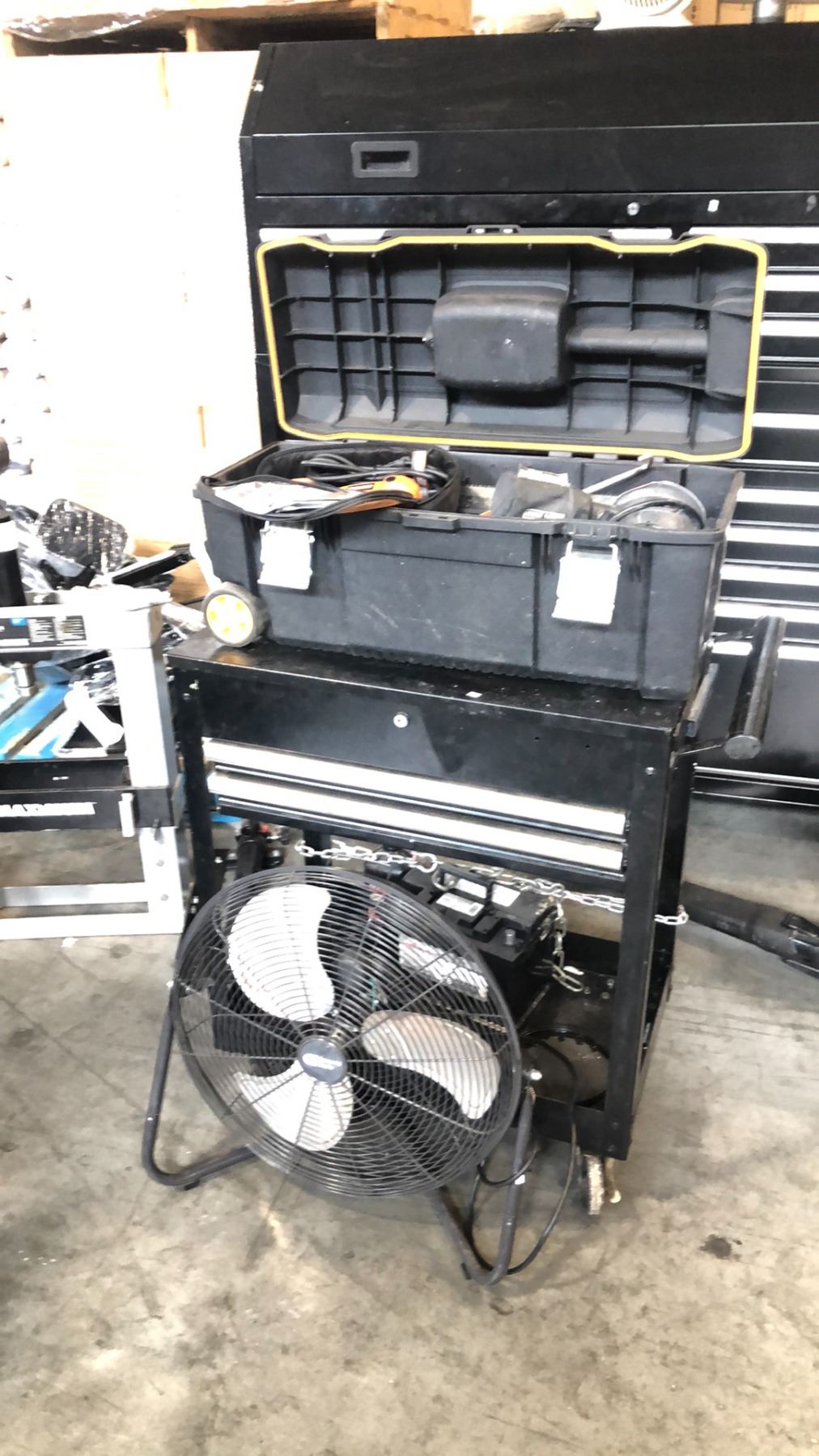 METAL TOOL CART, ACDELCO AGM BATTERY, DEWALT PLASTIC TOOL BOX W/ TOOLS AND METAL COMMERCIAL ELECTRIC FAN