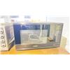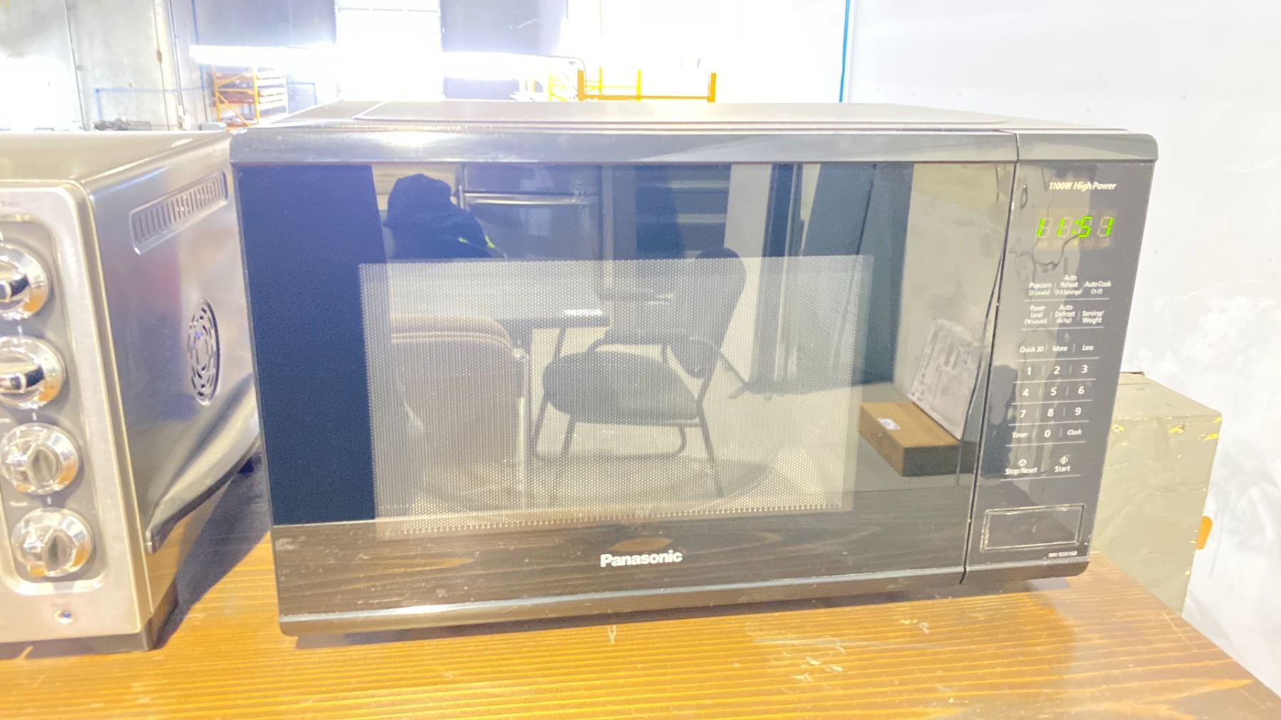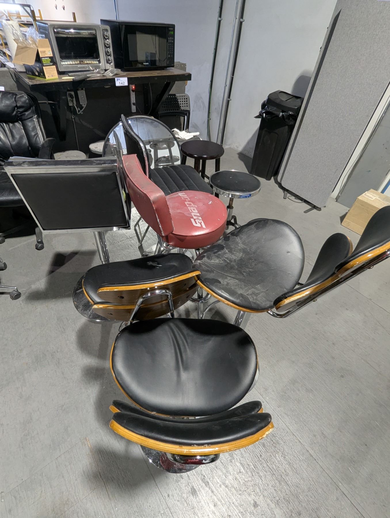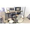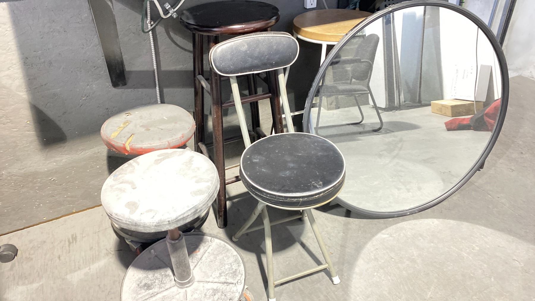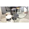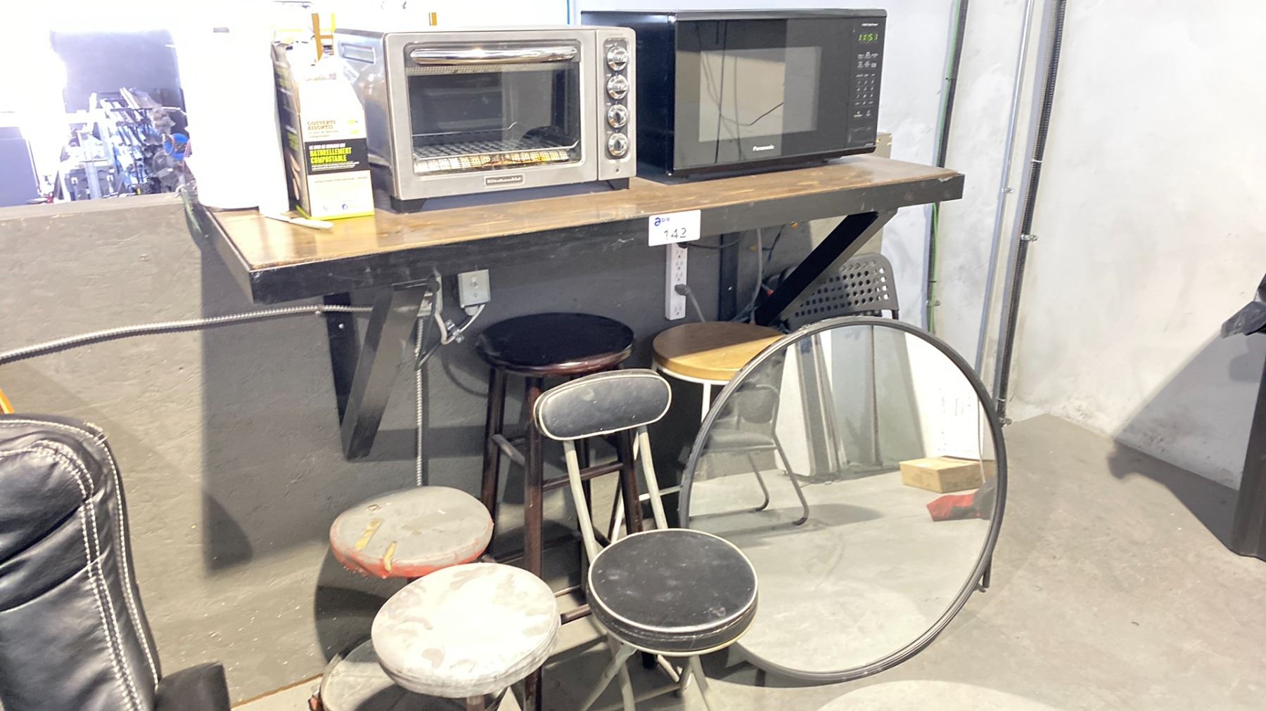 METAL WALL MOUNT COUNTER WITH ASSORTED CHAIRS, MIRROR, TOASTER OVEN AND MICROWAVE