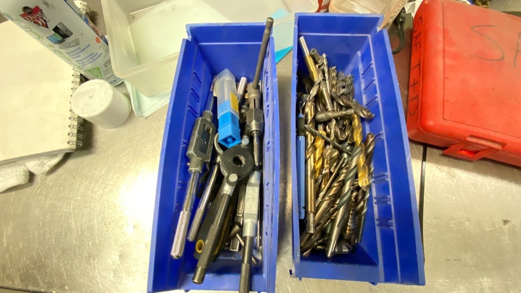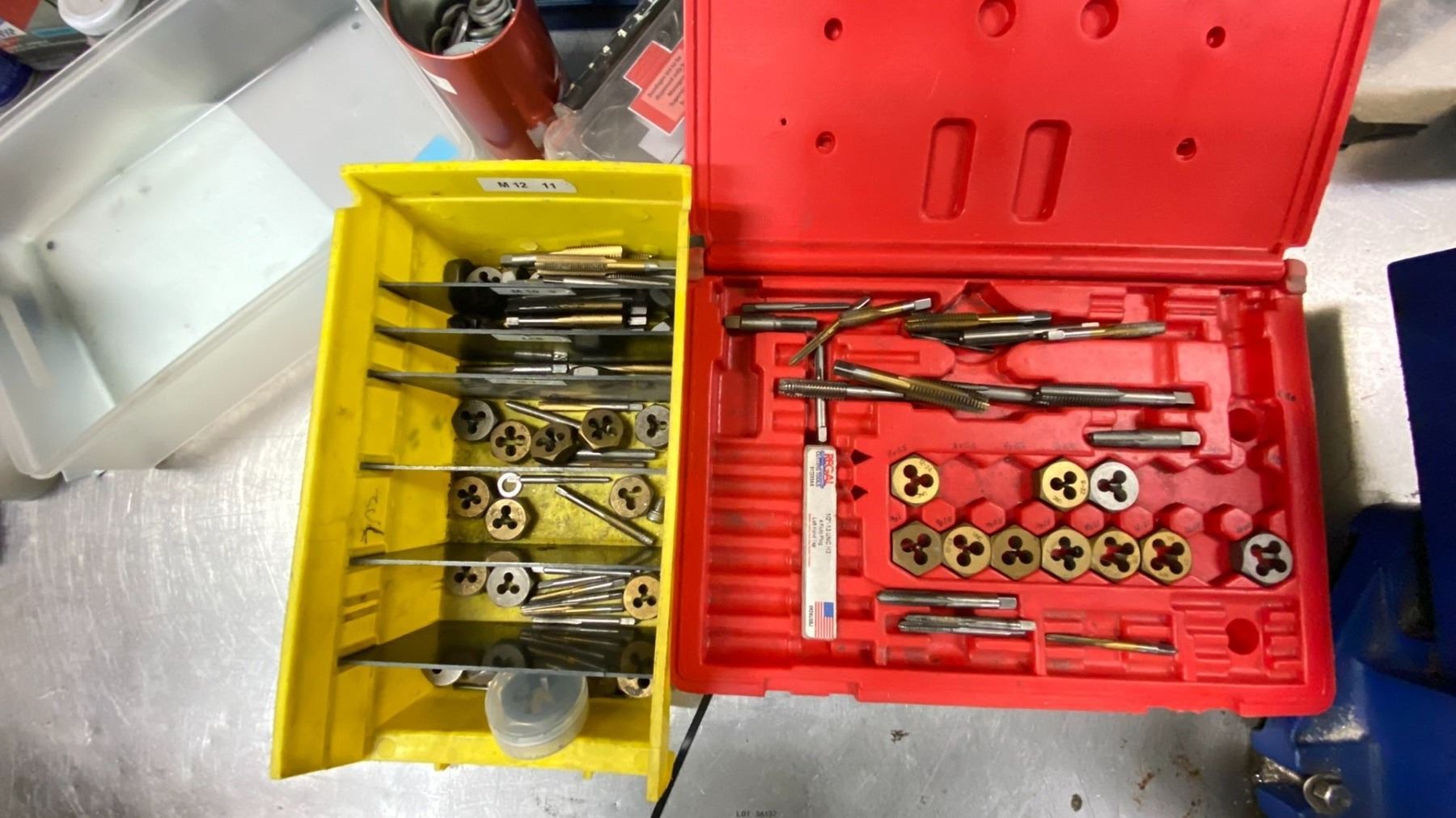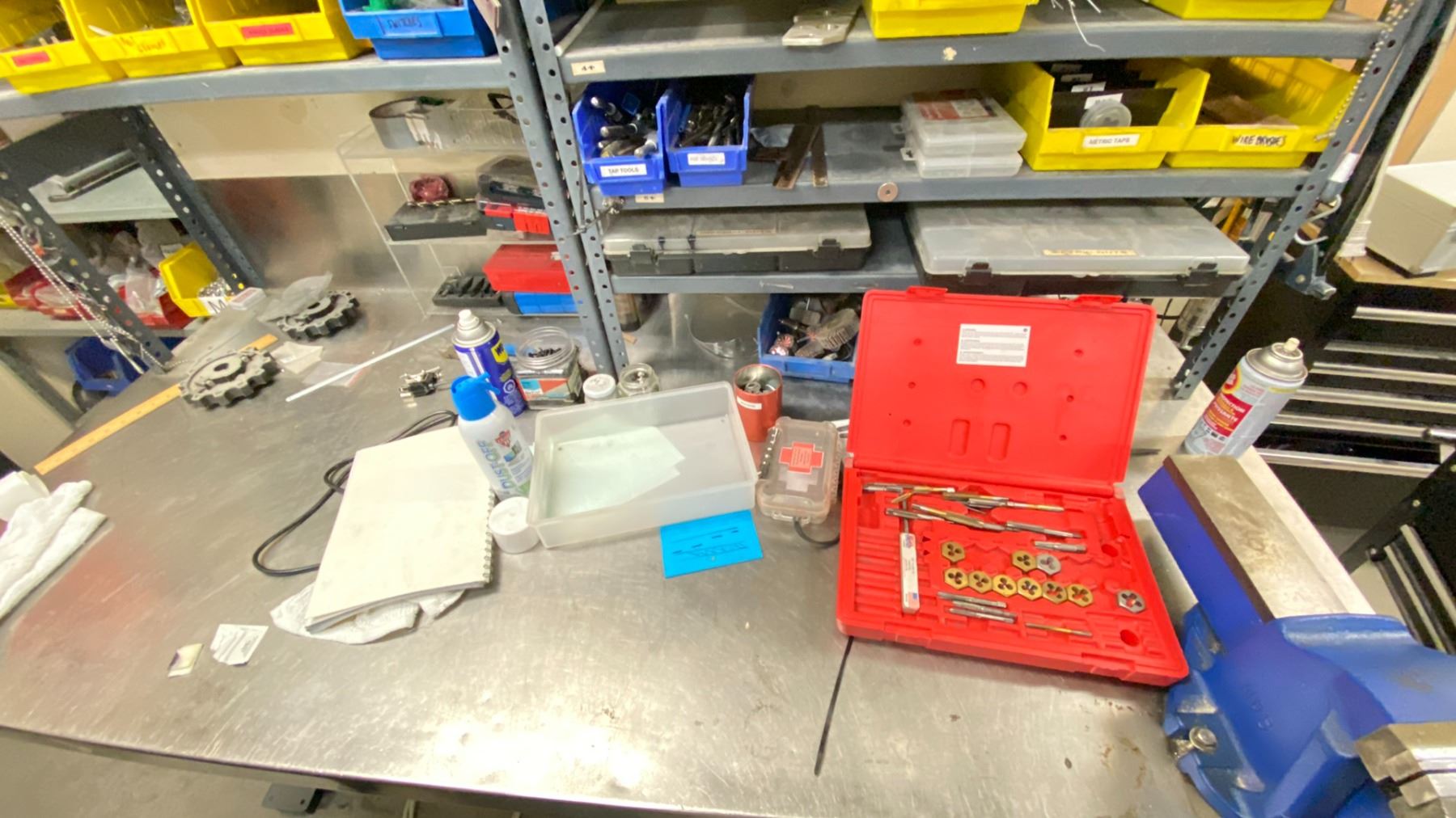 METAL WORK BENCH 6'6"X3' WITH 6" VISE INC CONTENTS. TAP AND DIE SET, METRIC AND SAE NUTS AND WASHERS, ASST PARTS, DRILL INDEXES, CLAMPS, LAMP, LIGHT, PLASTIC BINS, 30" BAR CLAMP, TWO CROWBARS, ETC ETC