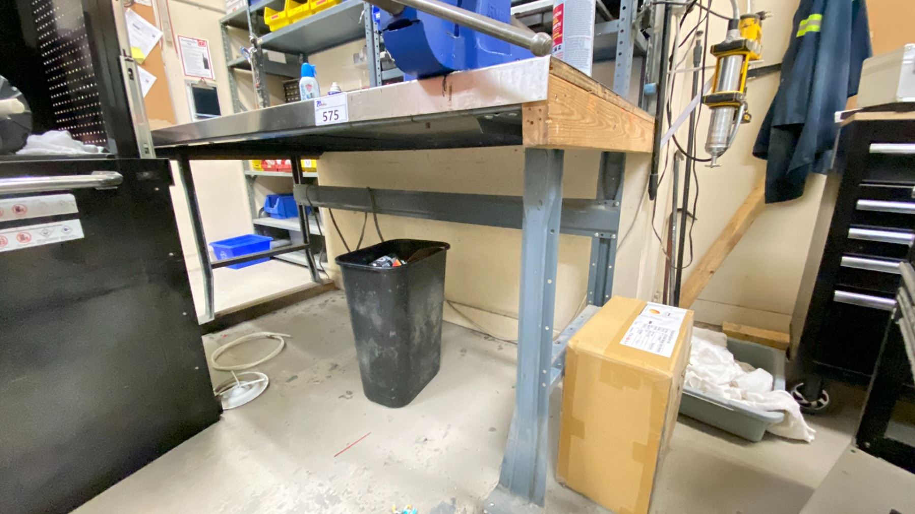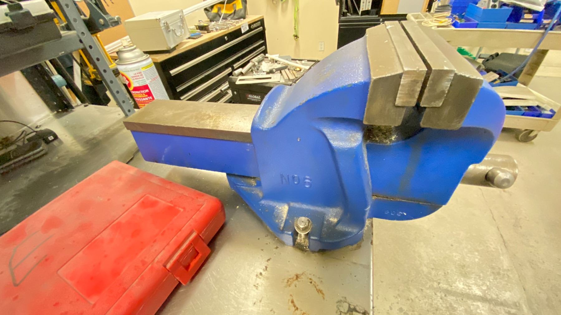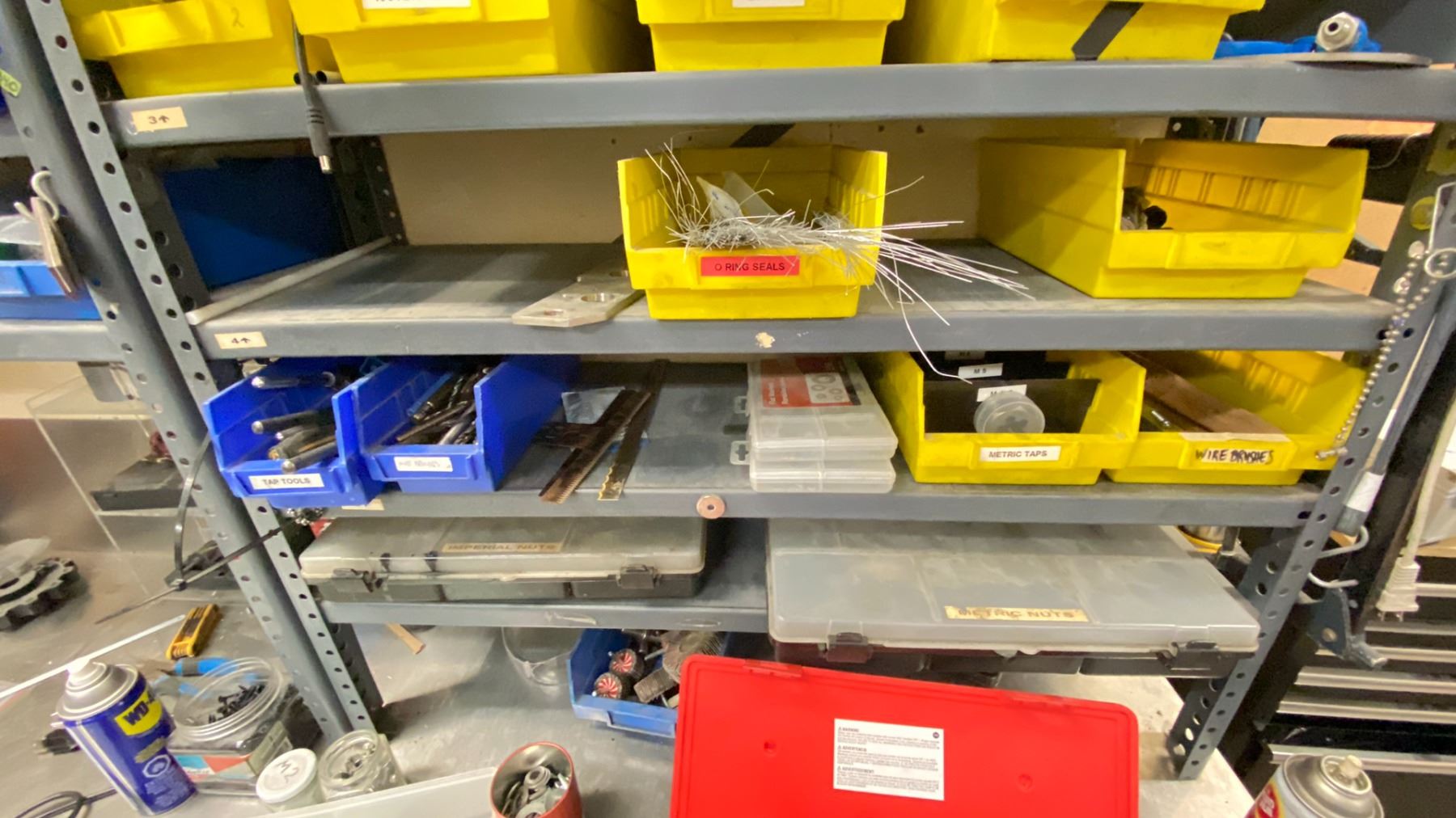 METAL WORK BENCH 6'6"X3' WITH 6" VISE INC CONTENTS. TAP AND DIE SET, METRIC AND SAE NUTS AND WASHERS, ASST PARTS, DRILL INDEXES, CLAMPS, LAMP, LIGHT, PLASTIC BINS, 30" BAR CLAMP, TWO CROWBARS, ETC ETC