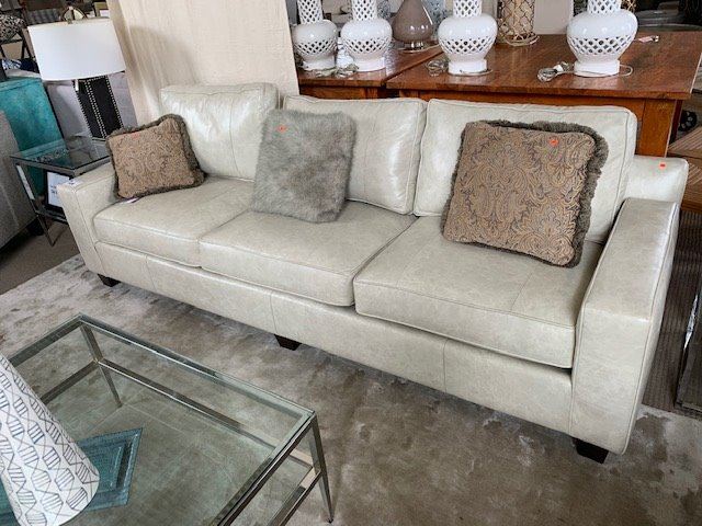 METRO CREAM LEATHER 3 SEAT SOFA WITH THROW PILLOWS