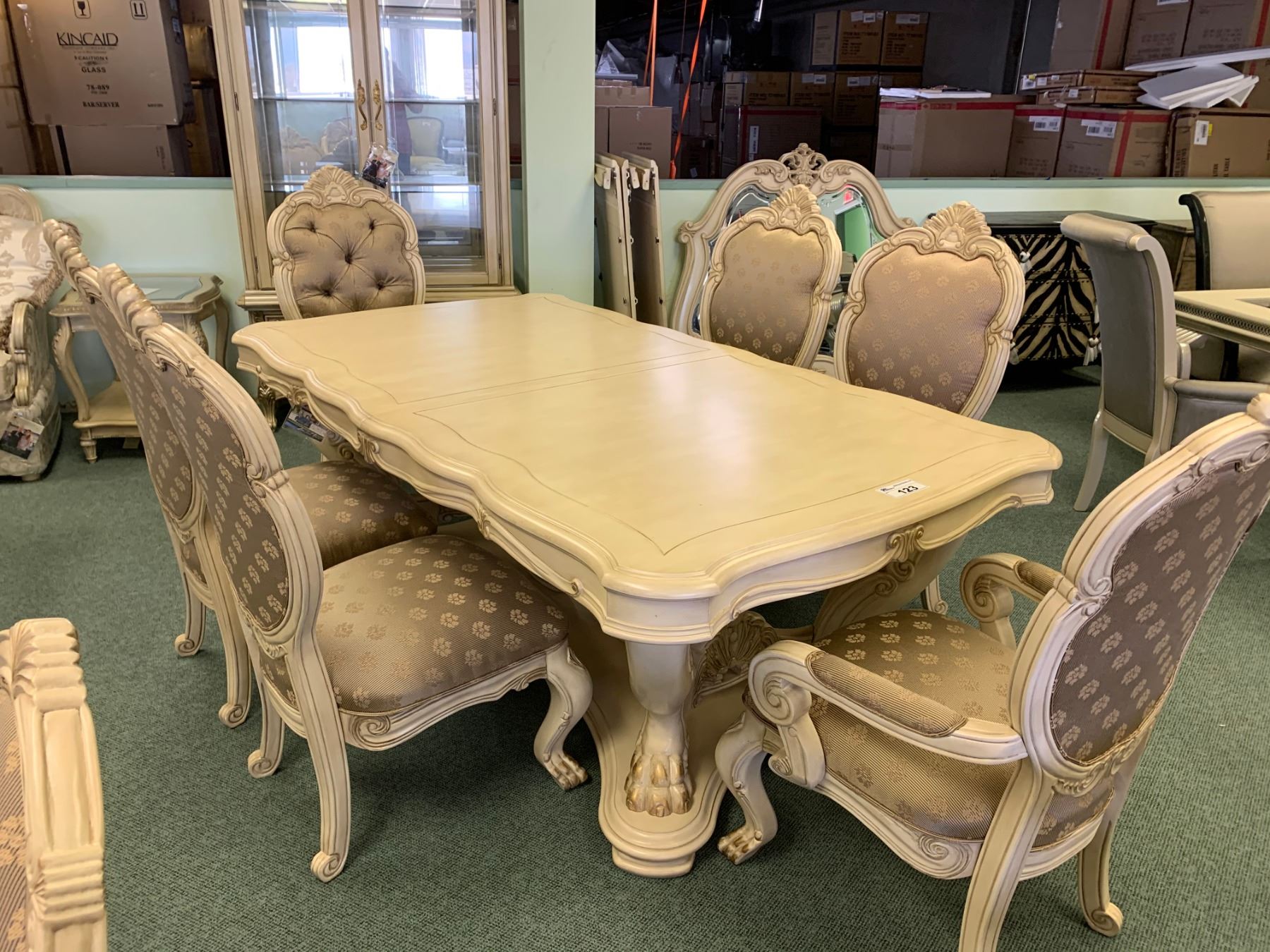 MICHAEL ARMINI CHATEAU CLAW FOOT 10 PCS DINNING SET INCLUDING: TABLE, 3 LEAFS, & 6 WOOD & FABRIC PATTERN DINNING CHAIRS