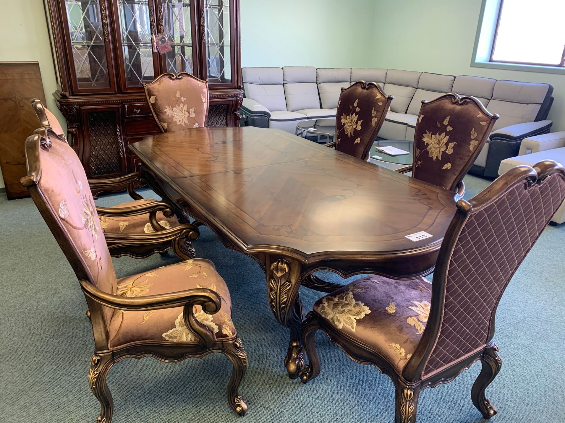 MICHAEL ARMINI DARK WOOD GOLD ETCHED 10 PCS DINNING SET INCLUDING: TABLE, LEAF, 6 PATTERN DINNING CHAIRS 4 DRAWER, 2 DOOR BUFFET WITH 4 DOOR GLASS TOP HUTCH