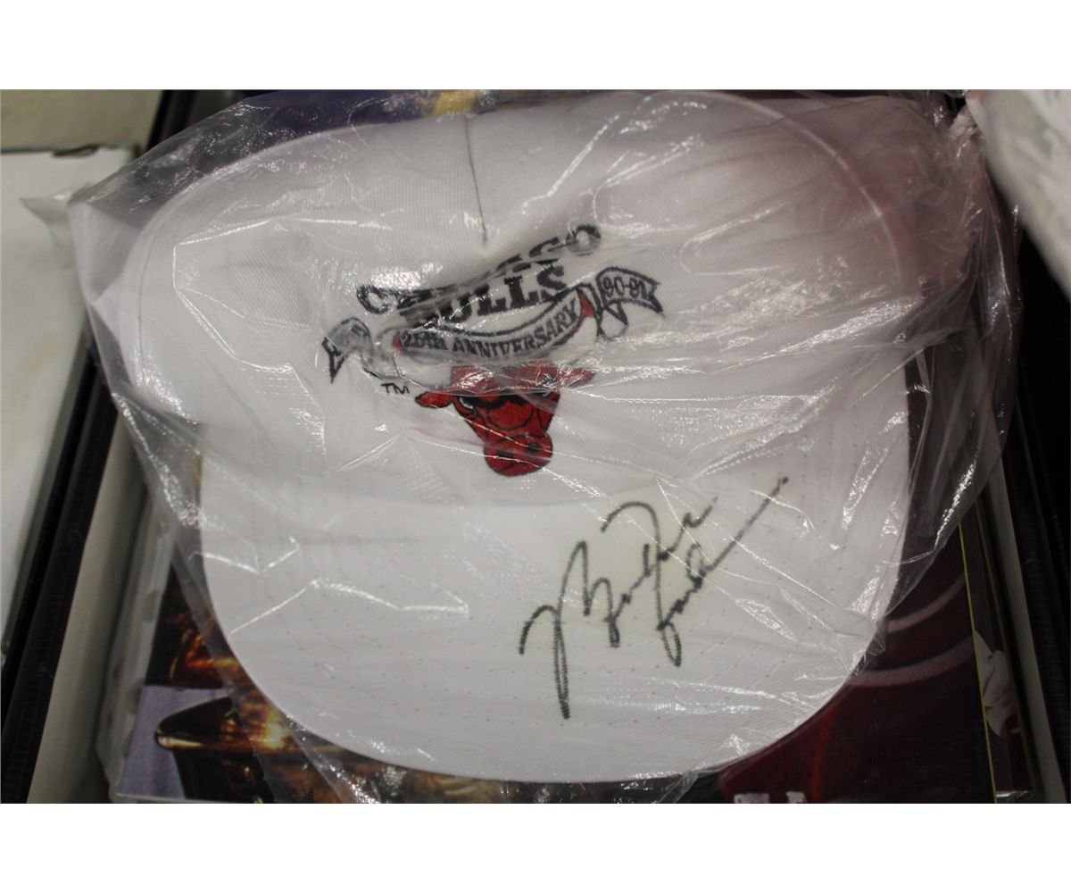 MICHAEL JORDON LOT- INCL. SIGNED CHICAGO BULLS HAT, SIGNED TRADING CARD, A COLLECTION OF CARDS INCL. 2 PSA GRADED , ASSORTED MAGAZINES WITH JORDAN ON THE COVER AND MORE!
