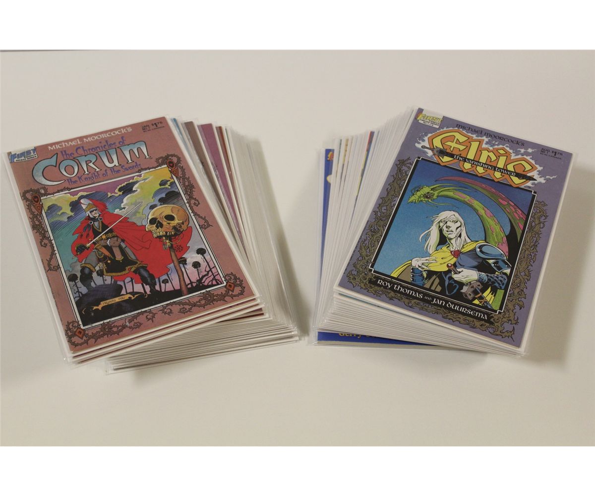MICHAEL MOORCOCK FANTASY SERIES LOT (1980'S) INCLUDES 1 CORUM MINI SERIES, 4 ELRIC MINI SERIES & 3 HAWKMOON MINI SERIES + ONE-SHOT. . A SLEW OF INDUSTRY TALENT PRODUCED THESE: ROY THOMAS, P. CRAIG RUSSELL, MIGNOLA, ETC. 8 MINIS & 1 ONE-SHOT, 40 BOOKS TOTAL, HIGH GRADE AVERAGE