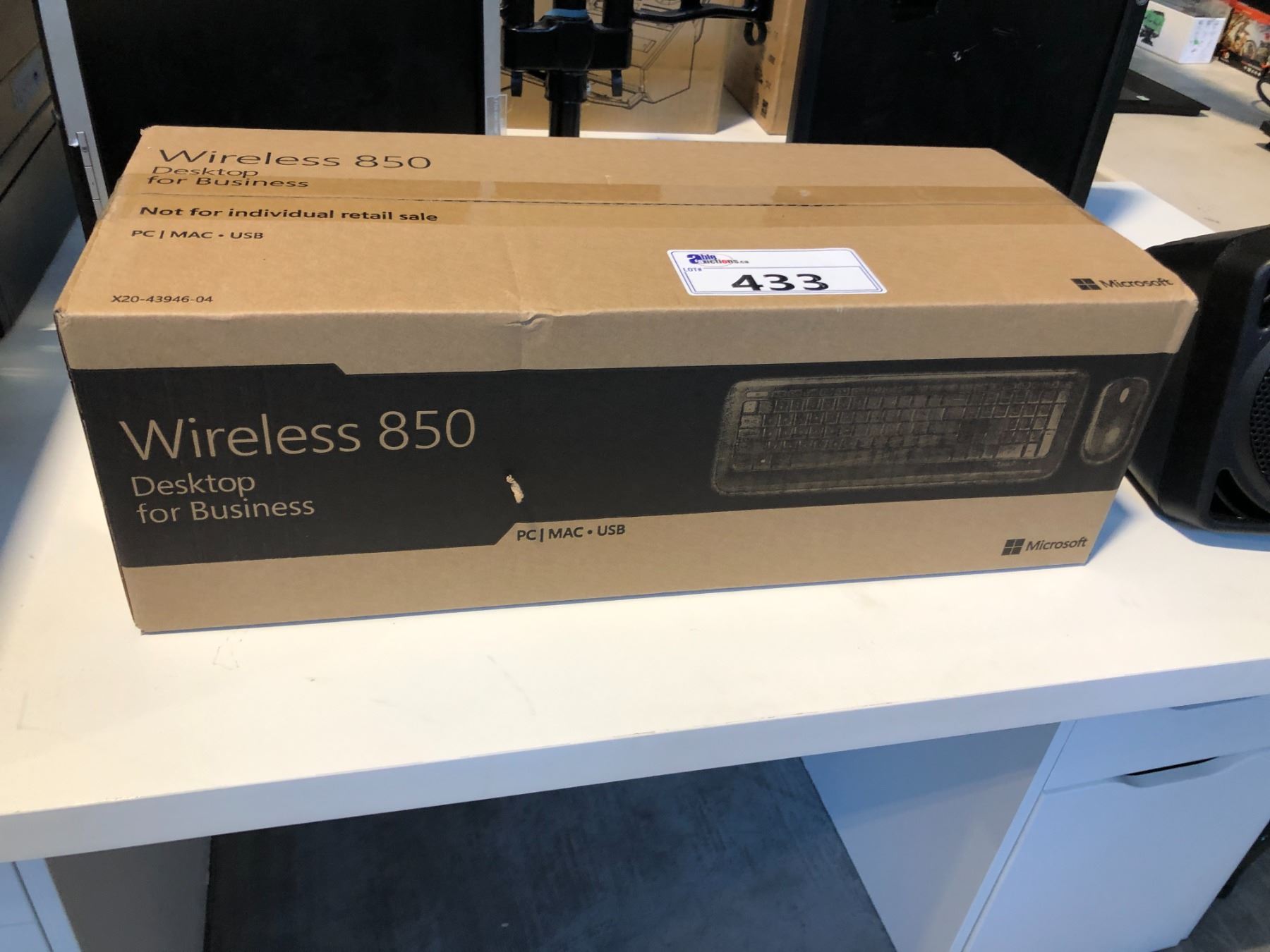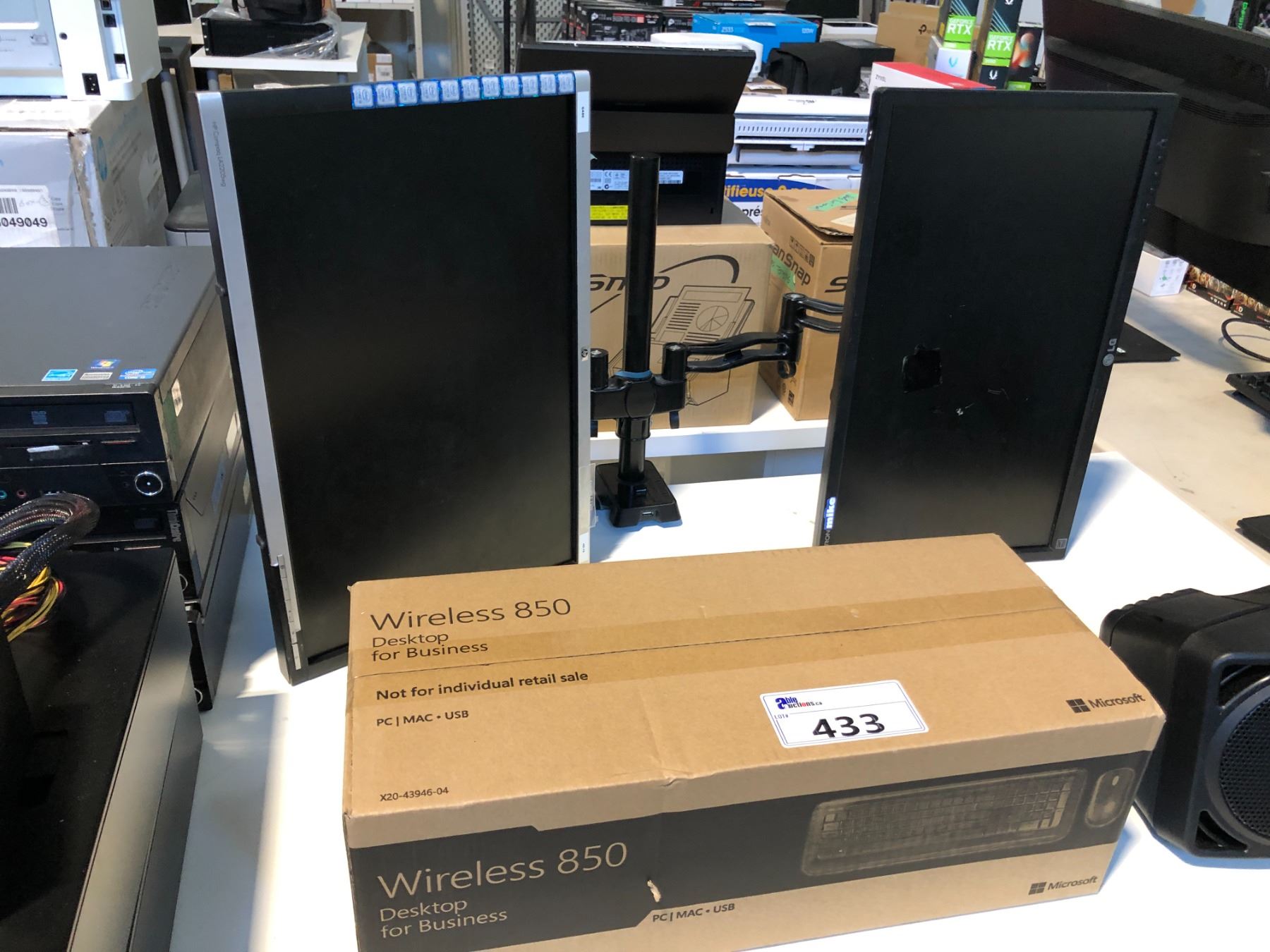 MICROSOFT WIRELESS 850 KEYBOARD WITH MOUSE, DUAL DESK MOUNT SWIVEL MONITOR ARM, HP 22" MONITOR, &