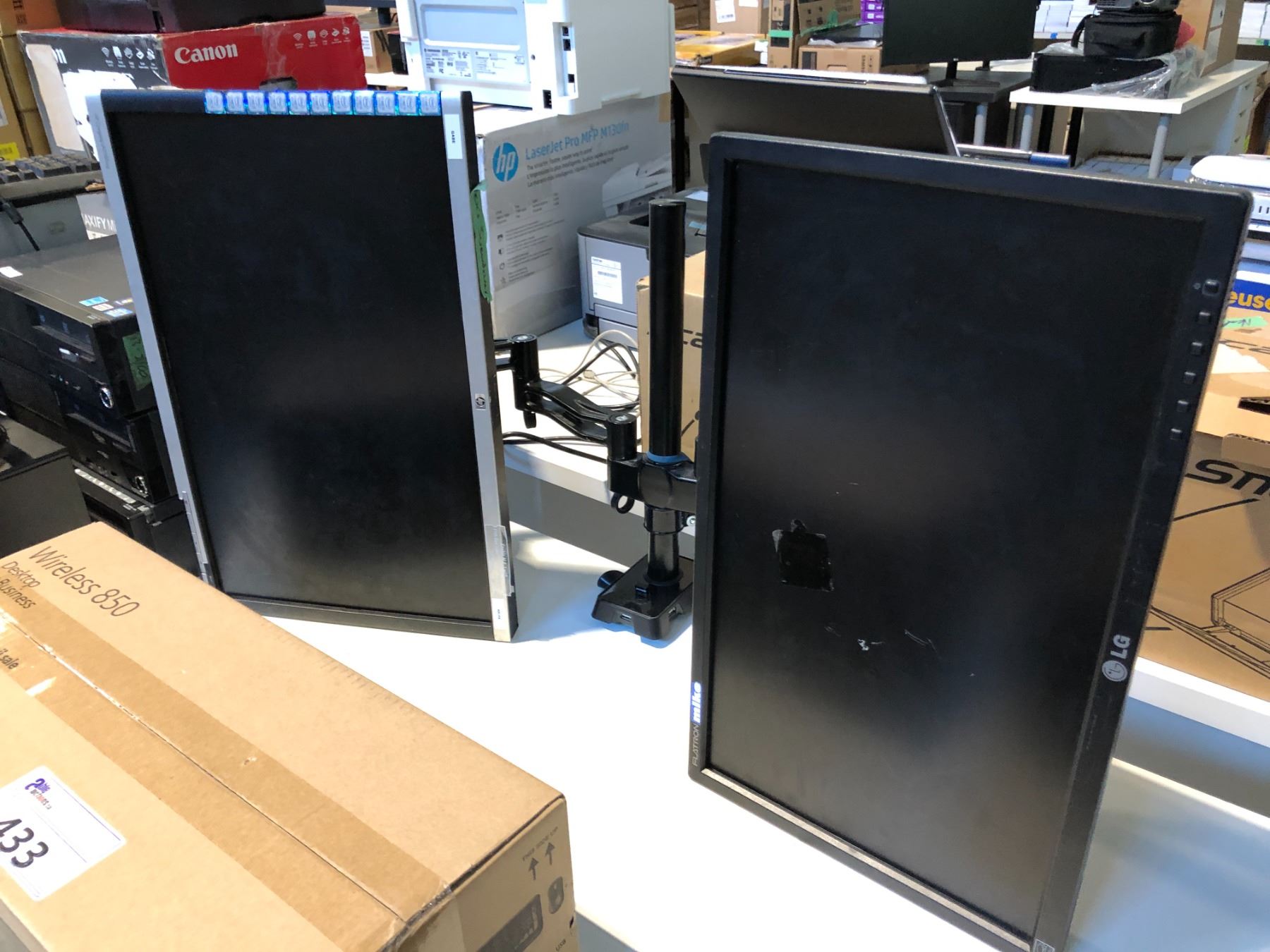 MICROSOFT WIRELESS 850 KEYBOARD WITH MOUSE, DUAL DESK MOUNT SWIVEL MONITOR ARM, HP 22" MONITOR, & LG 22" MONITOR