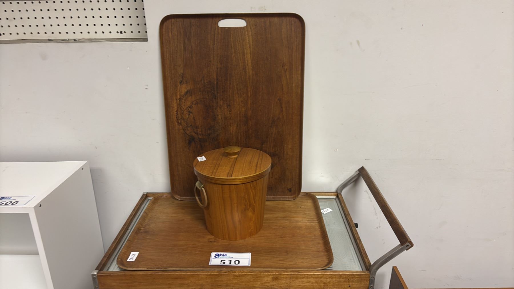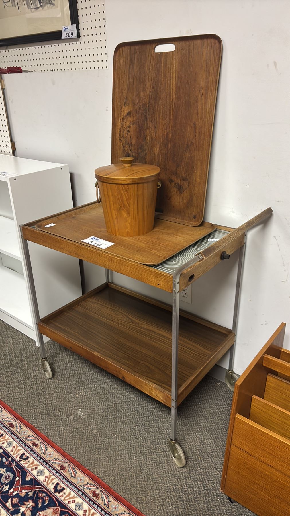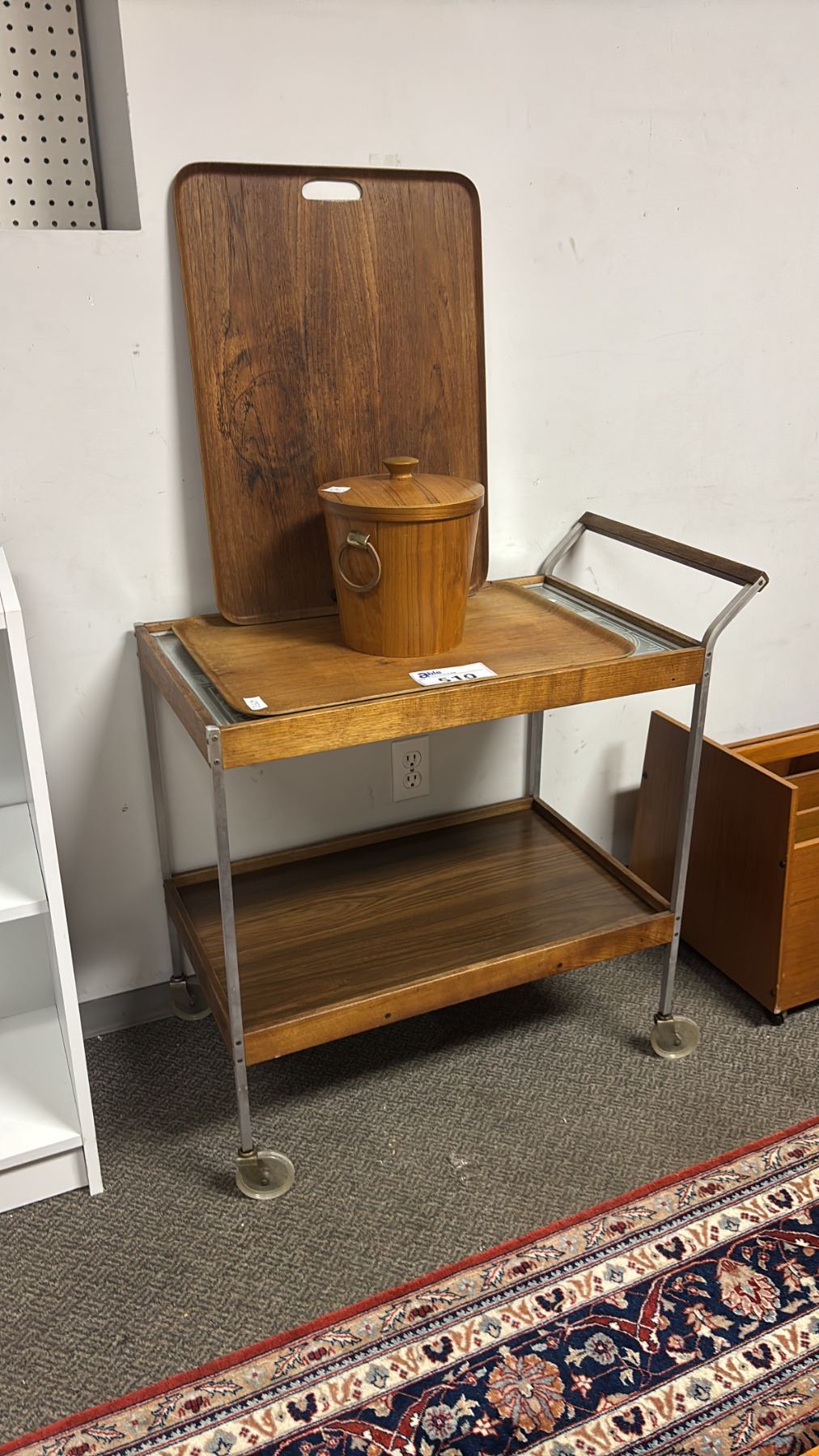 MID CENTURY DANISH MODERN TEAK SERVING CART, 2 TRAYS & ICE BUCKET