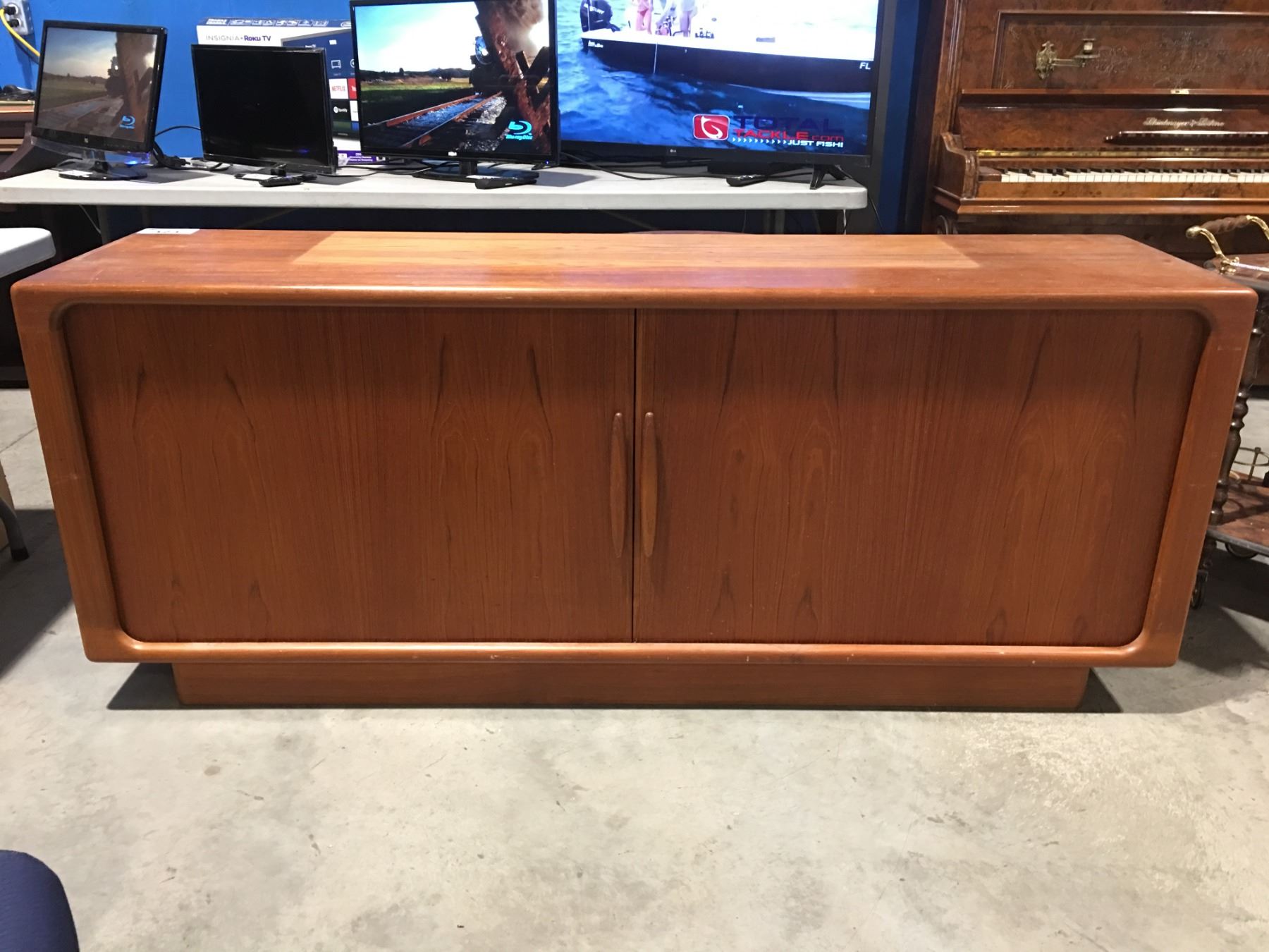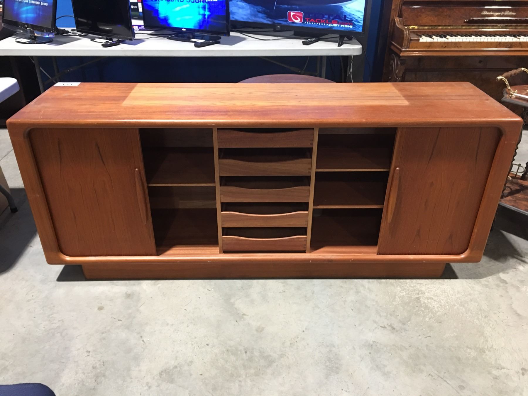 MID CENTURY DANISH MODERN TEAK SIDEBOARD FEATURES TAMBOUR FRONT DOORS (SOME FADING & WEAR PRESENT)