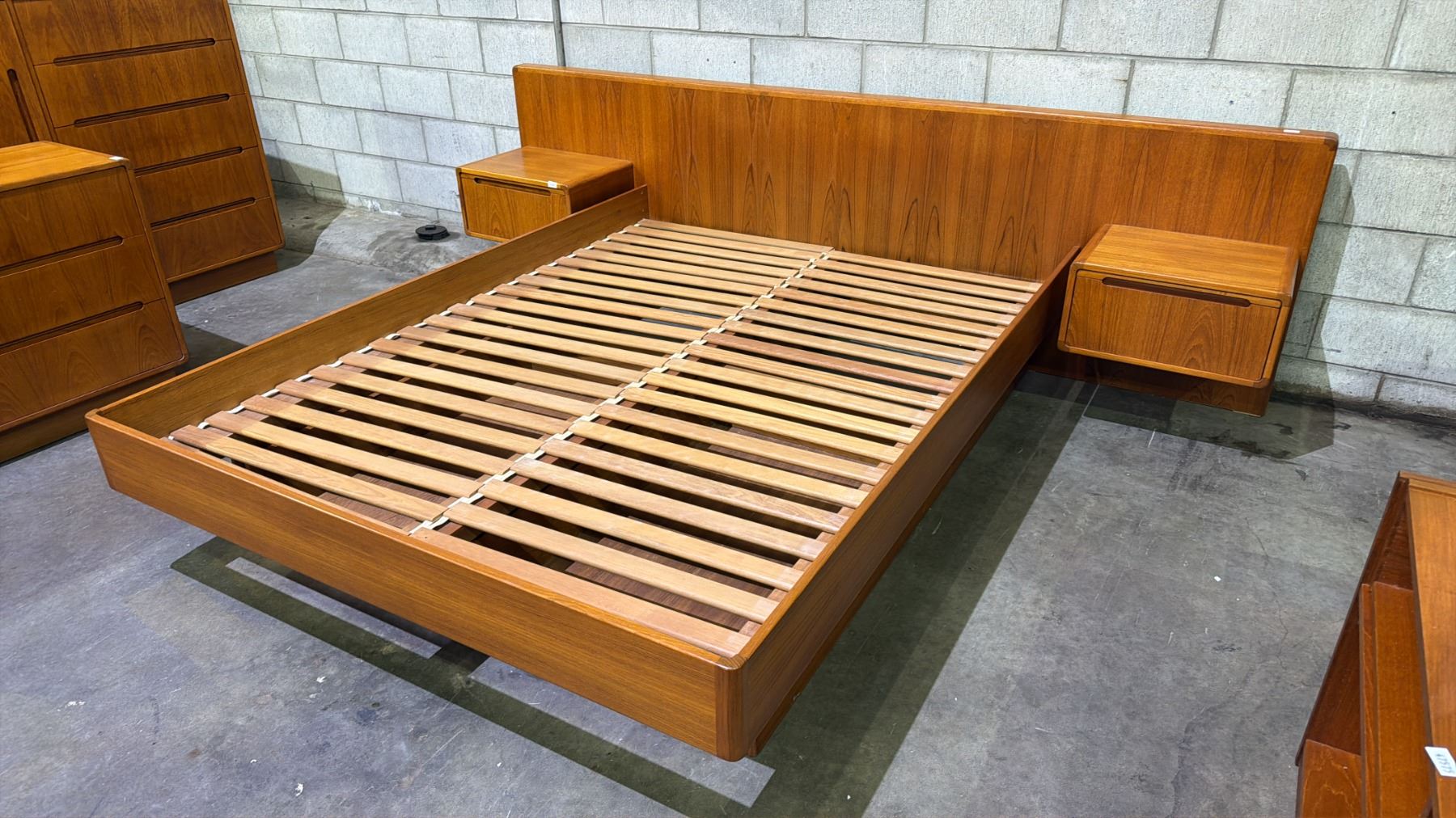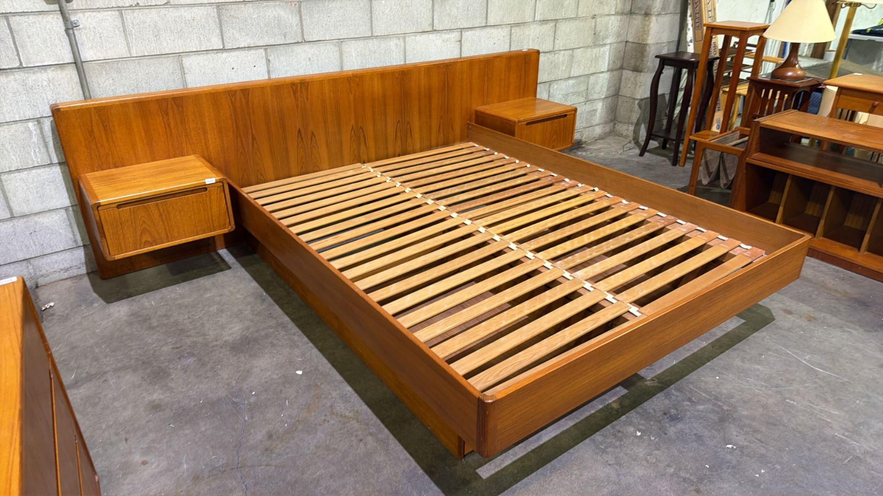 MID CENTURY MODERN TEAK QUEEN SIZE PLATFORM BED FRAME WITH FLOATING NIGHT STANDS & 2 PULL-OUT