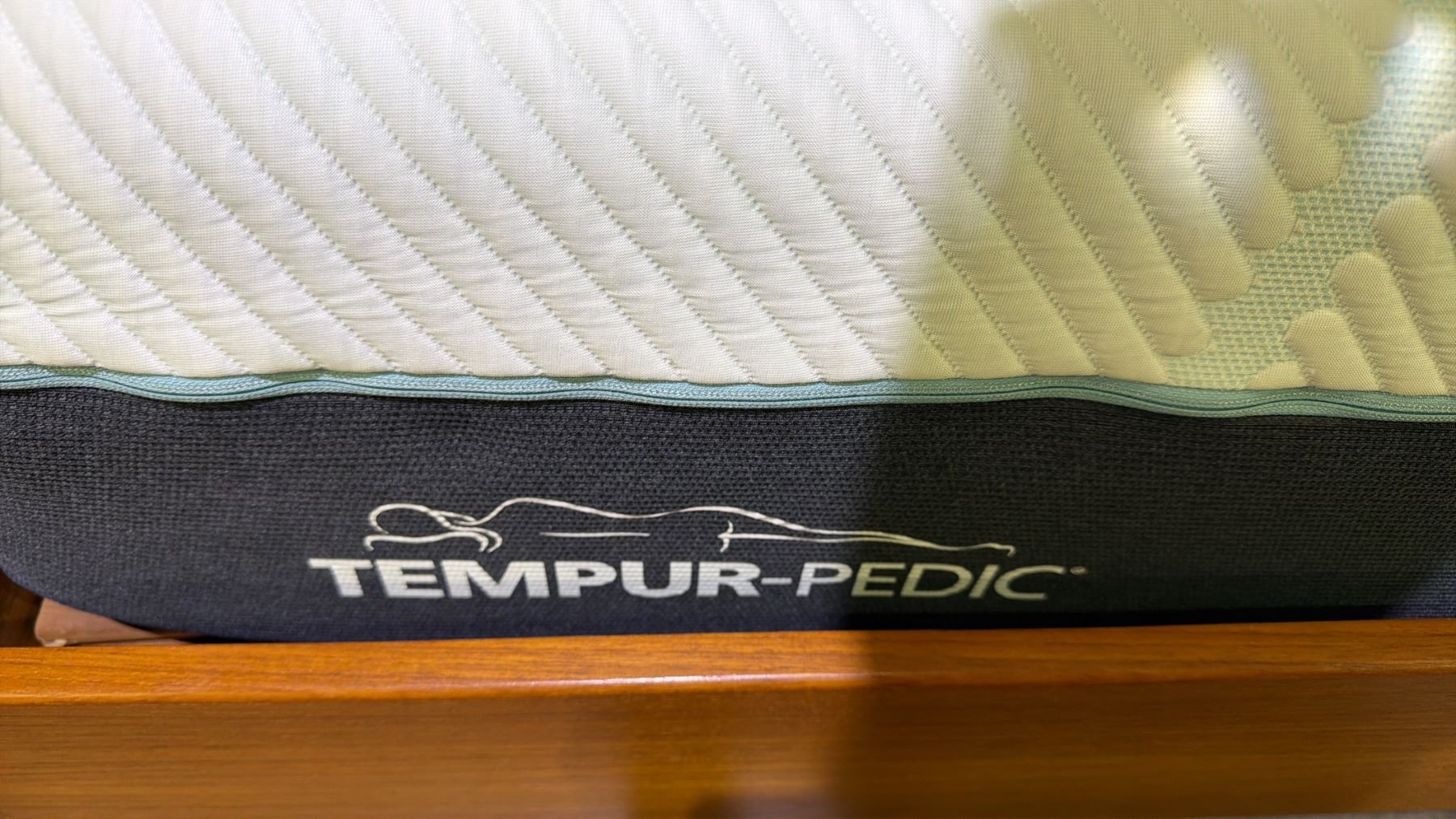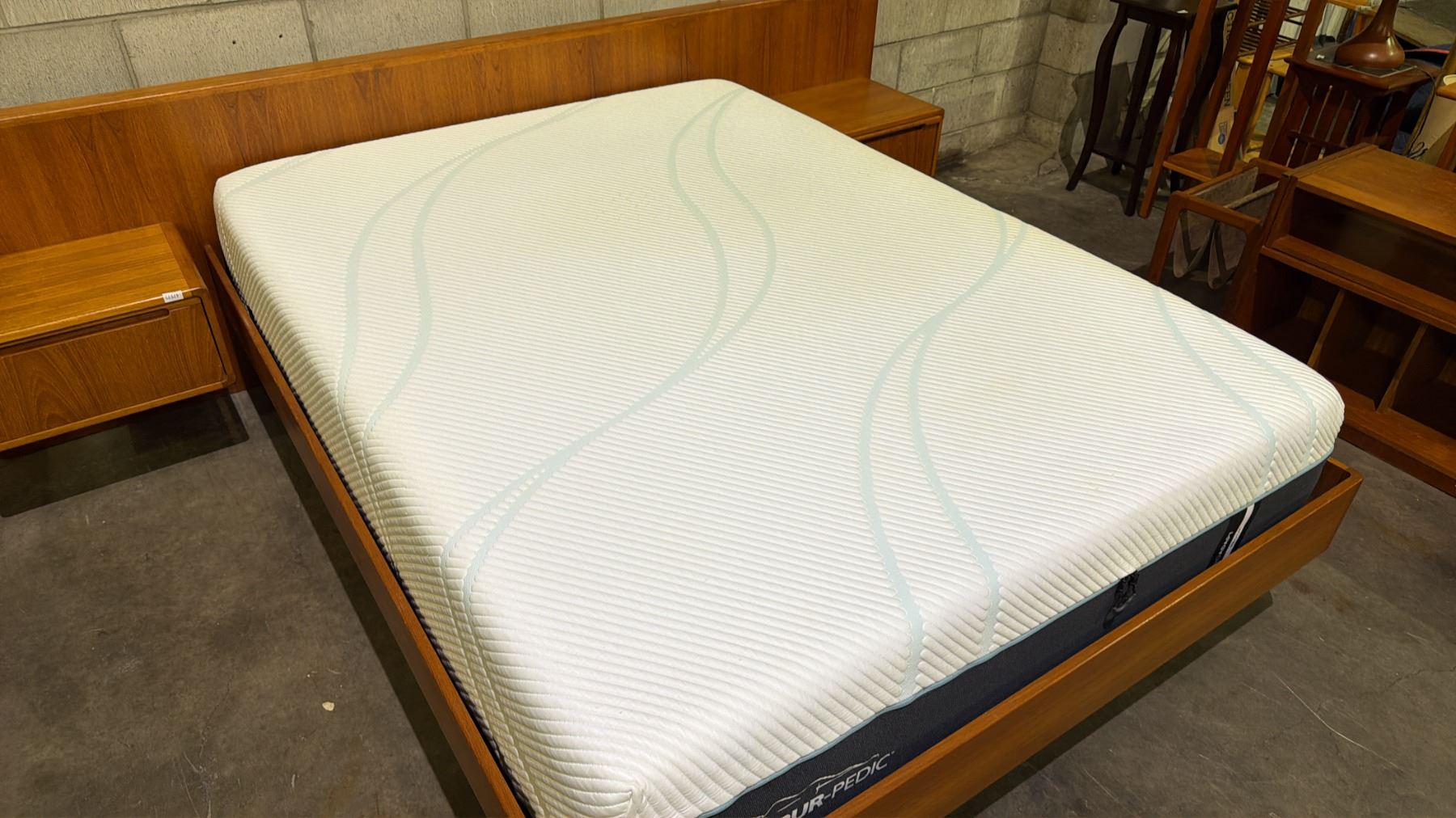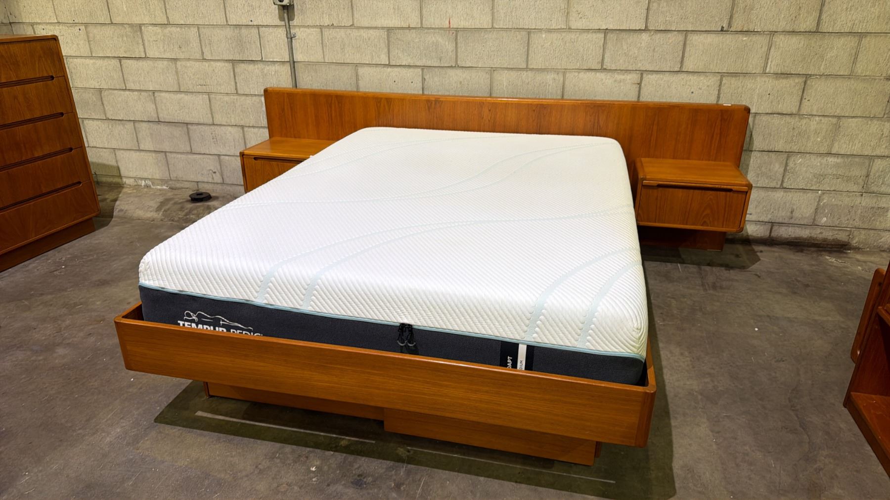 MID CENTURY MODERN TEAK QUEEN SIZE PLATFORM BED FRAME WITH FLOATING NIGHT STANDS & 2 PULL-OUT END DRAWERS WITH TEMPUR-PEDIC QUEEN SIZE MATTRESS 9FT X 7FT