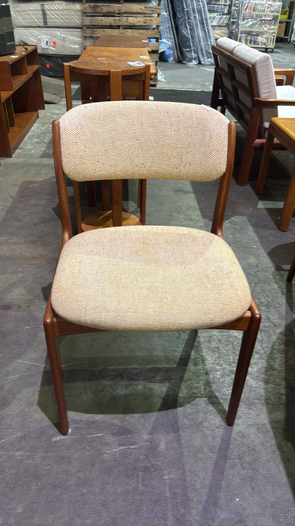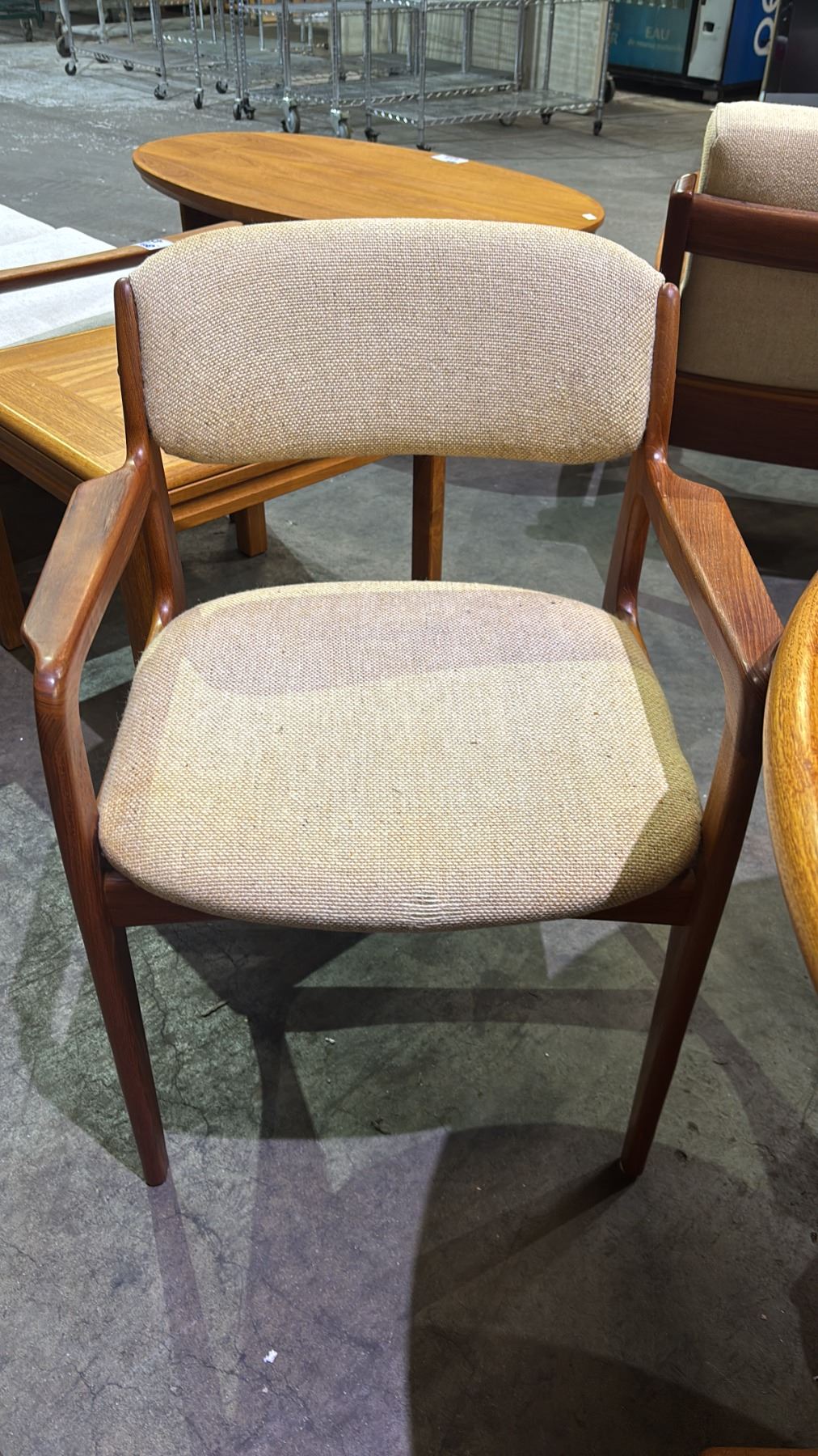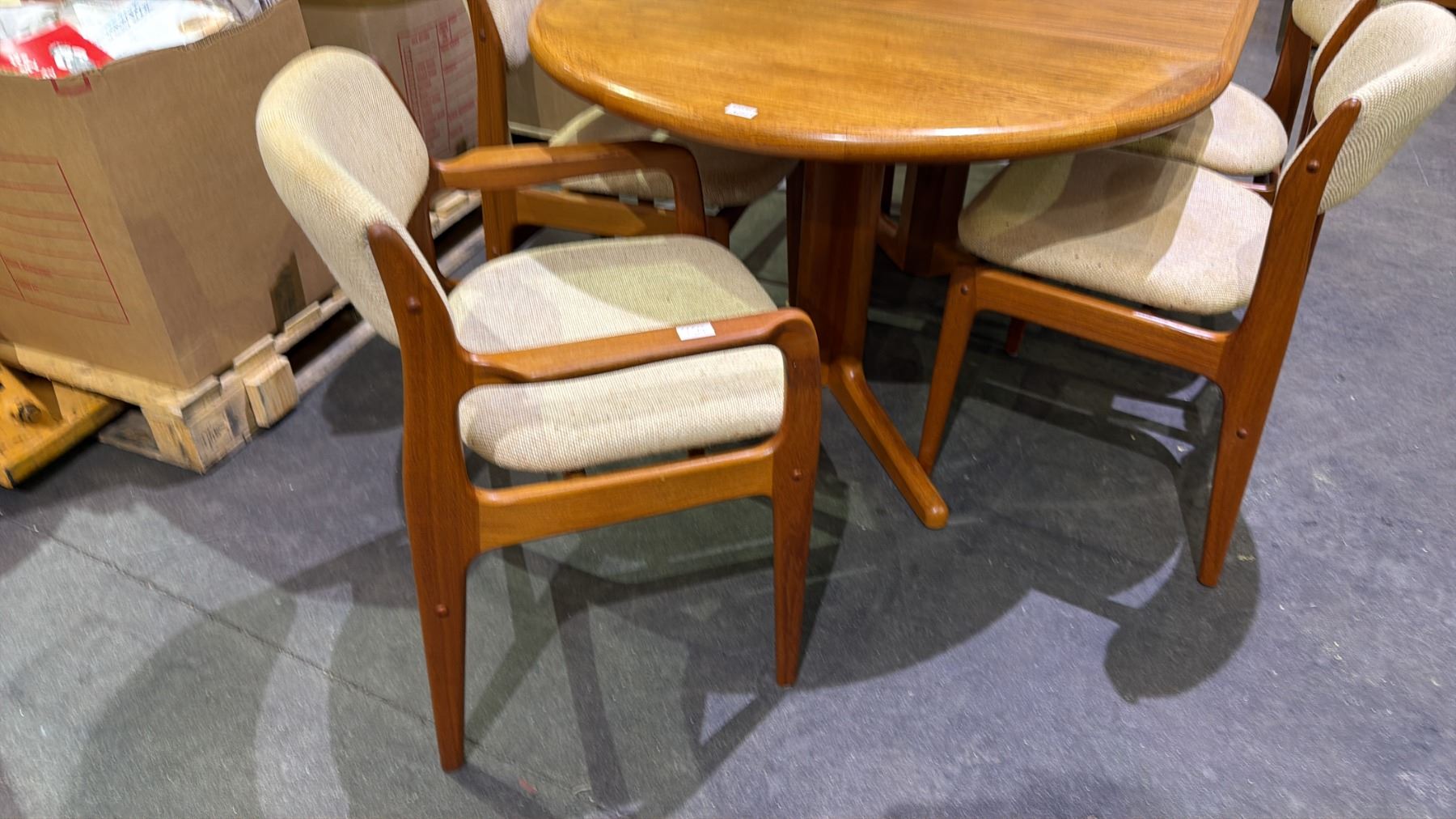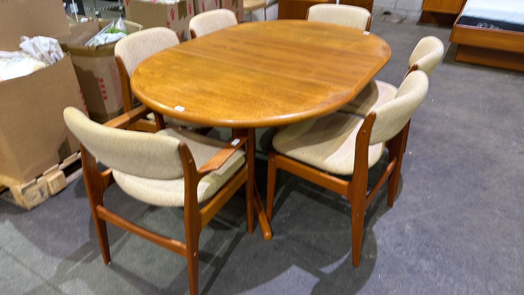 MID CENTURY MODERN TEAK STAMPED DENMARK DOUBLE PEDESTAL DINING TABLE WITH 1 LEAF - COMES WITH 6 BENNY LINDEN DESIGNER DANISH MODERN TEAK DINING CHAIRS (CHAIRS MADE IN THAILAND) TABLE: 62" X 42" X 28"