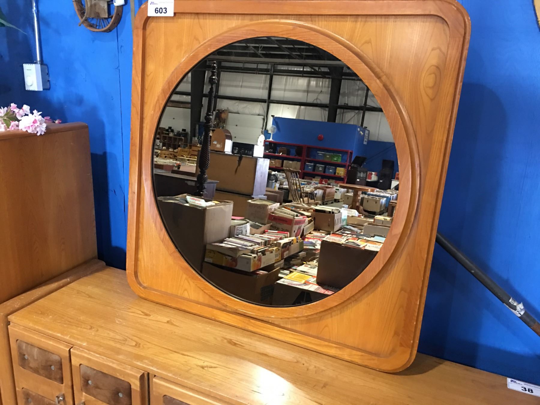 MID-CENTURY WOOD FRAMED ROUND WALL MIRROR