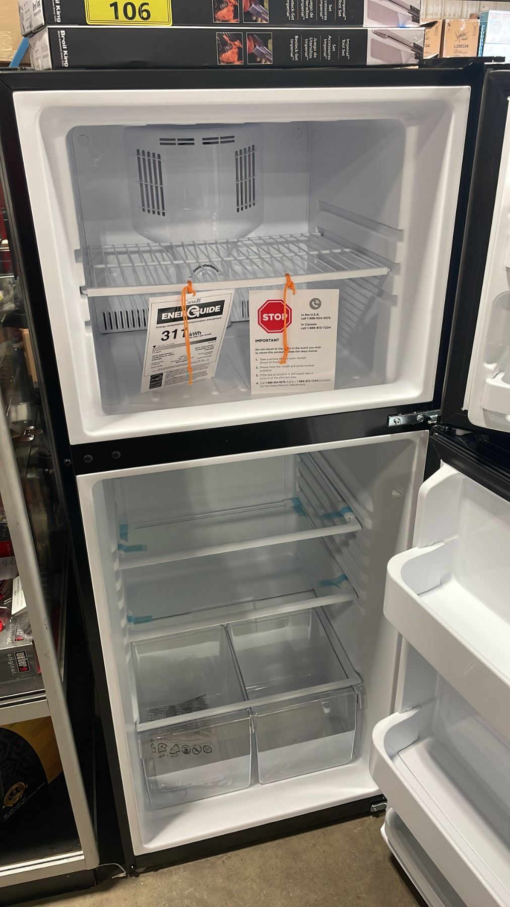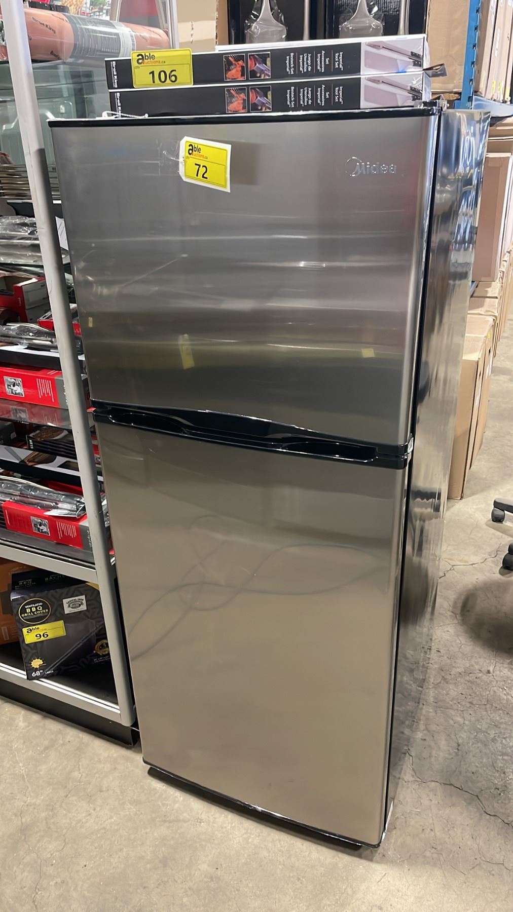MIDEA MODEL MRT12B2AST. 24" STAINLESS STEEL / BLACK APARTMENT SIZE REFRIGERATOR WITH TOP FREEZER, 11.5 CU FT CAPACITY SN 1310A06E4A1071320005 RETAIL PRICE $699.00