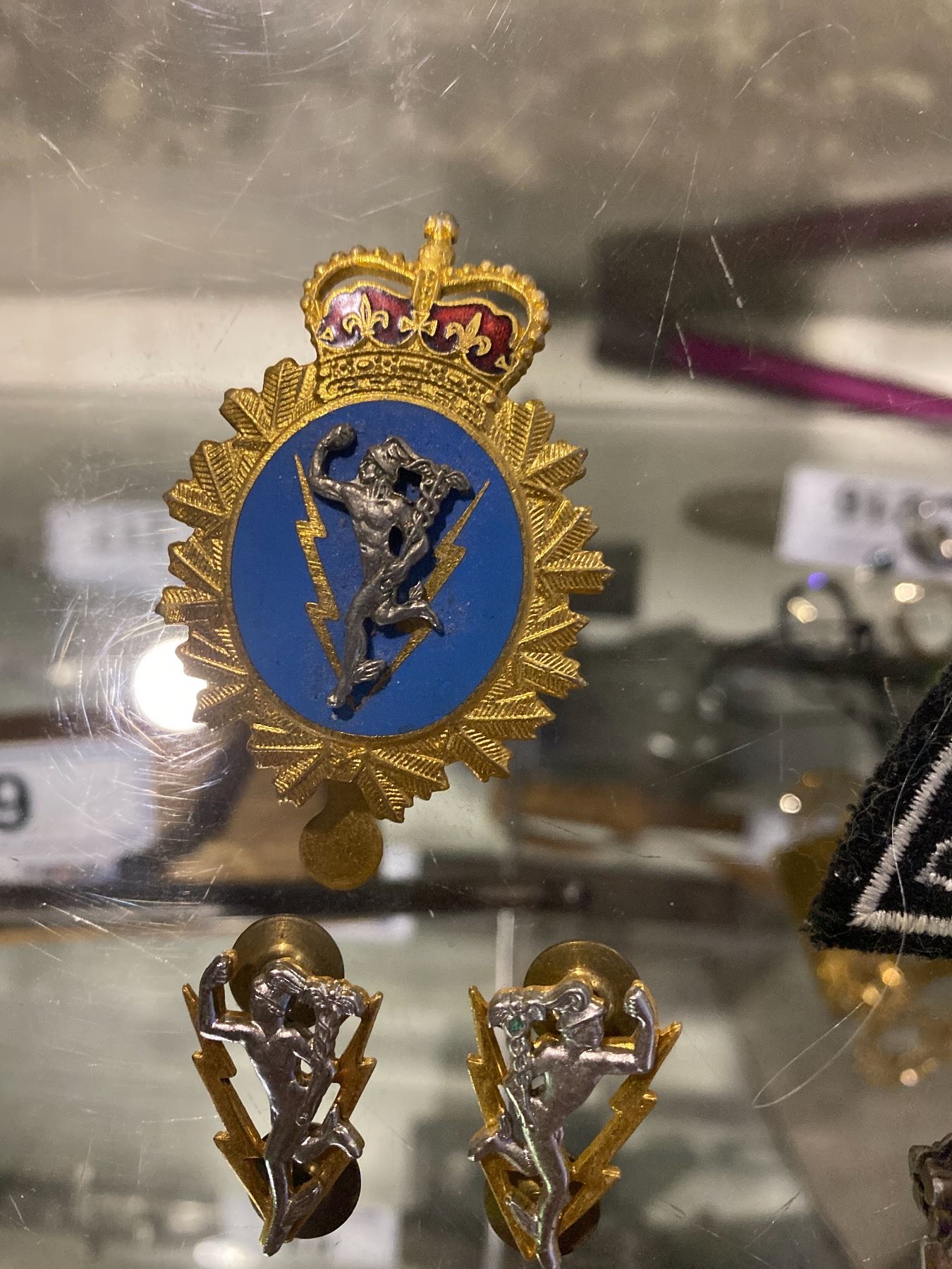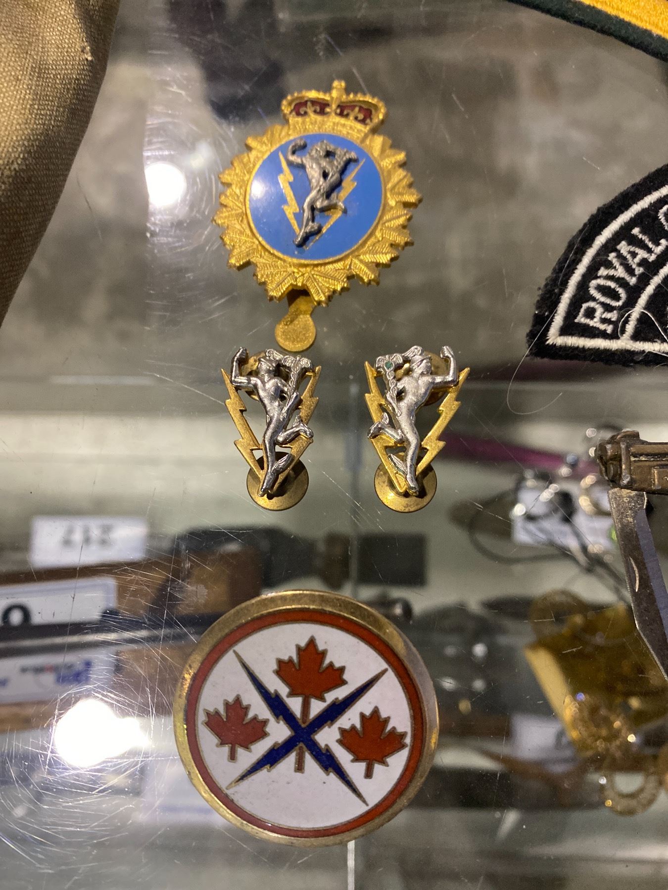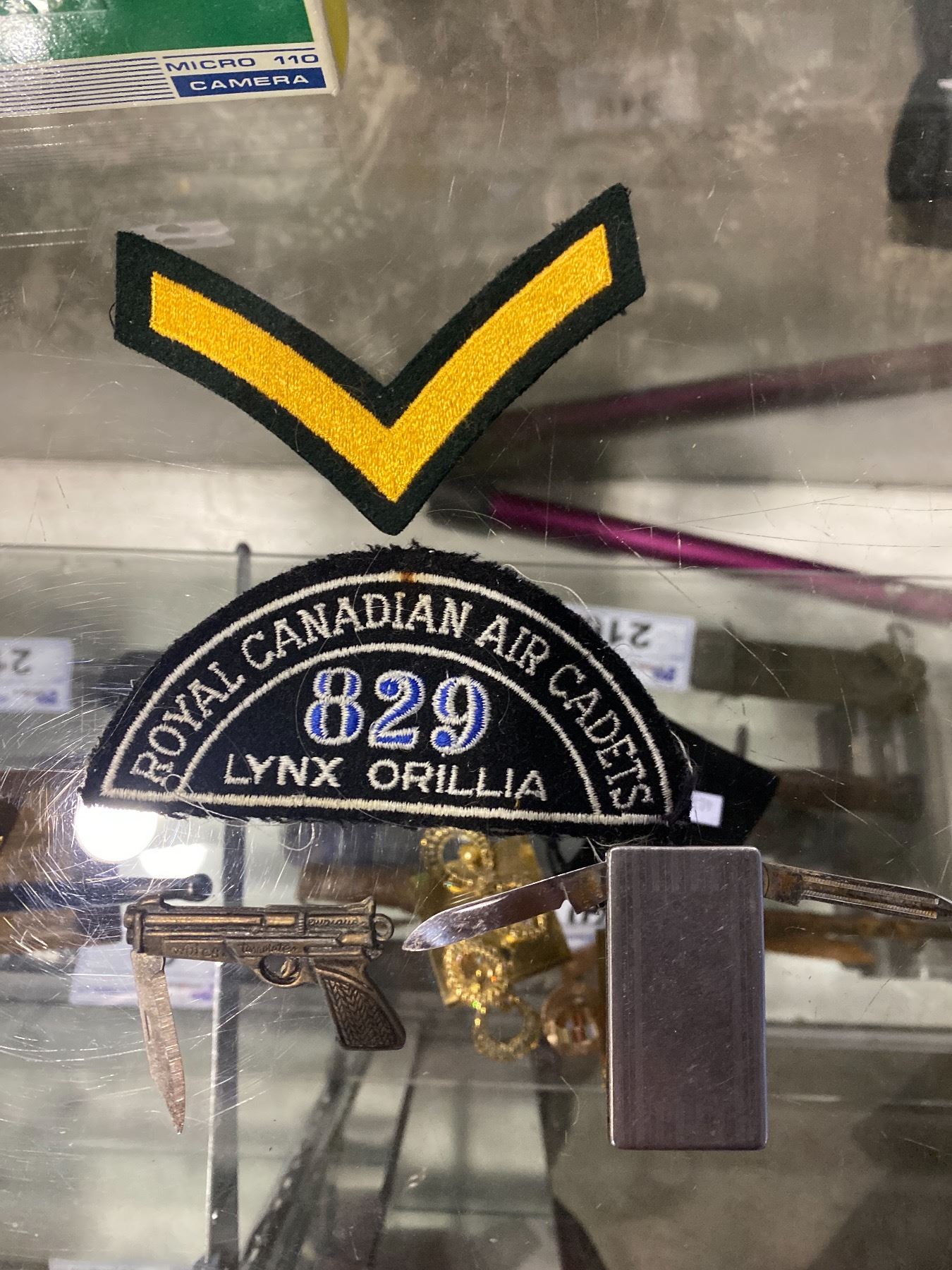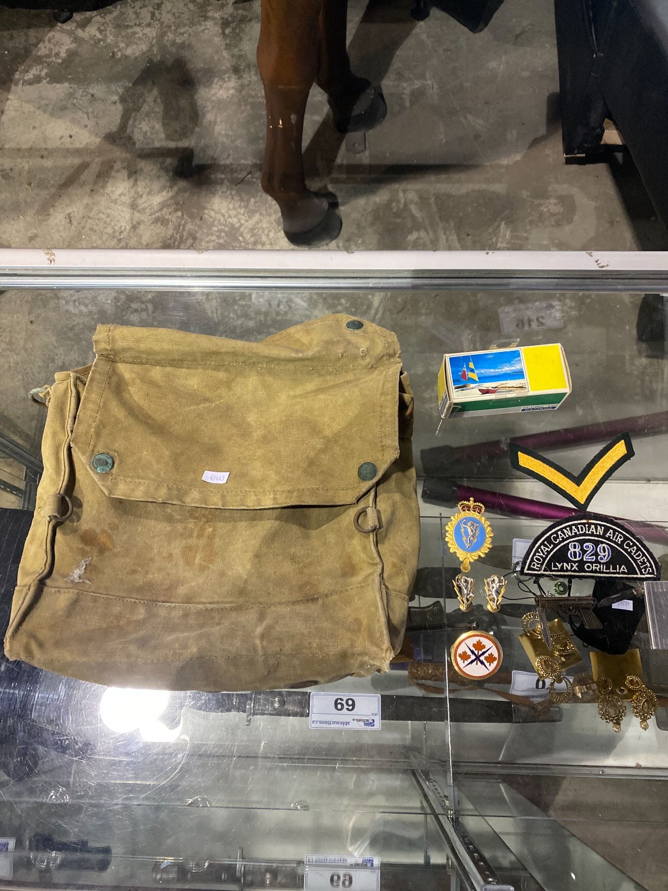 MILITARY POUCH, ASSORTED PATCHES AND PINS