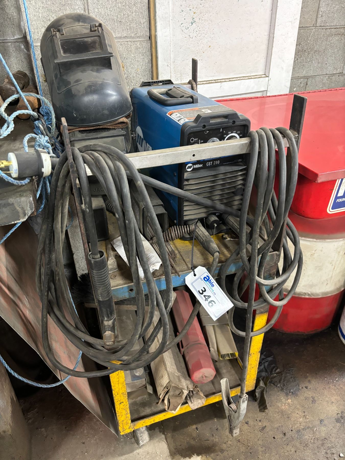 MILLER CST 280 MIG WELDER WITH HELMETS/ELECTRODES AND ROLLING WORK CART