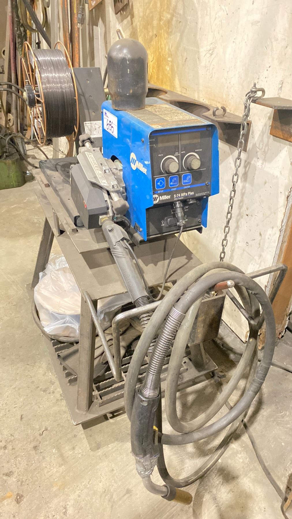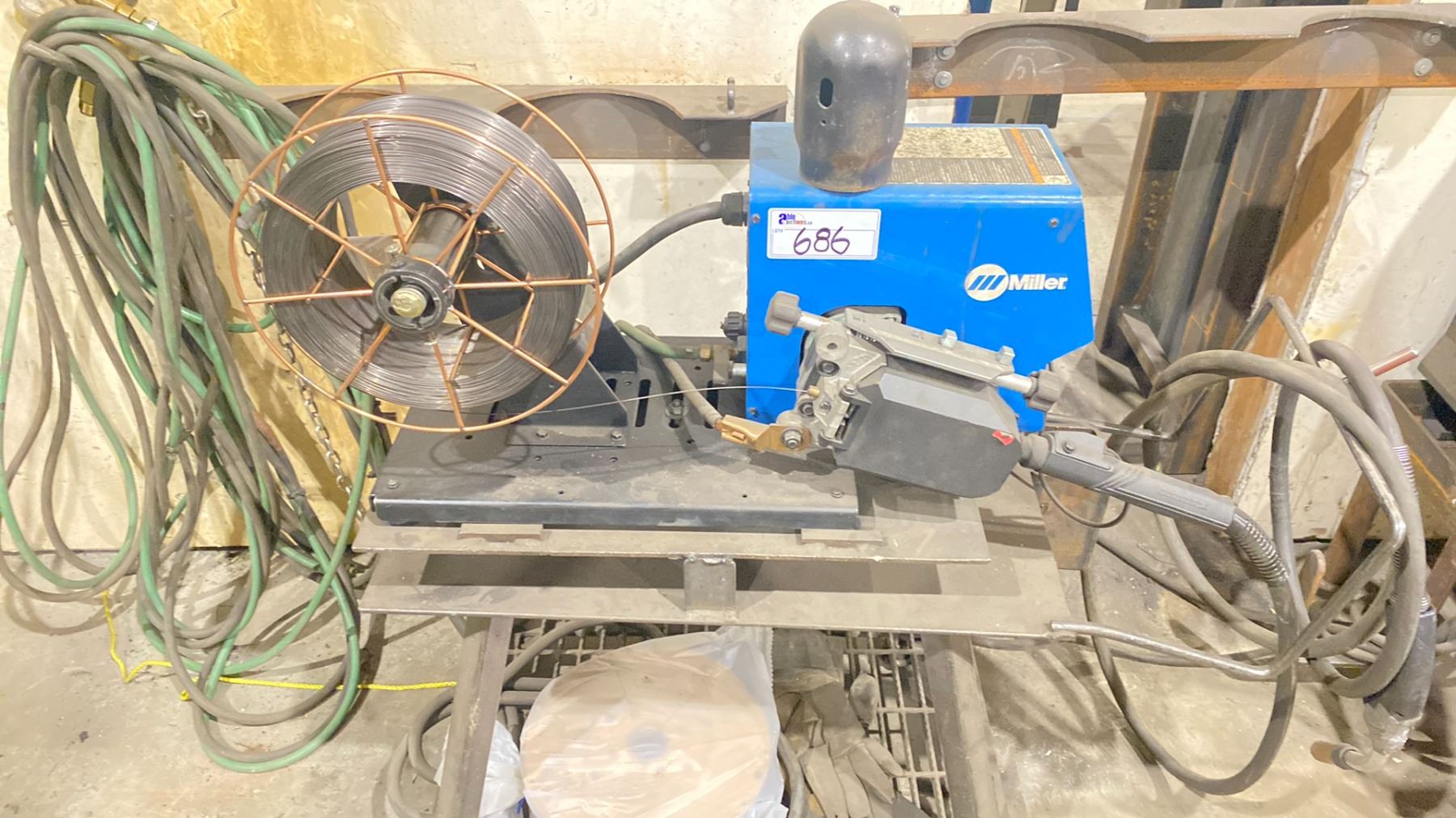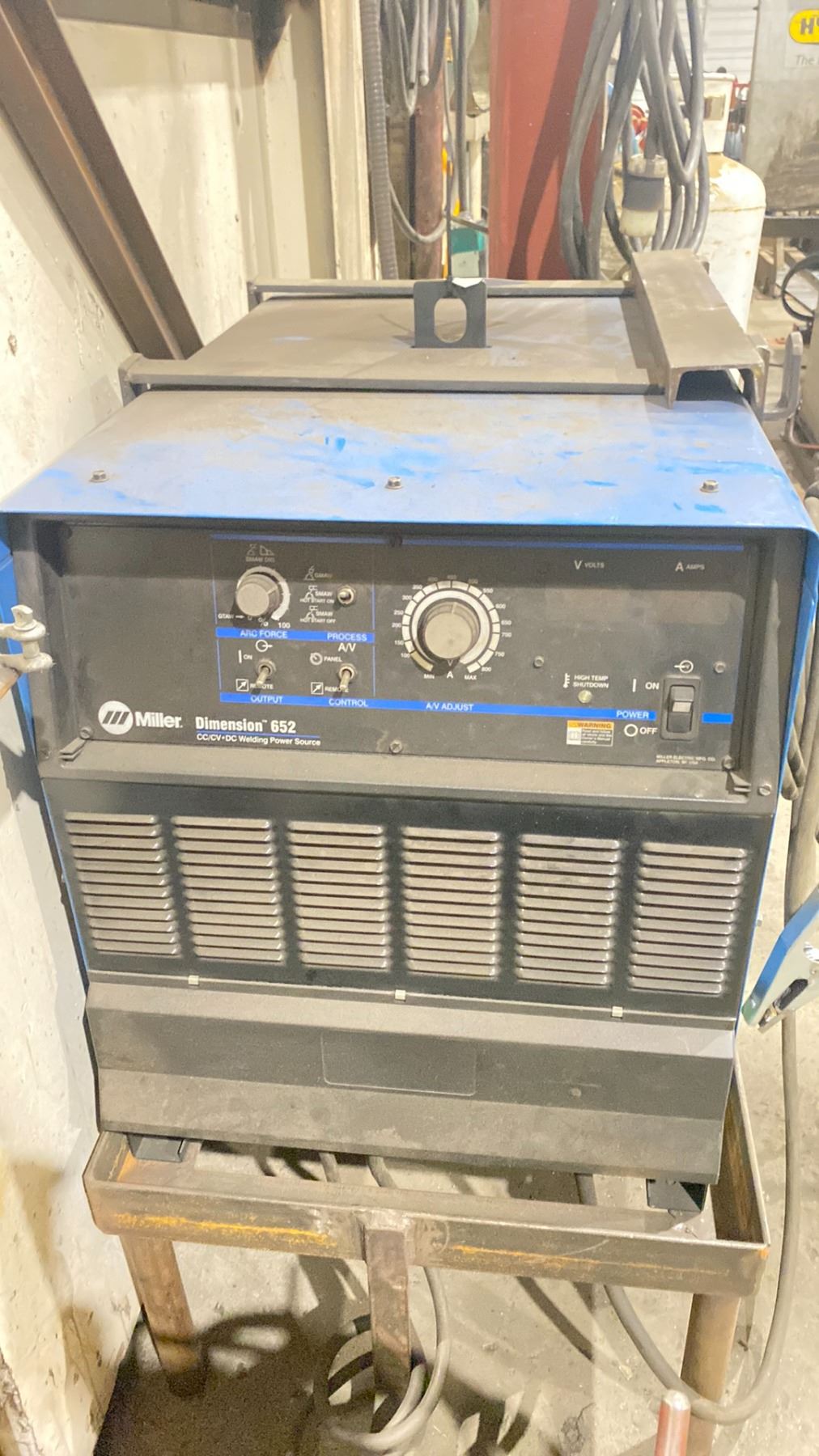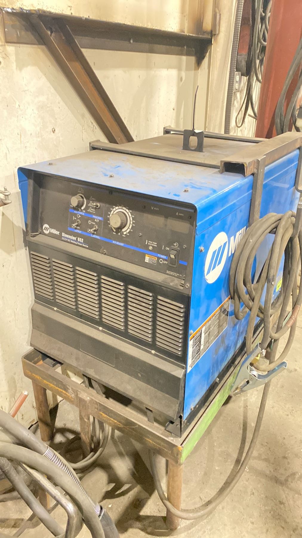 MILLER DELTAWELD 652 WELDING POWERSOURCE ON STEEL STAND WITH MILLER S-74MPA+ 24V WIRE FEEDER & WELDING GUN