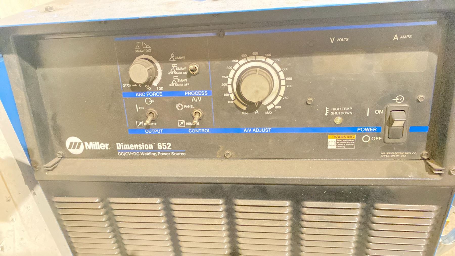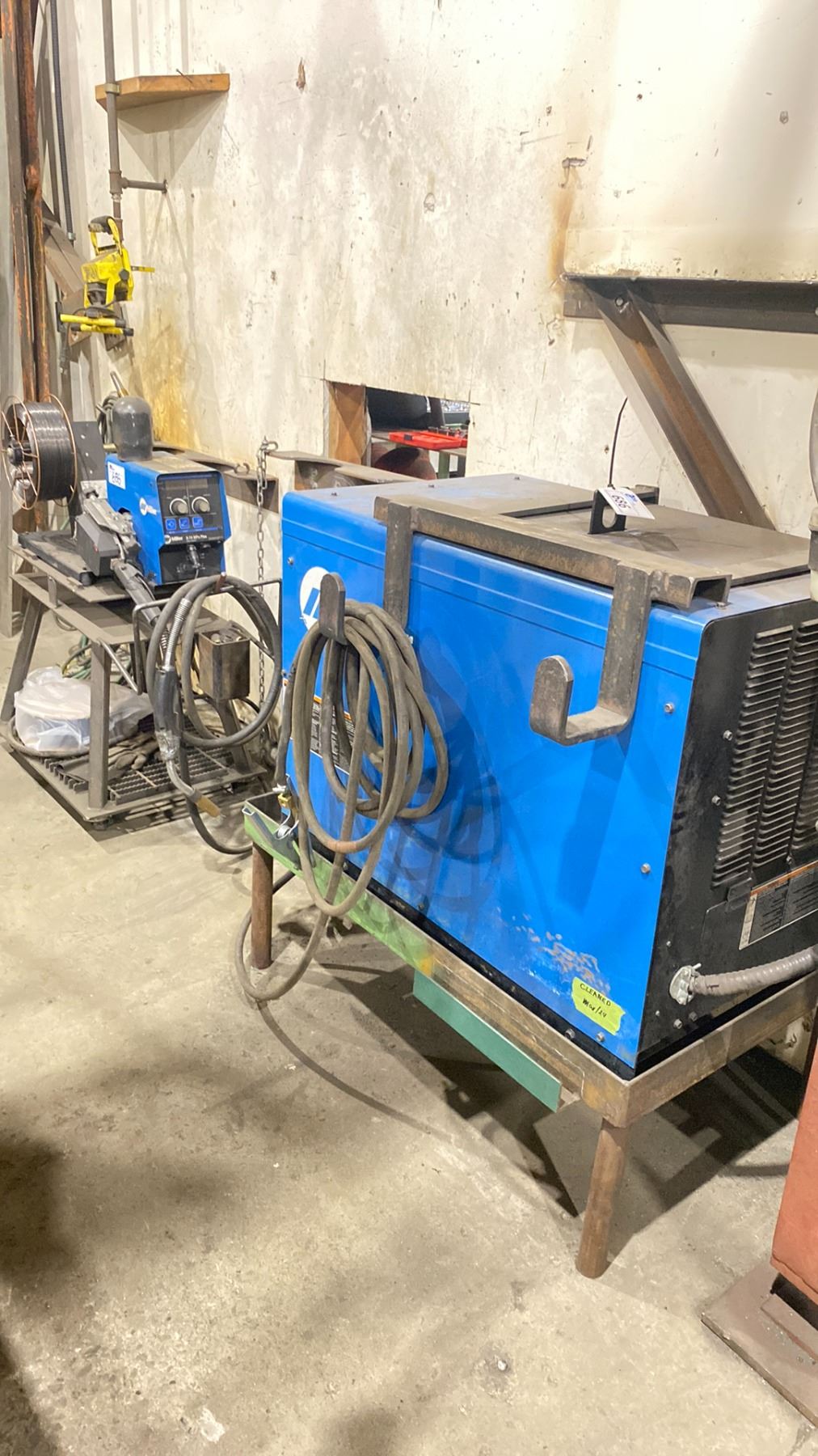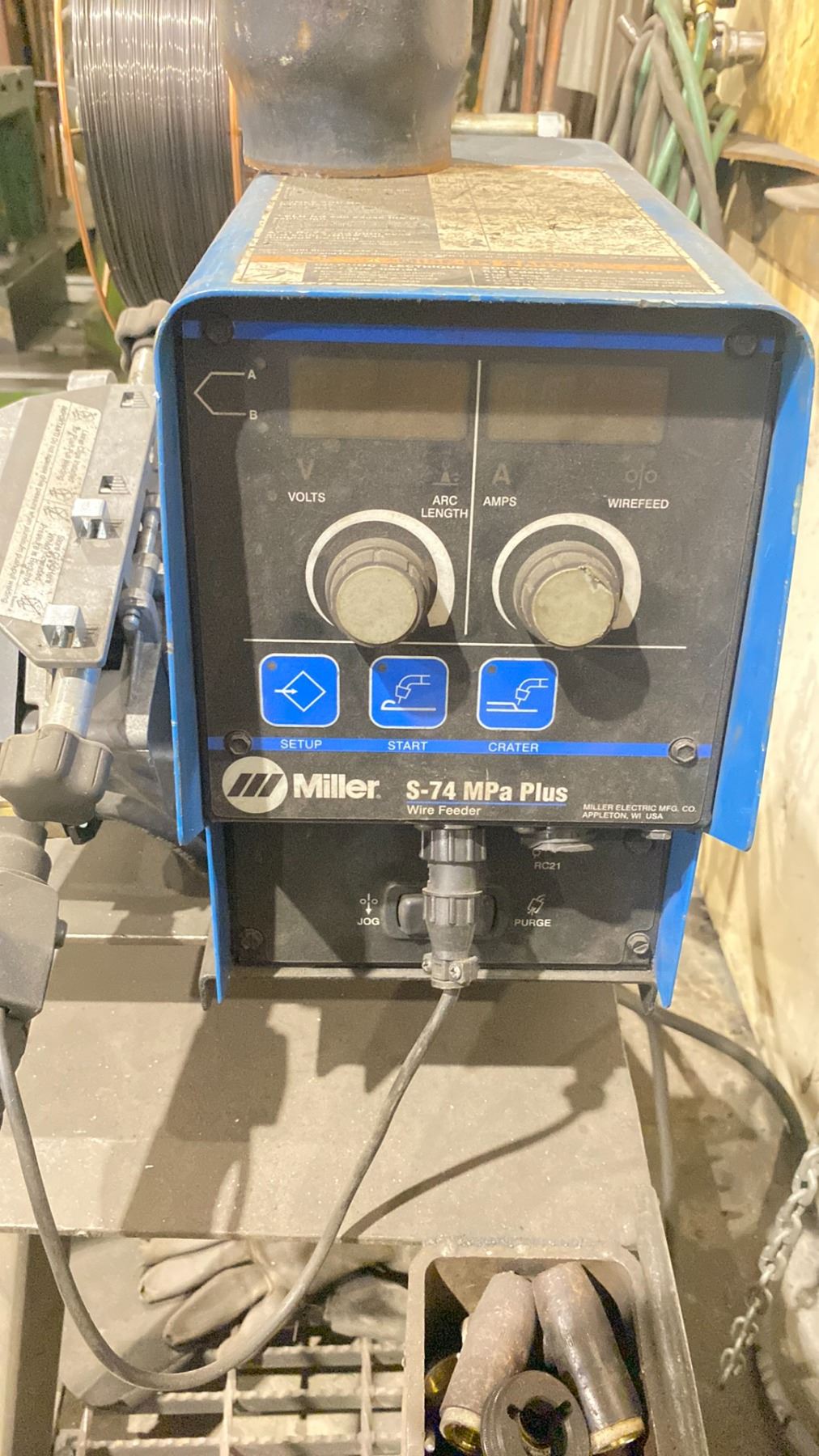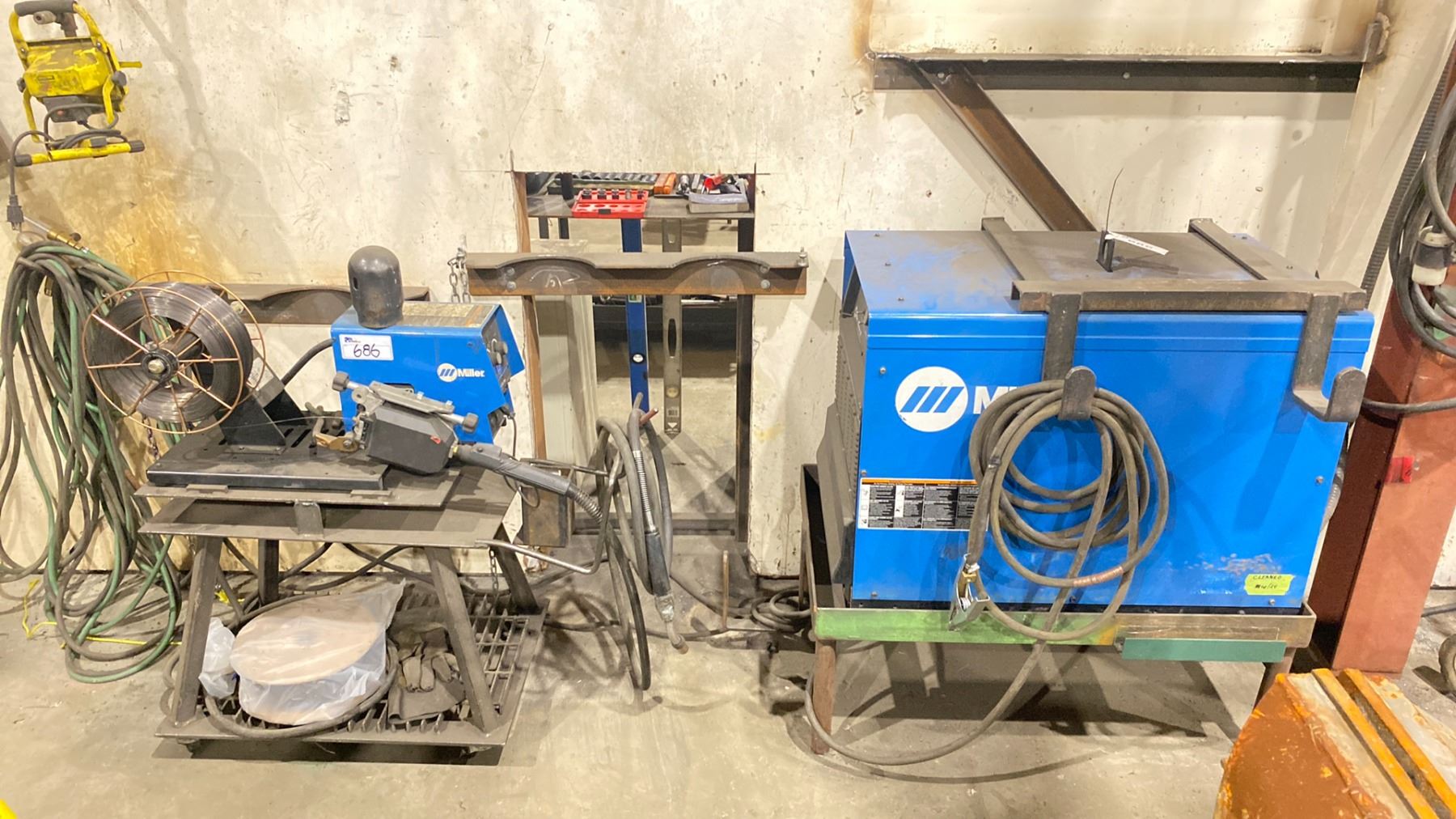 MILLER DELTAWELD 652 WELDING POWERSOURCE ON STEEL STAND WITH MILLER S-74MPA+ 24V WIRE FEEDER & WELDING GUN