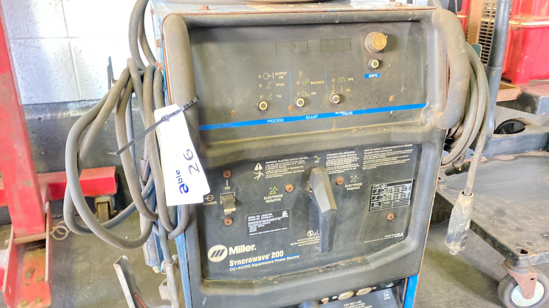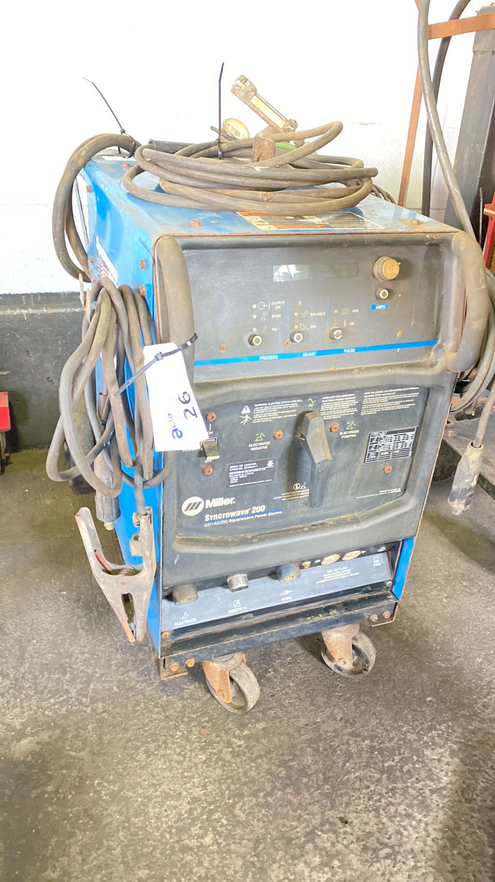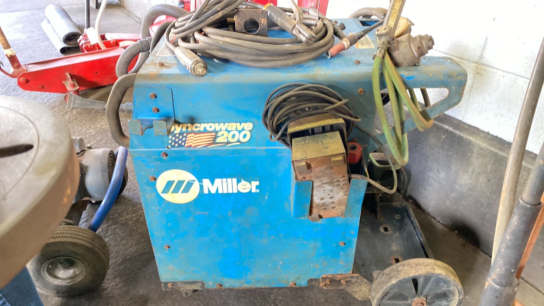 MILLER SYNCROWAVE 200 TIG AND STIG WELDER. INC FOOT PEDAL CONTROL, GAUGES, ROLLING CART. NO BOTTLES SINGLE PHASE