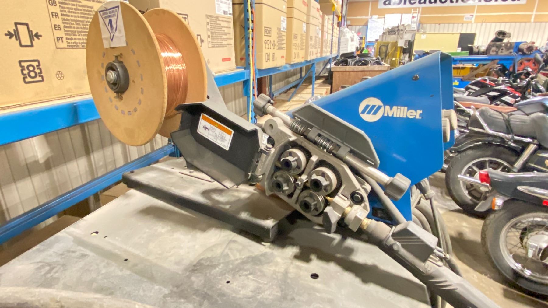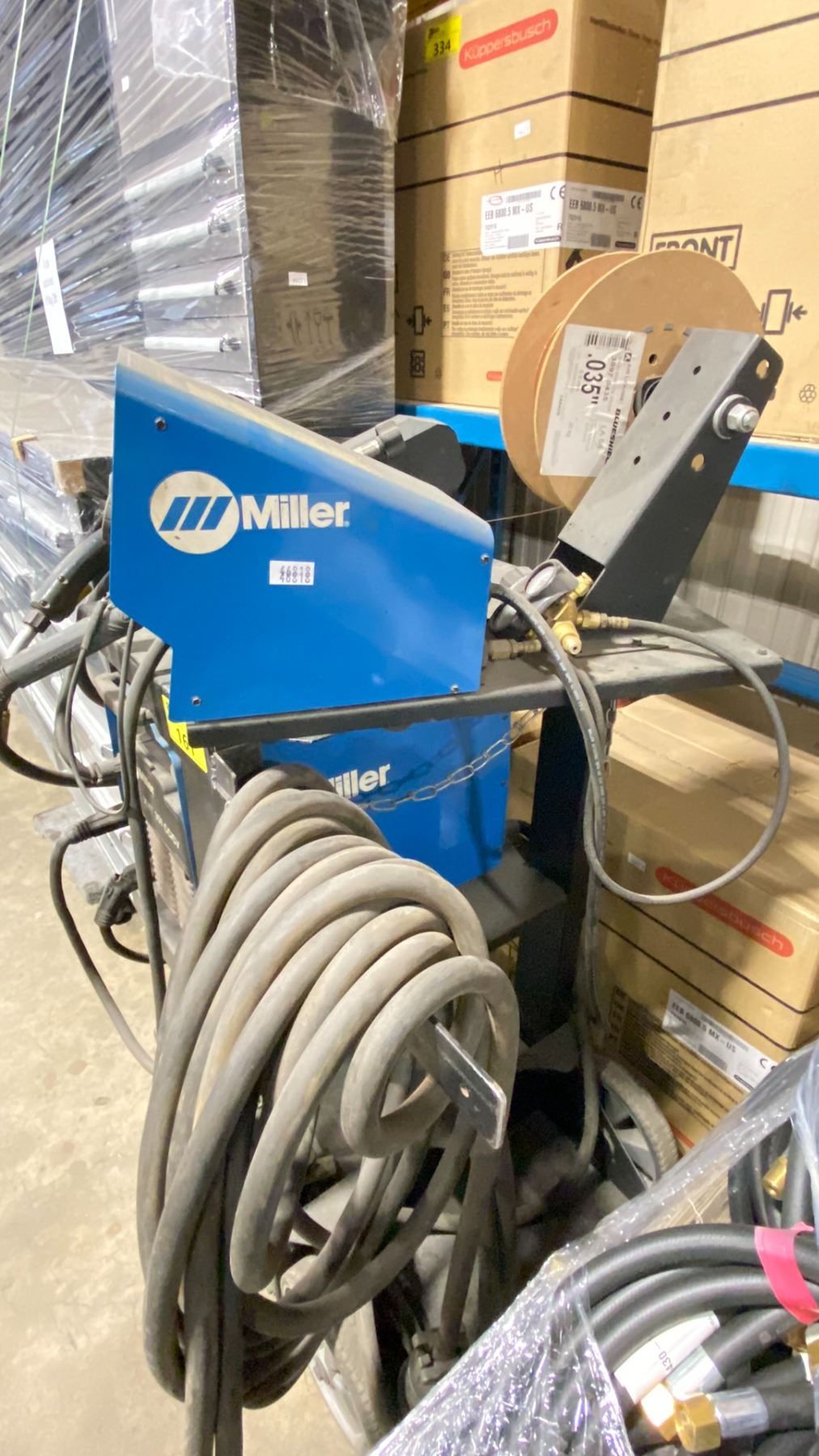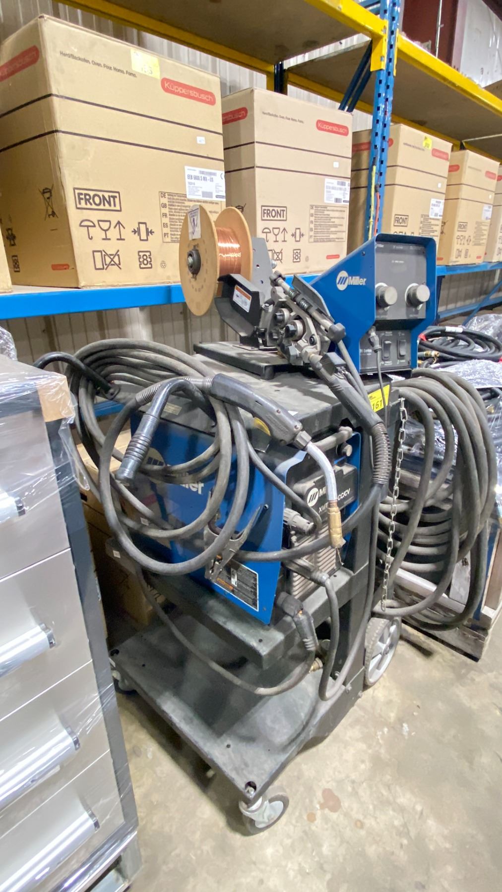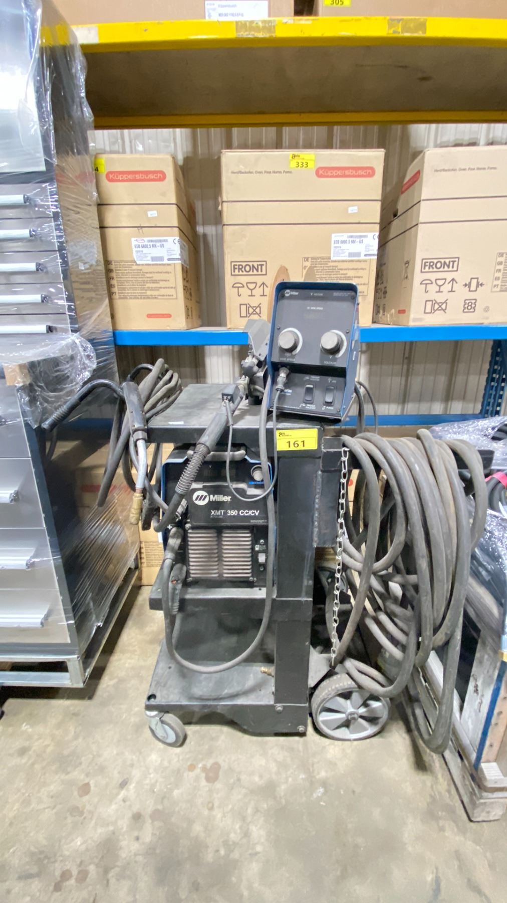 MILLER XMT 350 CC/CV MULTIPROCESS WELDER WITH MILLER 70 SERIES CONSTANT SPEED WIRE FEEDER ON MOBILE CART HAS GROUND CABLE, STINGER & POWER CABLE