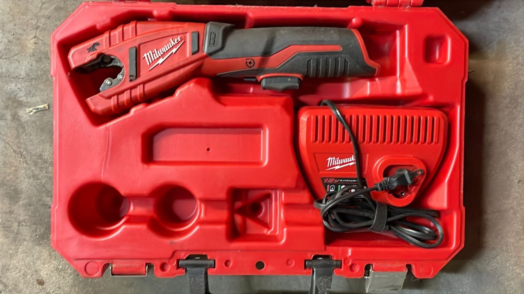 MILWAUKEE COPPER TUBING CUTTER WITH CHARGER *NO BATTERY* IN A HARD TRANSPORT CASE