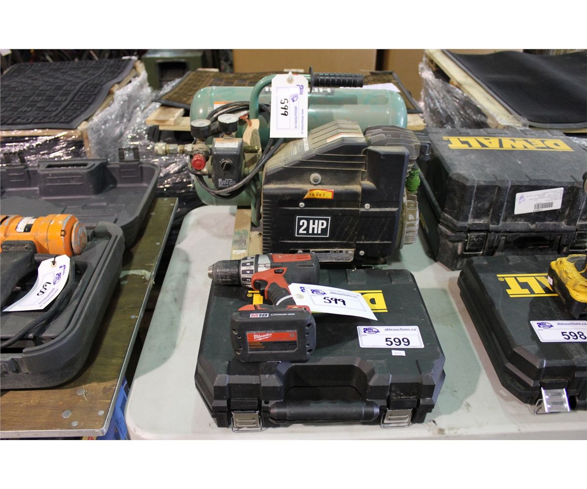 MILWAUKEE CORDLESS DRILL, DEWALT 20V DRILL AND HITACHI 2HP COMPRESSOR