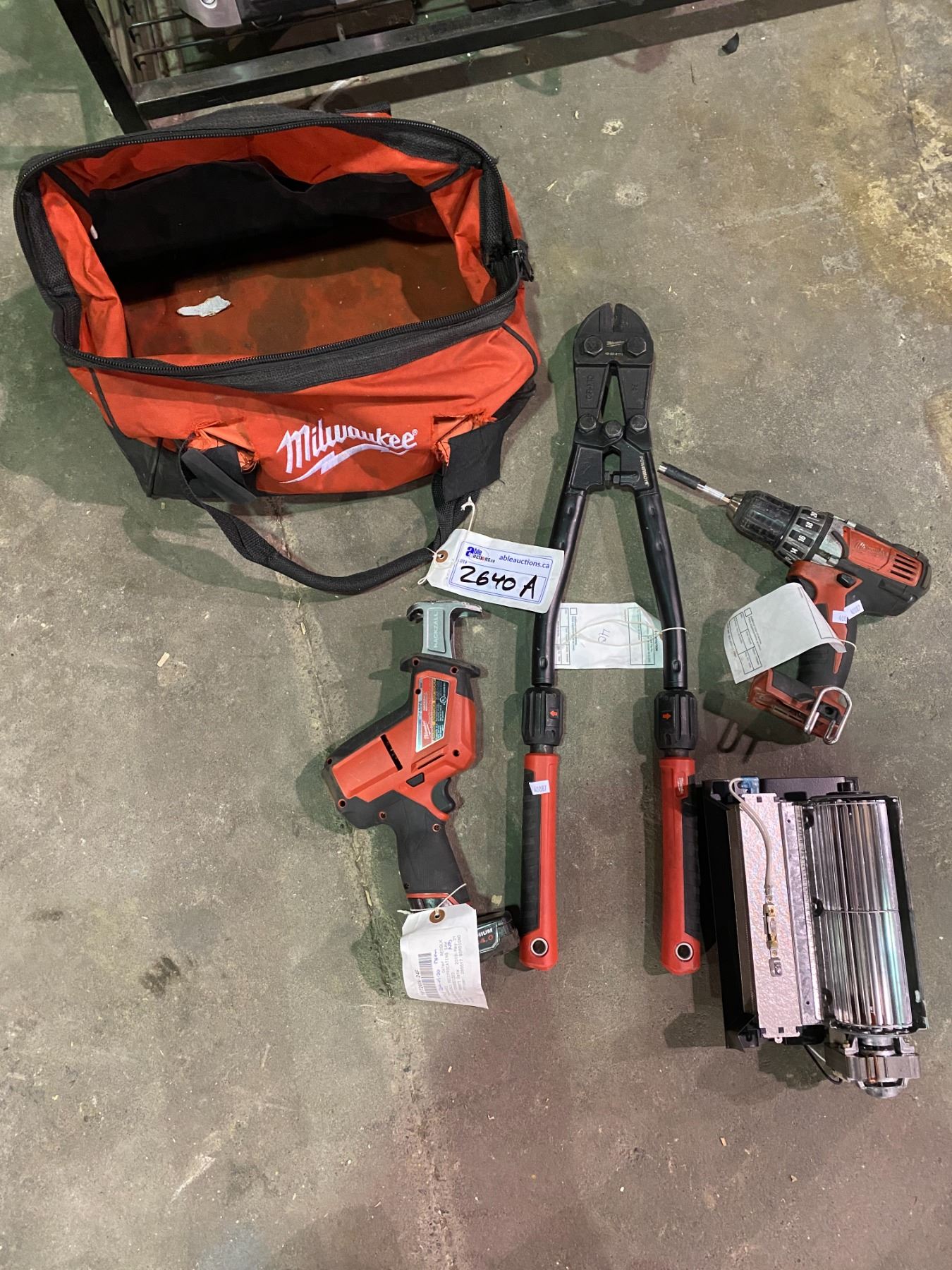 MILWAUKEE CORDLESS DRILL, HACKZALL, BOLT CUTTERS, TOOL BAG & MORE