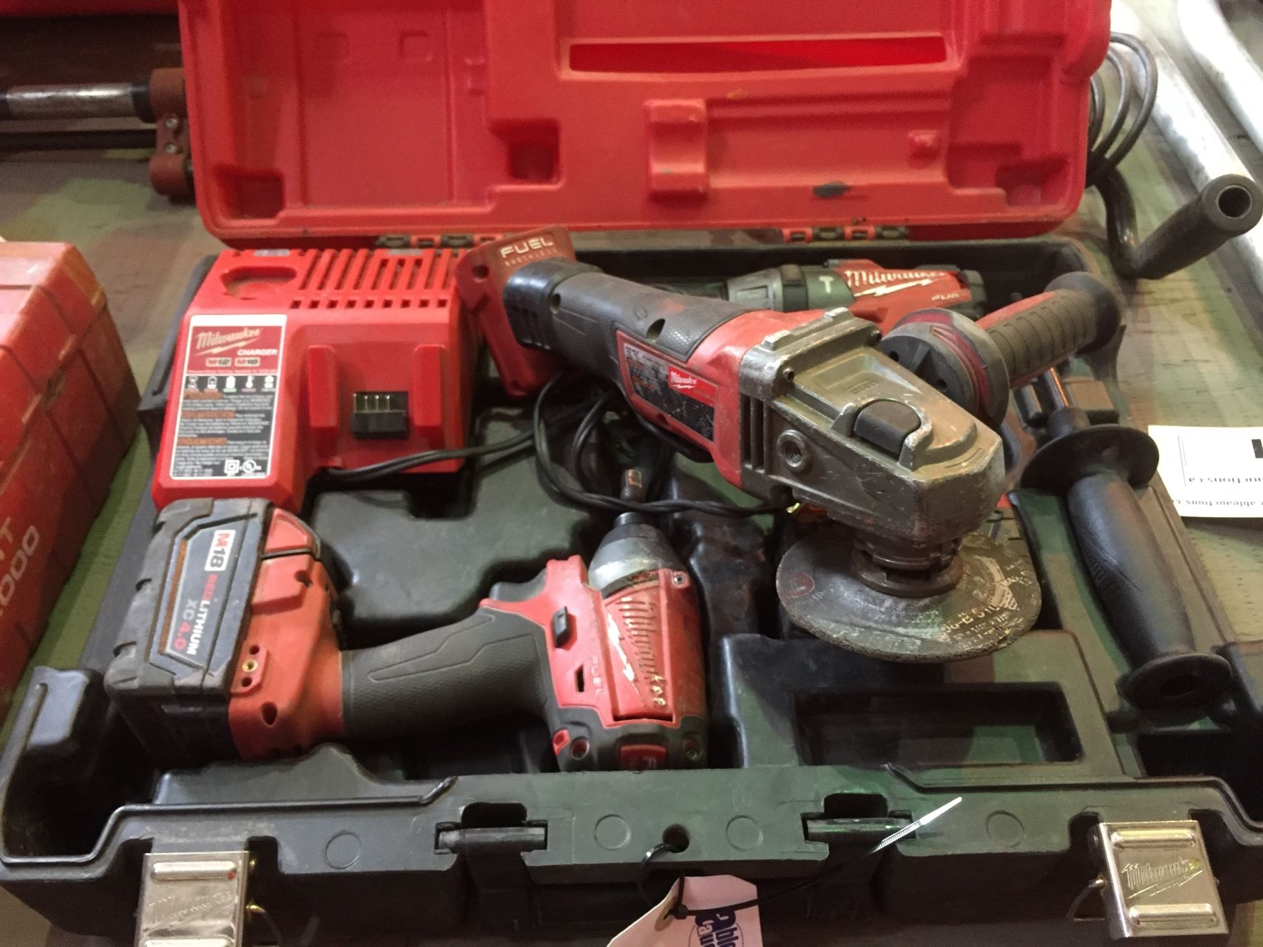 MILWAUKEE CORDLESS TOOL SET WITH 2 DRILLS, GRINDER, CHARGER AND CASE