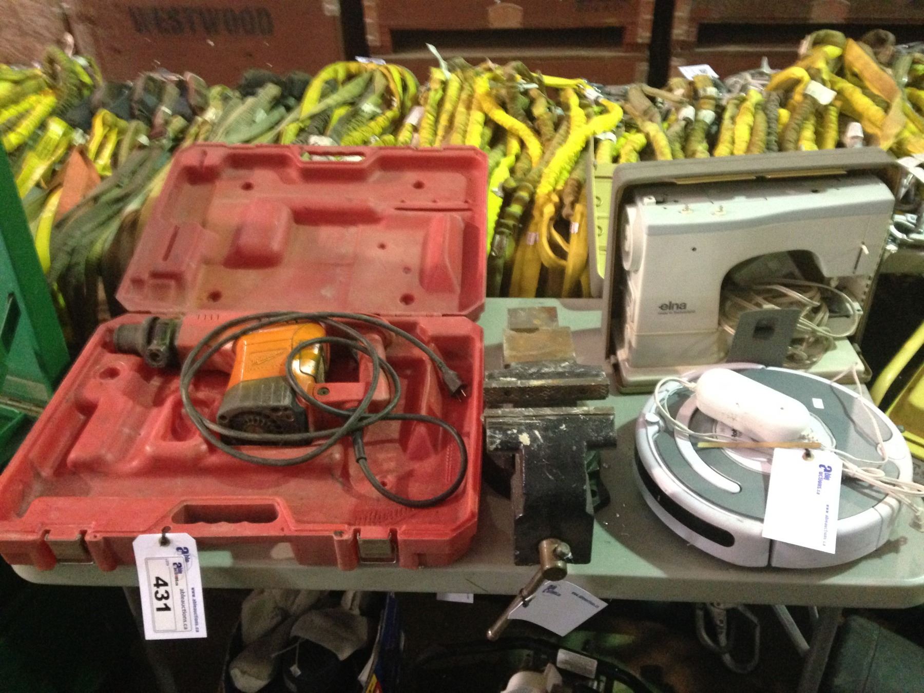 MILWAUKEE HEAVY DUTY ELECTRIC JACK HAMMER, BENCH VISE, SEWING MACHINE & ROOMBA VACUUM
