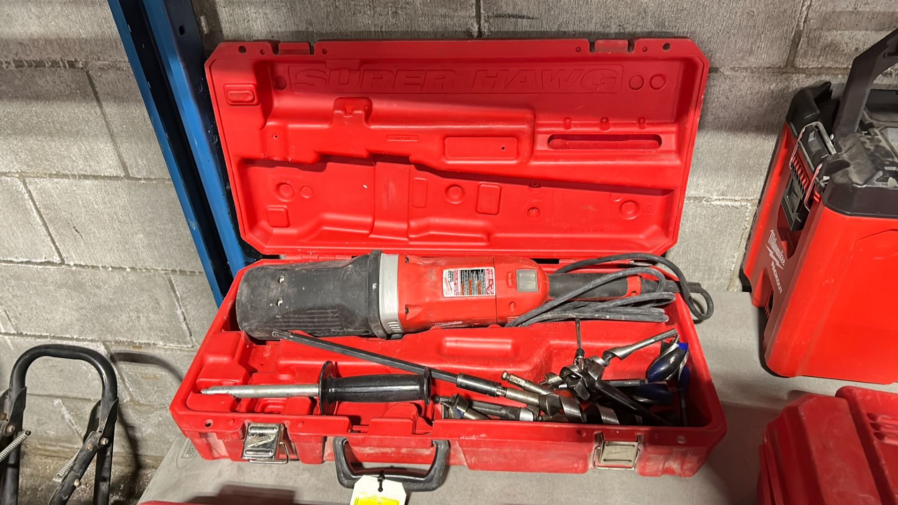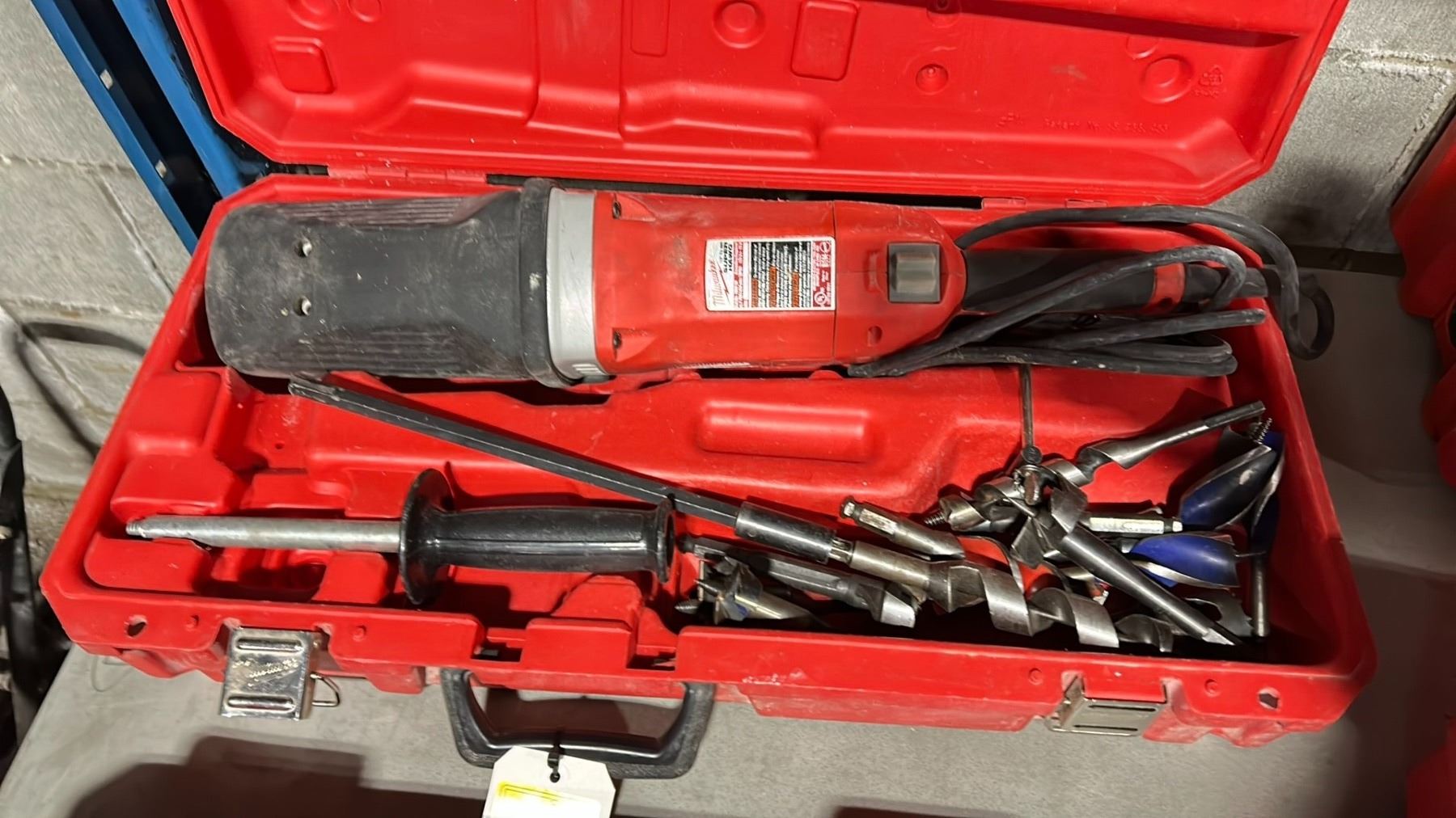 MILWAUKEE INDUSTRIAL ELECTRIC 1/2" SUPER HAWG ANGLE DRILL IN HARD TRANSPORT CASE WITH ASSORTED BITS