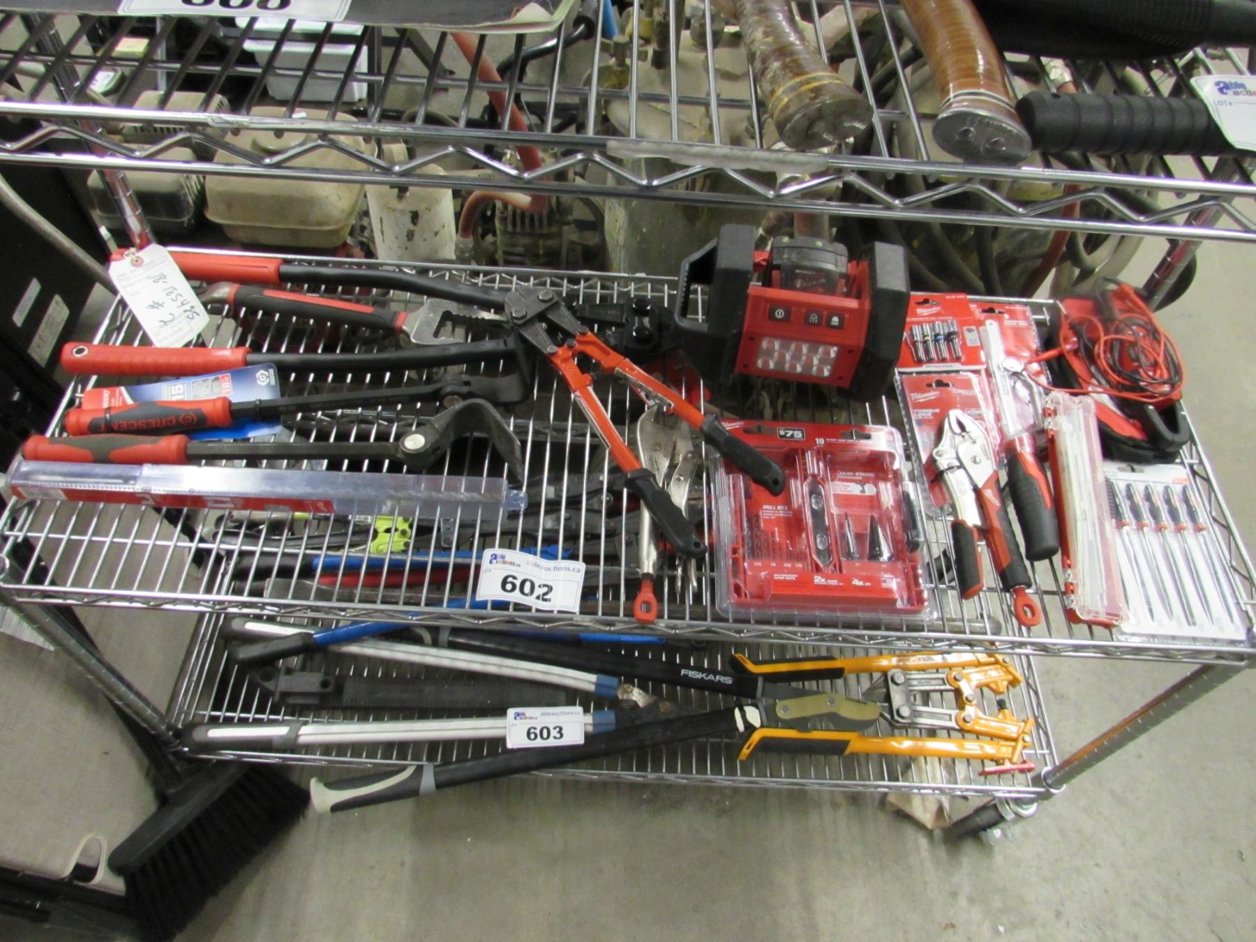 MILWAUKEE LIGHT WITH BATTERY, PRY BARS, CUTTERS, MILWAUKEE TORQUE LOCK TOOL, MILWAUKEE IMPACT MAGNETIC NUT DRIVERS, FILE SET, SAWZALL SAW BLADES, ELECTRICAL TESTER, ETC