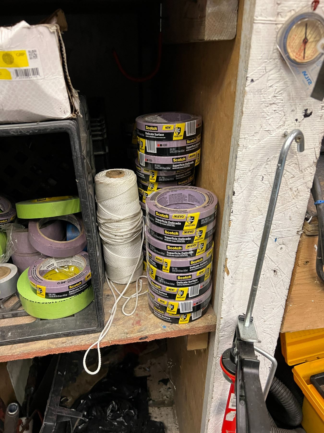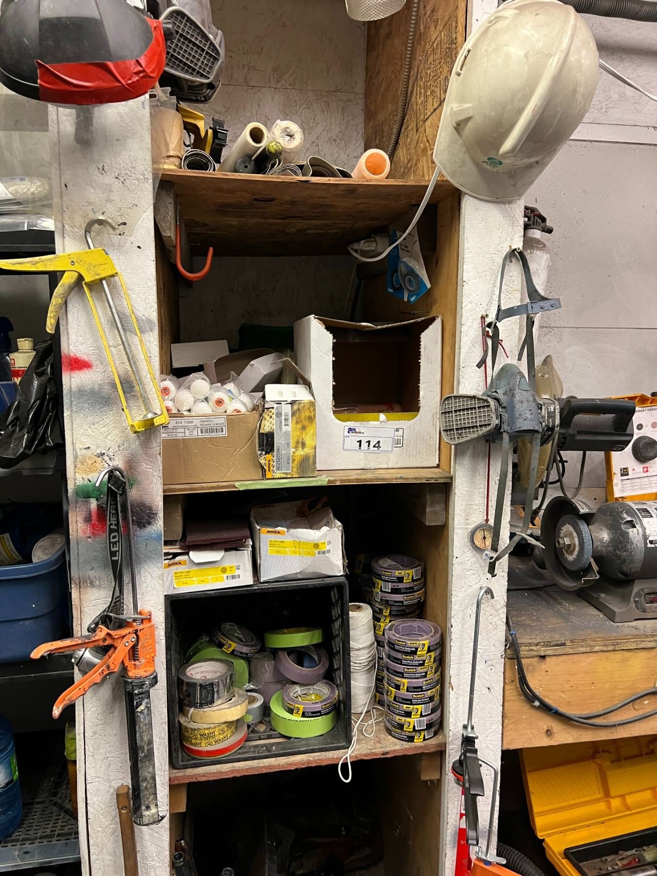 MISCELLANEOUS PAINTING TAPE, ROLLERS, ETC IN SHELF CUBBY