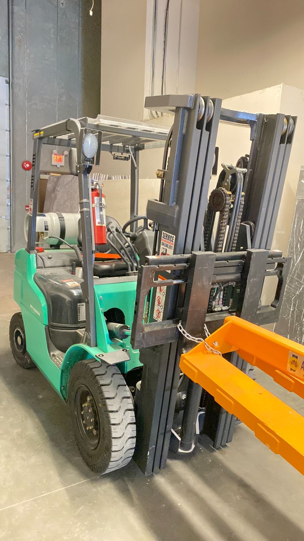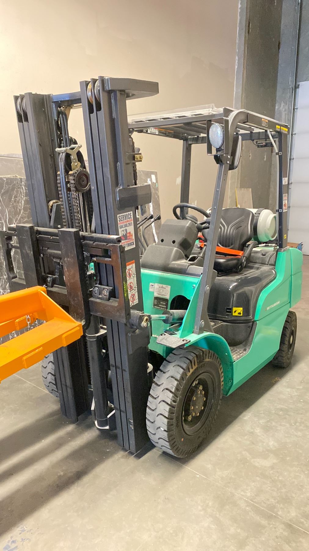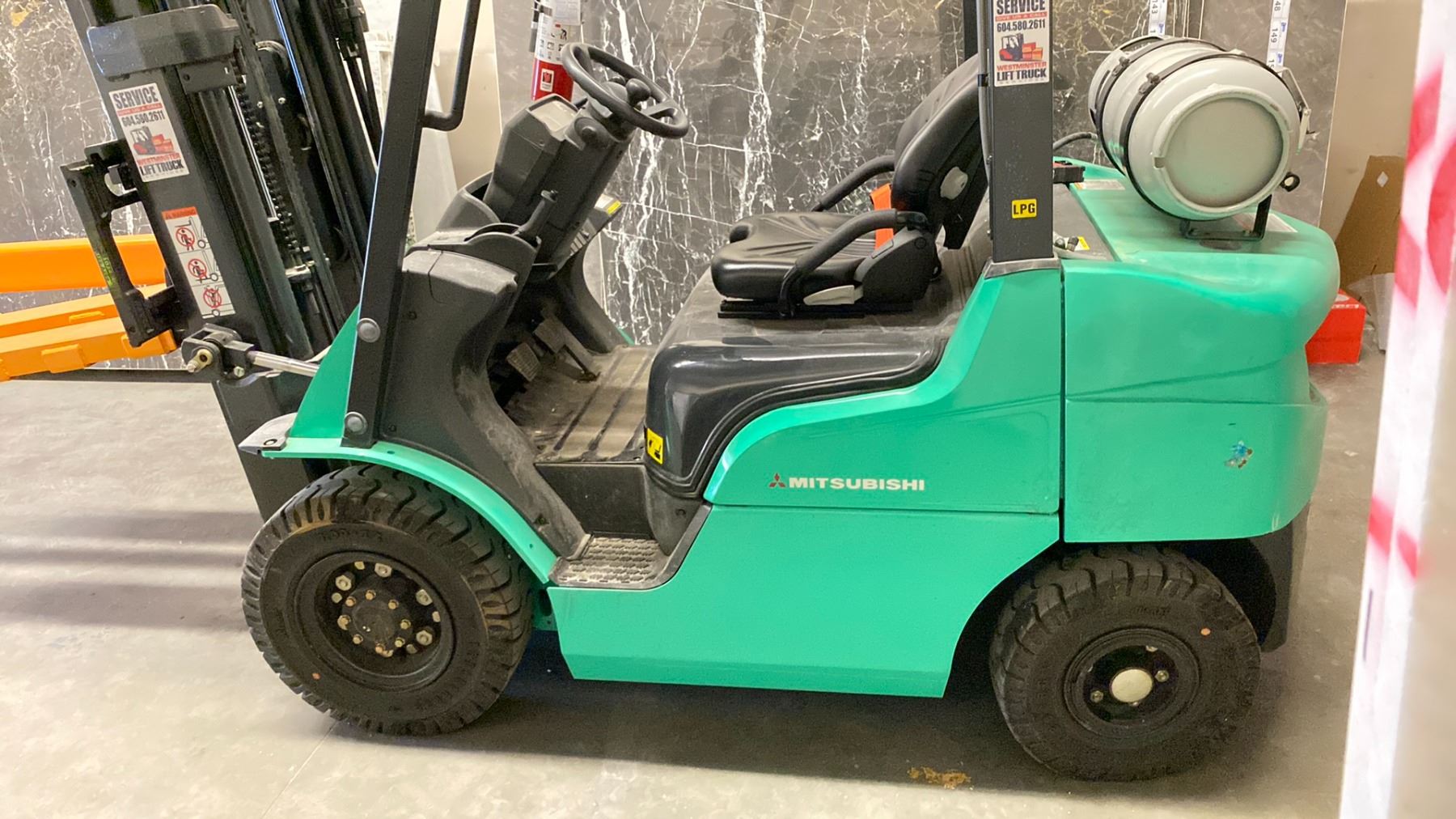 MITSUBISHI MODEL FG25N PROPANE FORKLIFT - 4500LBS. CAPACITY, 48" FORKS, SOLID TIRES, 3 STAGE BOOM, MAXIMUM FORK HEIGHT 188" COMES WITH 1 TANK **LAST DAY PICKUP AFTER 3PM**