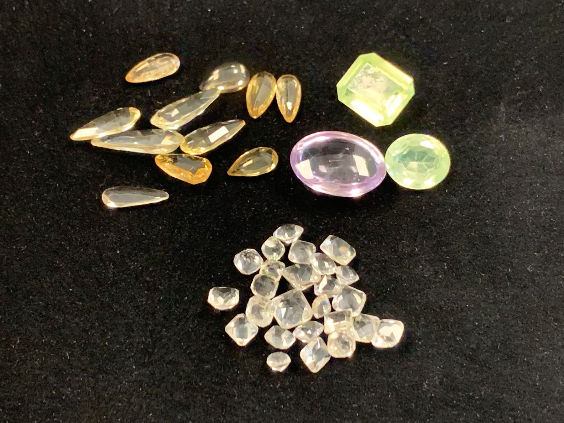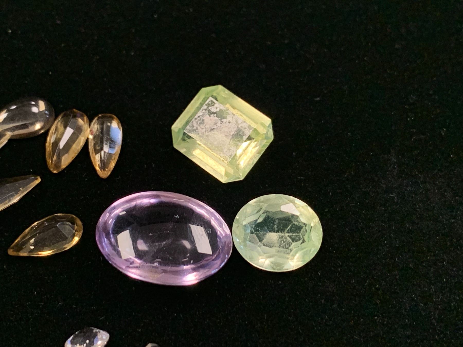 MIXED GEMSTONES, INCLUDING: 11 TEARDROP CITRINE, EMERALD CUT PALE CITRINE, LAB GROWN OVAL SPINEL, DEEP CUT SQUARE CLEAR CITRINE, & PALE OVAL AMETHYST.