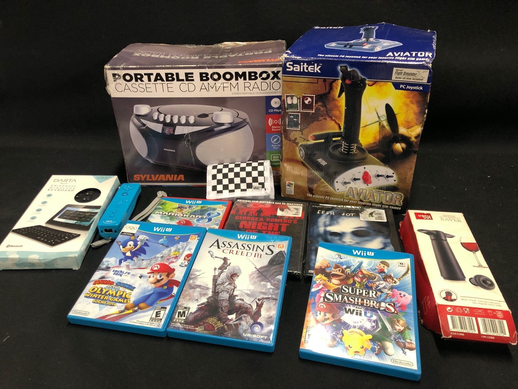 MIXED ITEMS INC. FLIGHT SIMULATOR JOY STICK, CD PLAYER, WIRELESS KEYBOARD, DVDS/GAMES AND MORE