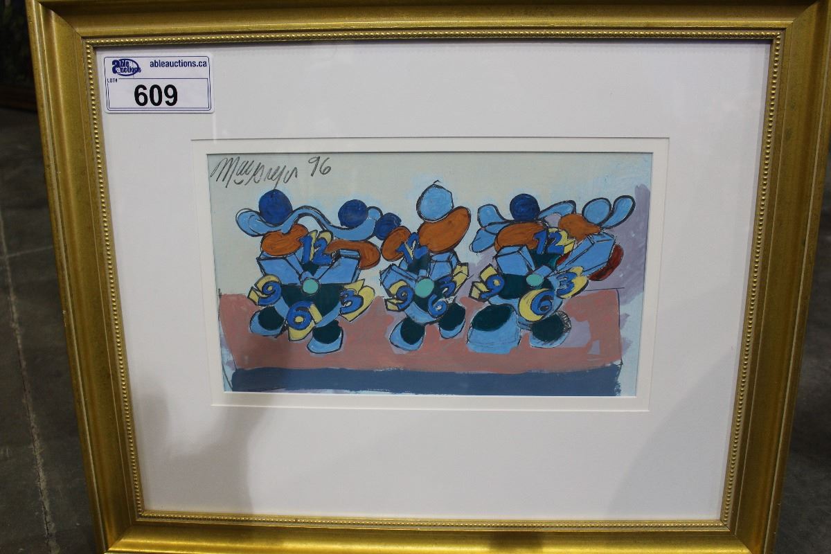 MIXED MEDIA ON PAPER "WALKING CLOCKS" SIGNED MACGREGOR (JOHN), 96. APPRAISAL ON REVERSE. LISTED ARTIST
