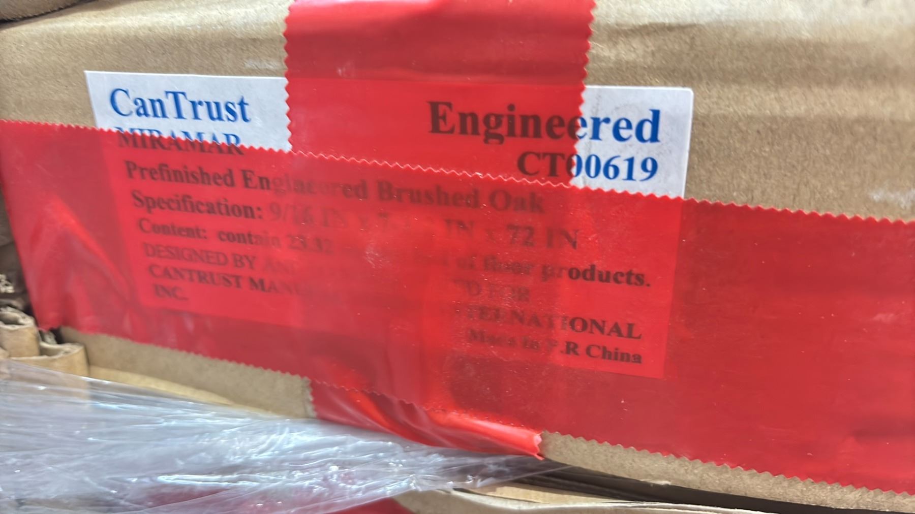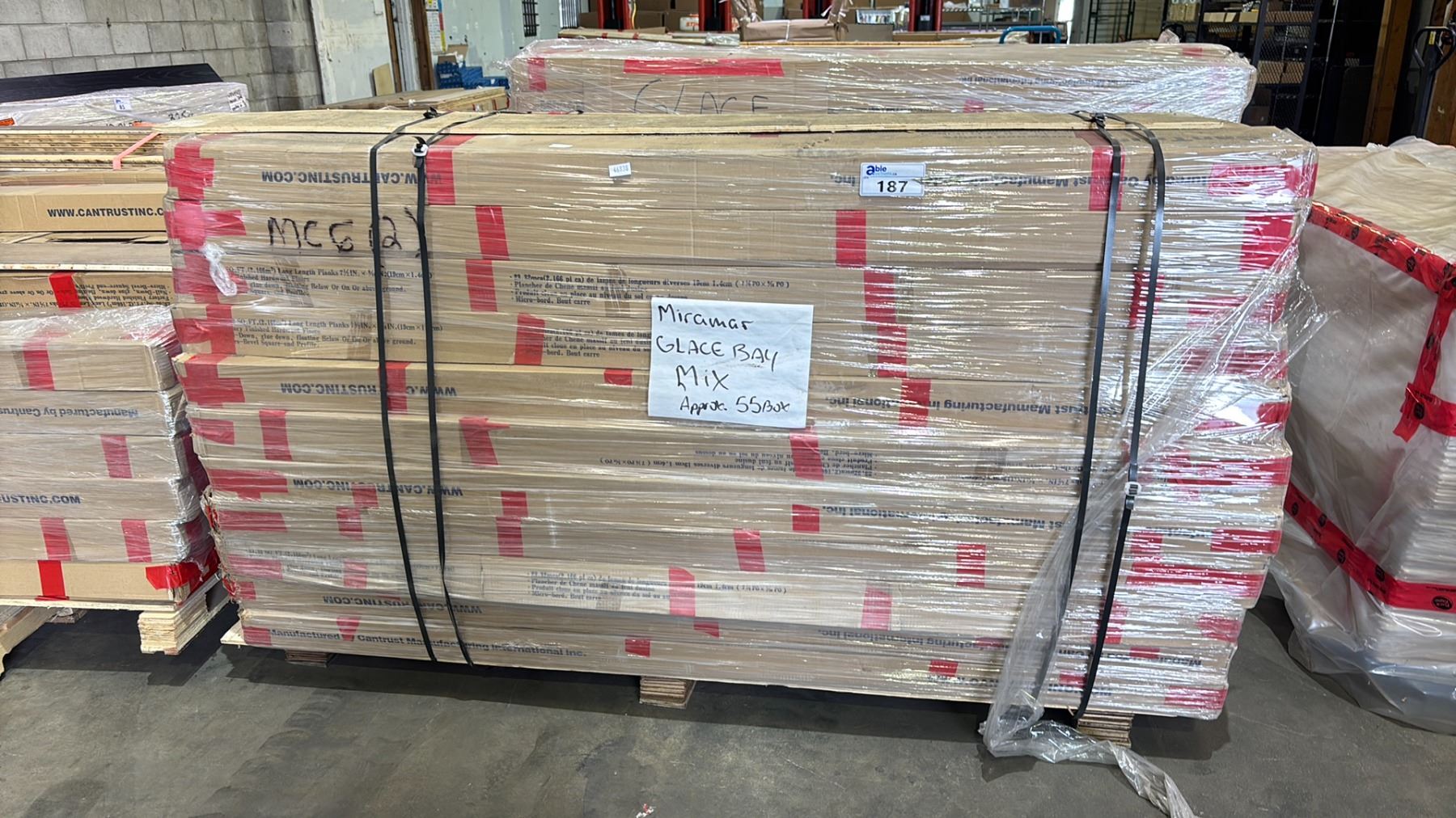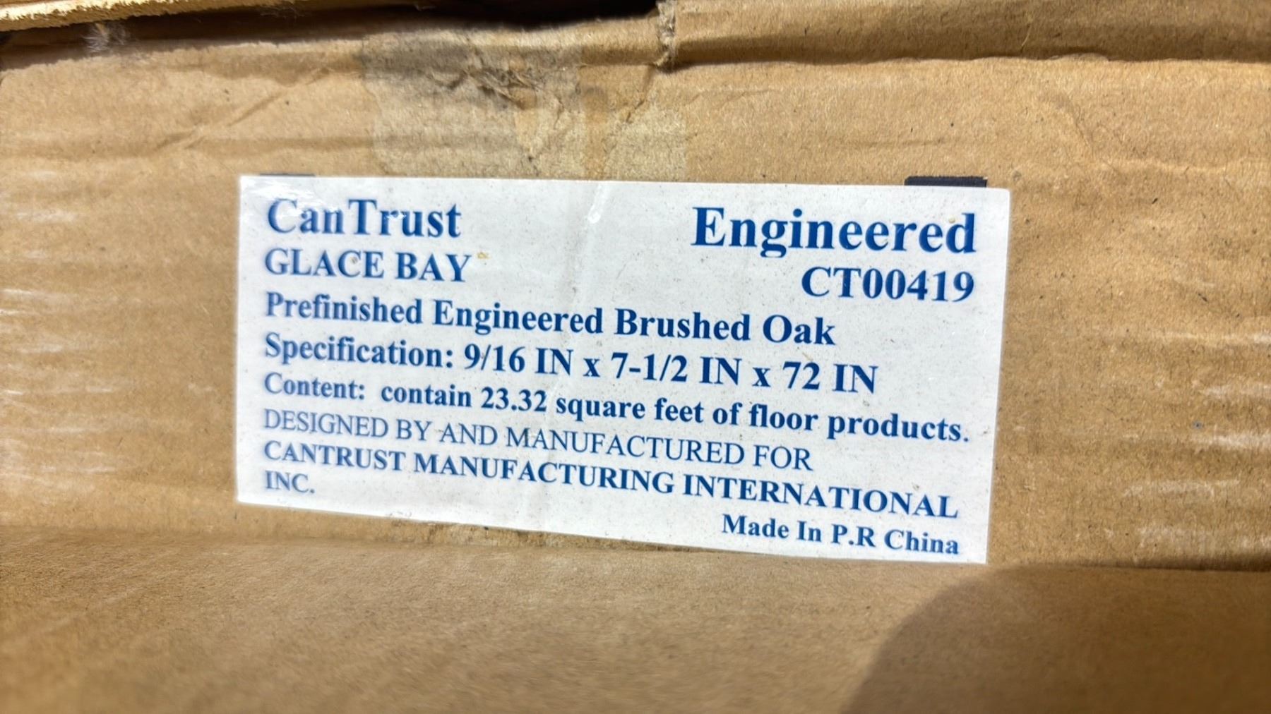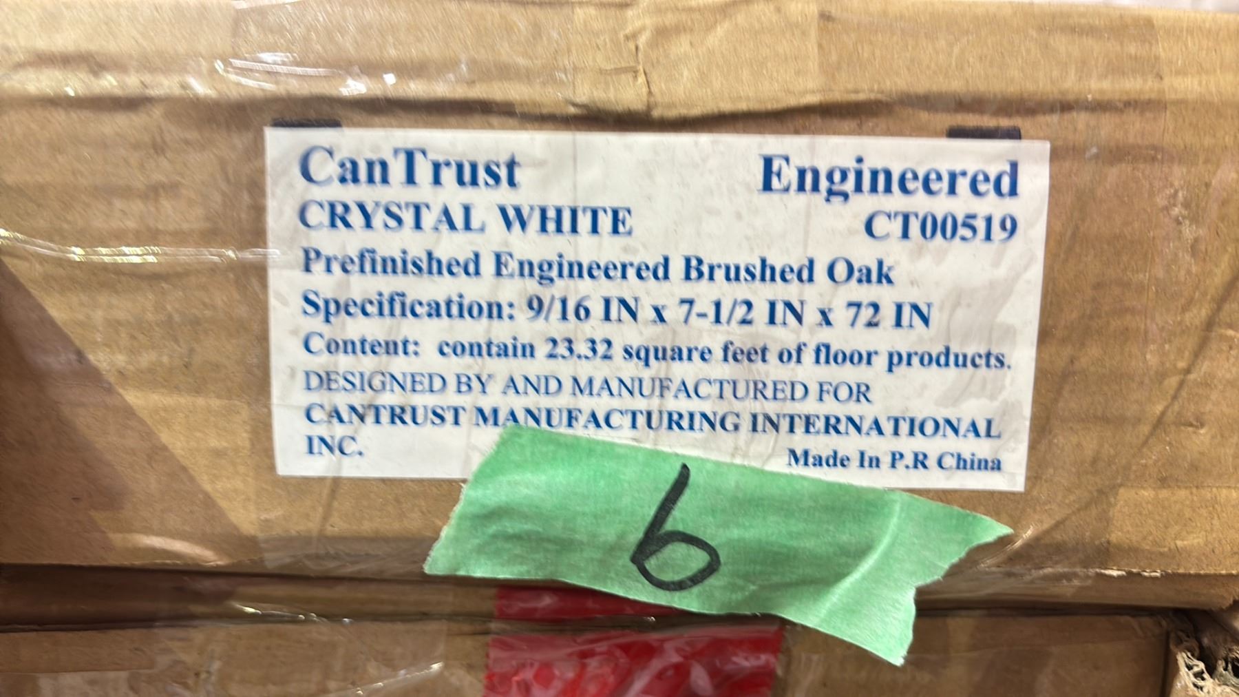 MIXED PALLET OF CAN TRUST CRYSTAL WHITE, MIRAMAR & GLACE BAY PREFINISHED ENGINEERED BRUSHED OAK HARDWOOD FLOORING APPROX. 23.32 SQ FT PER BOX 45 BOXES 1,049.40 SQ FT TOTAL *MUST TAKE ALL ON PALLET/REQUIRES SHRINK WRAP*