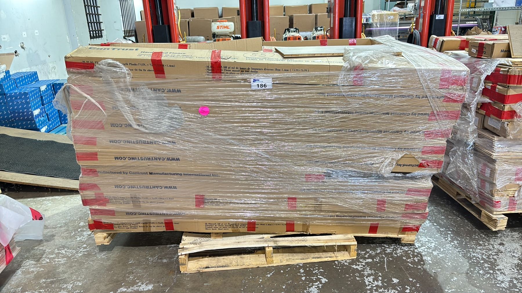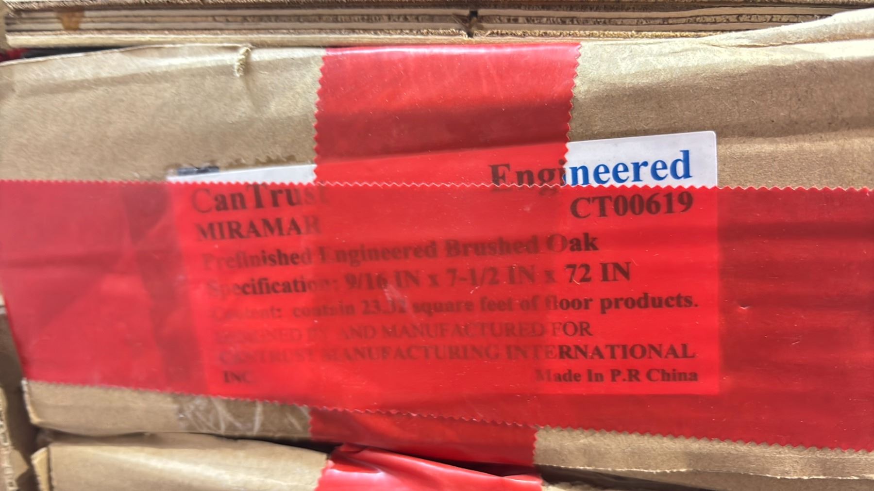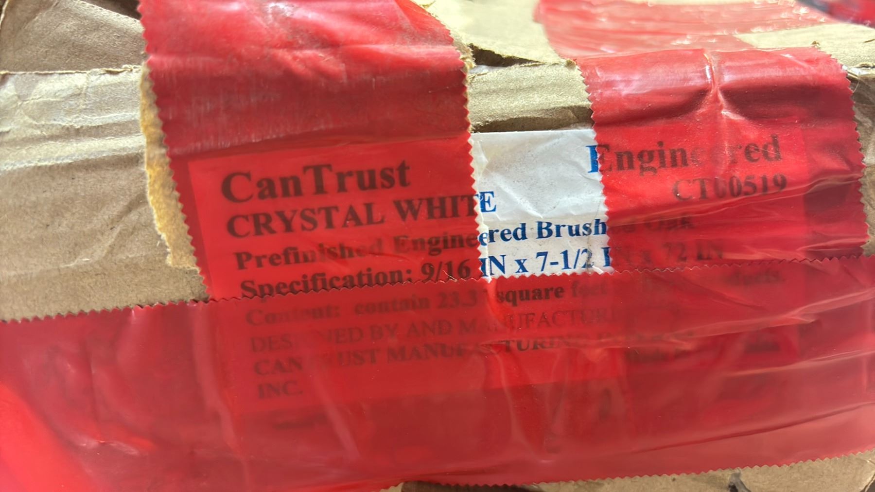 MIXED PALLET OF CAN TRUST CRYSTAL WHITE & MIRAMAR PREFINISHED ENGINEERED BRUSHED OAK HARDWOOD FLOORING APPROX. 23.32 SQ FT PER BOX 50 BOXES 1,166 SQ FT TOTAL *MUST TAKE ALL ON PALLET/REQUIRES SHRINK WRAP*