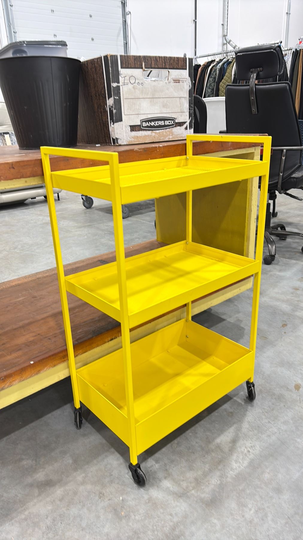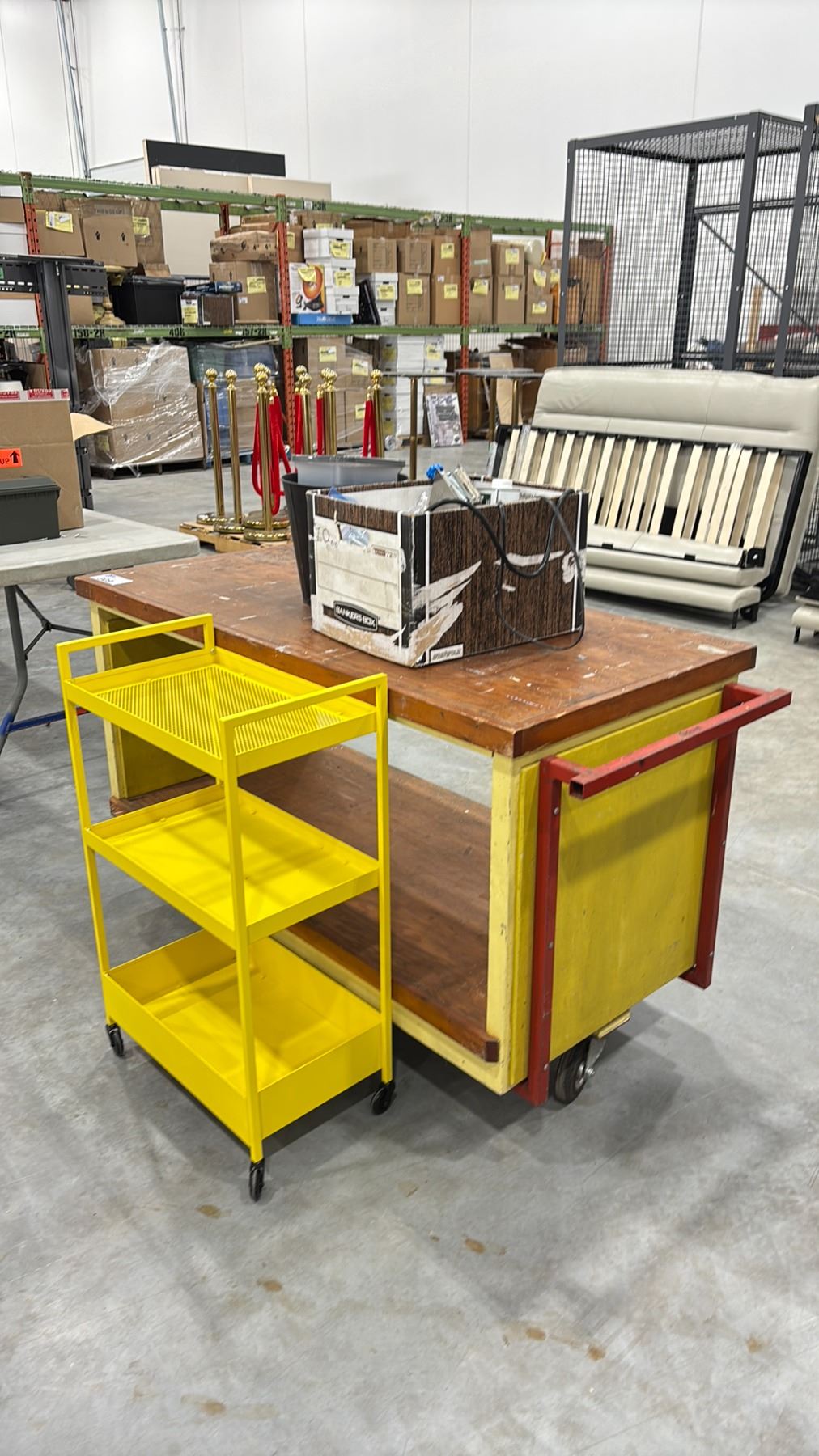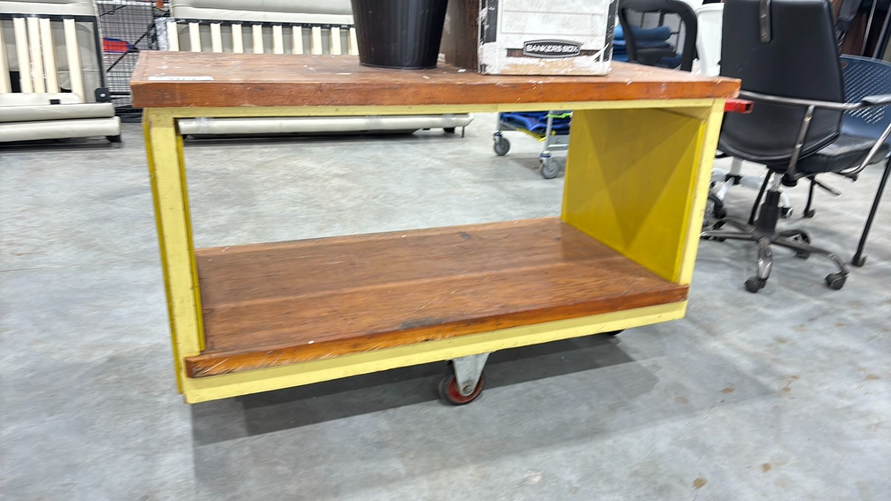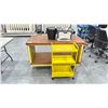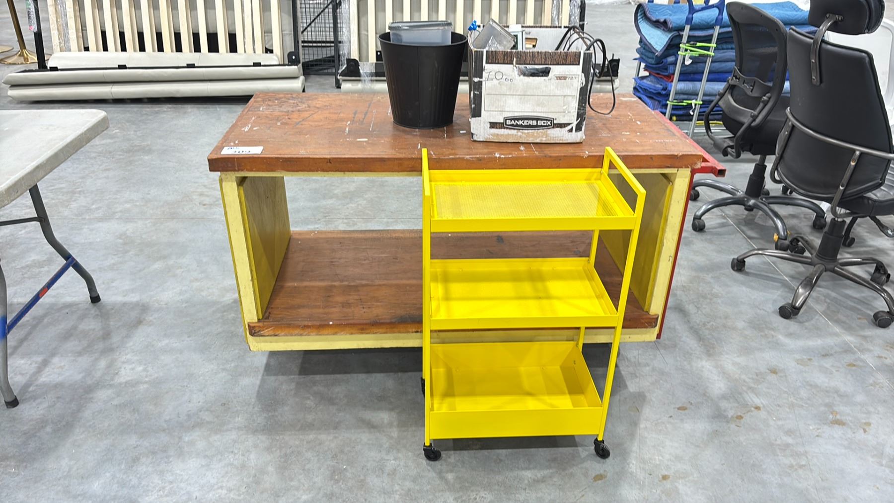 MOBILE 56"W D 25"D X 32"H WOODEN WORK BENCH, YELLOW MOBILE UTILITY CART & MORE