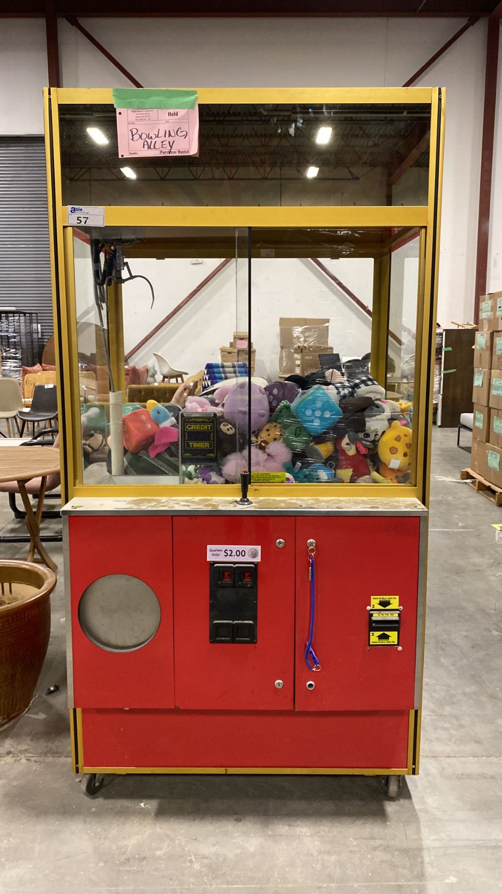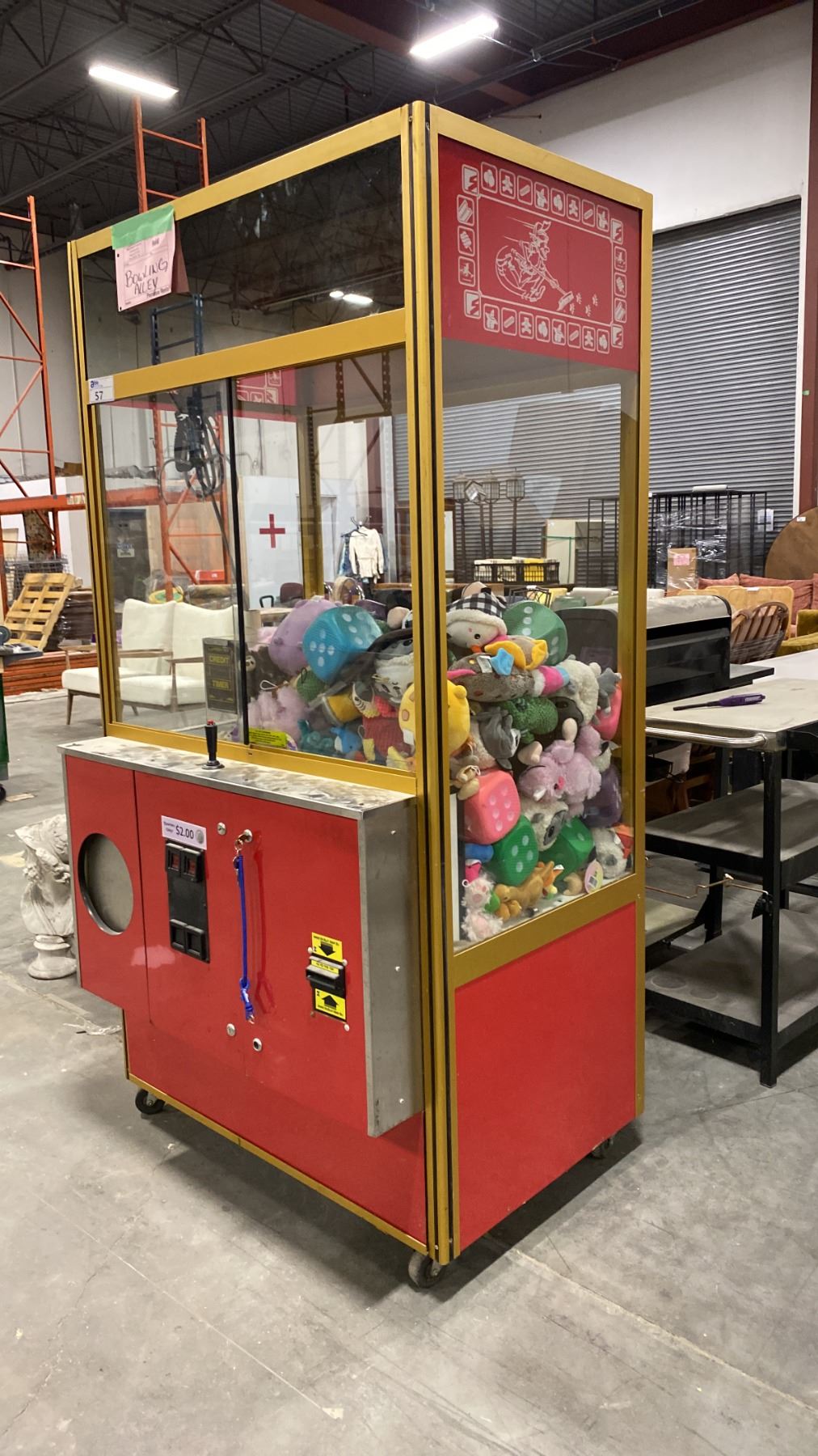 MOBILE COMMERCIAL CLAW MACHINE WITH ASSORTED STUFFIES & KEY *WORKING CONDITION UNKNOWN*