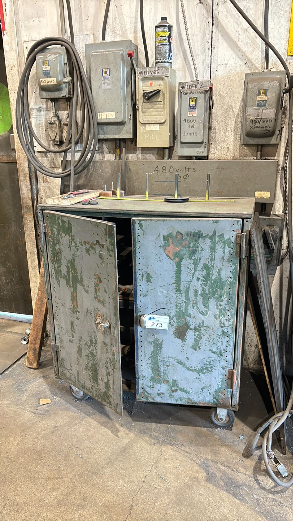 MOBILE METAL 2 DOOR WORK CABINET (APPROX.3FT ACROSS X 3 1/2FT HIGH X 1 1/2FT DEEP