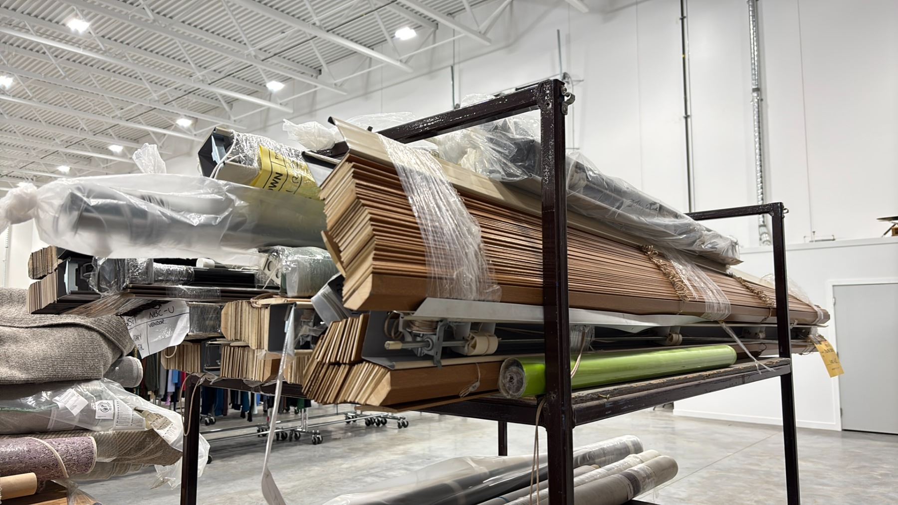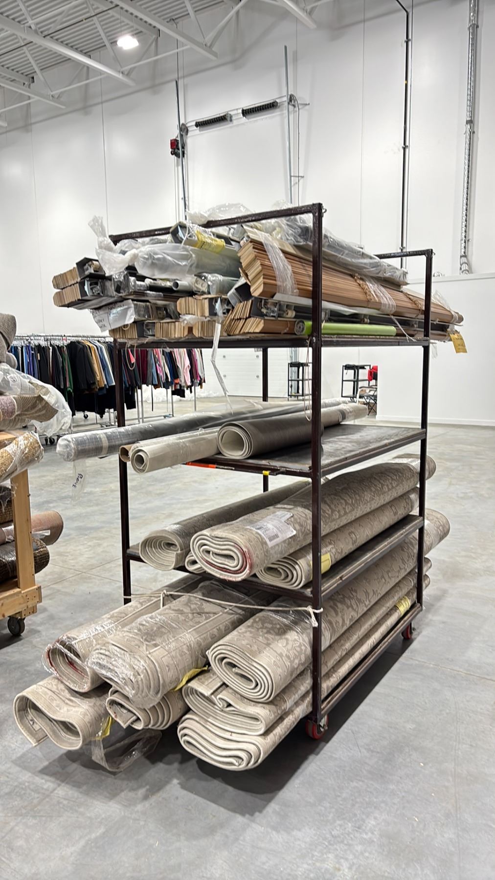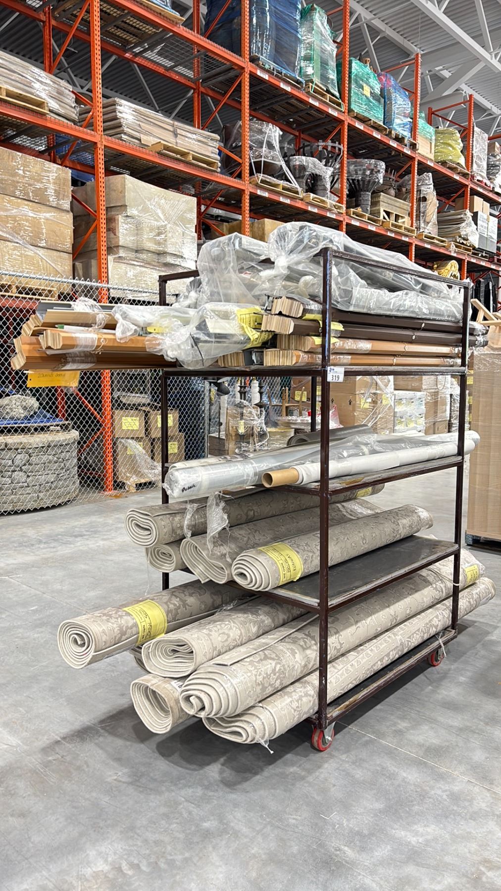 MOBILE METAL PRODUCT CART WITH ROLLS OF AREA RUGS & ASSORTED WOODEN BLINDS - PRODUCT CARTS MEASURES APPROX. 45.5"W 36"D X 74"H