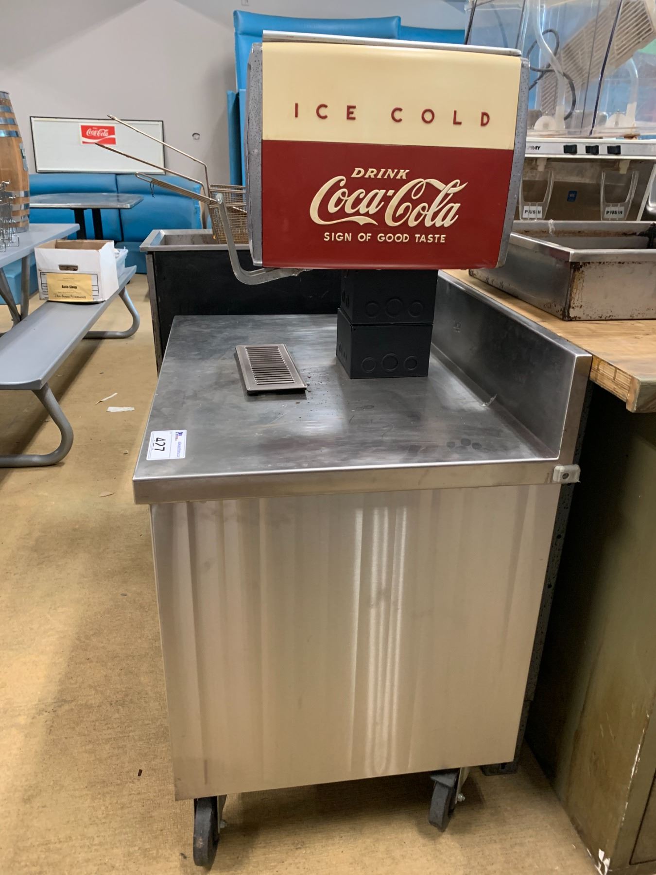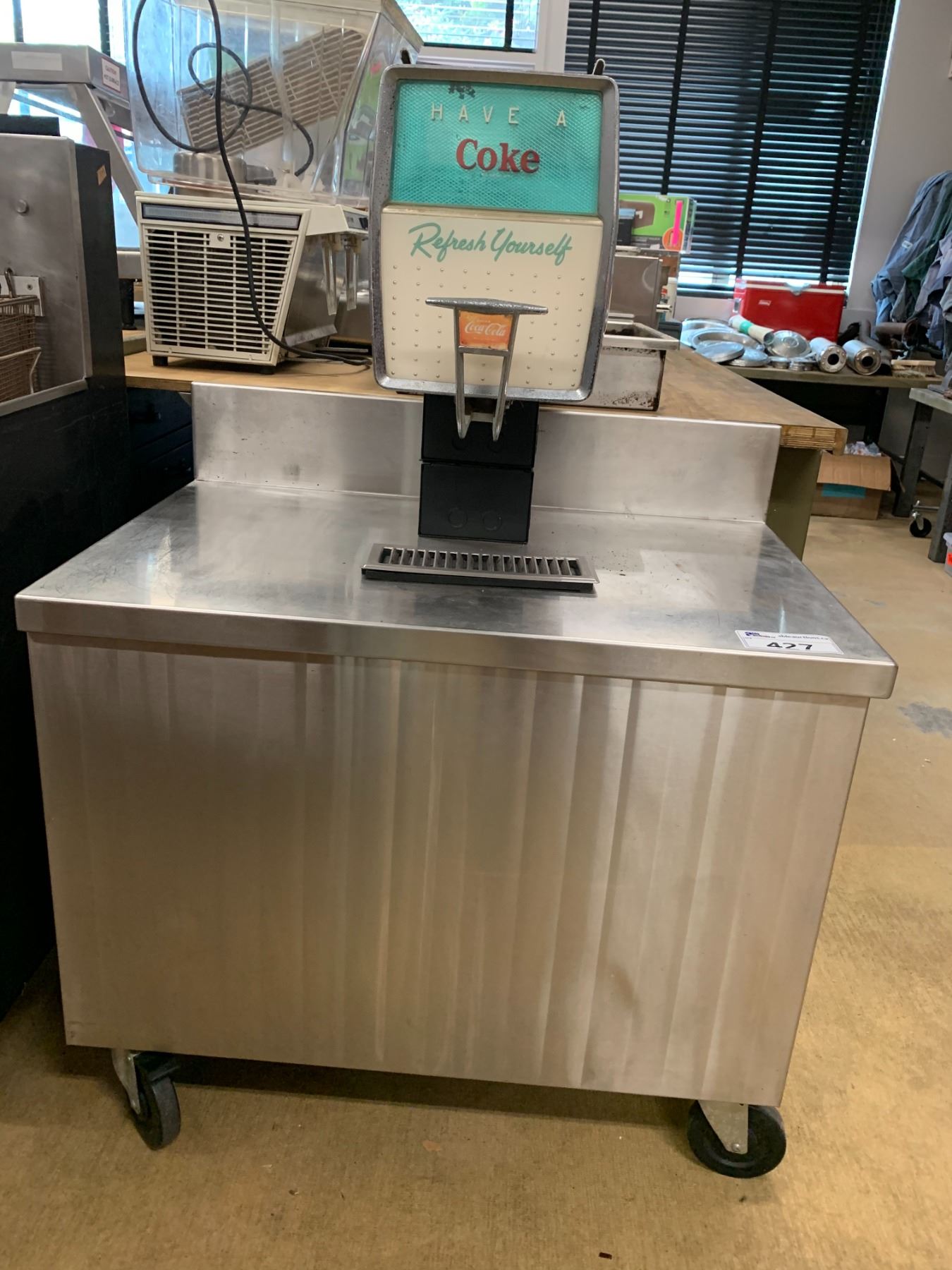 MOBILE STAINLESS STEEL PREP TABLE WITH VINTAGE COCA COLA DISPENSER PROP APPROX 36"X36"X24"